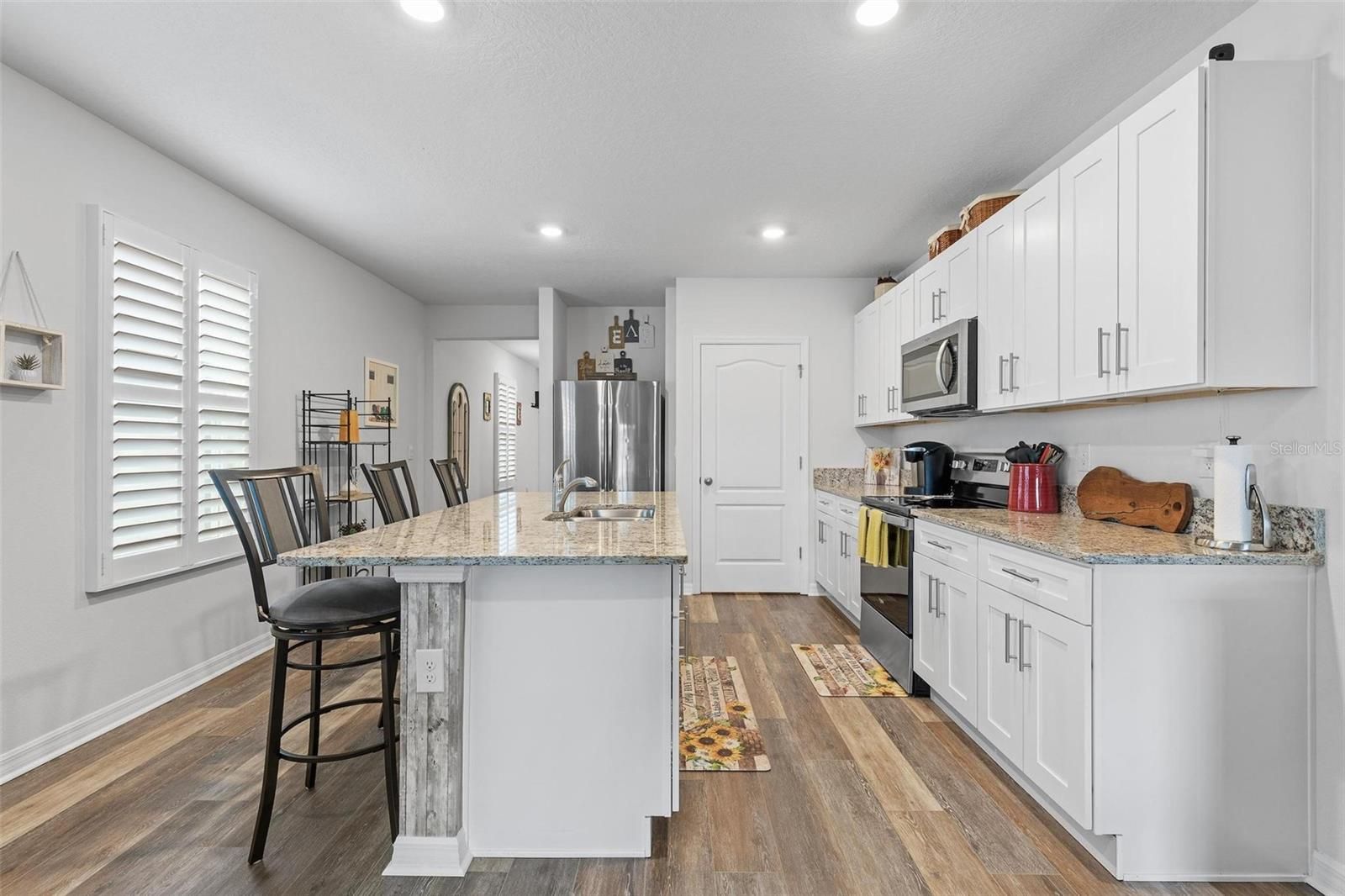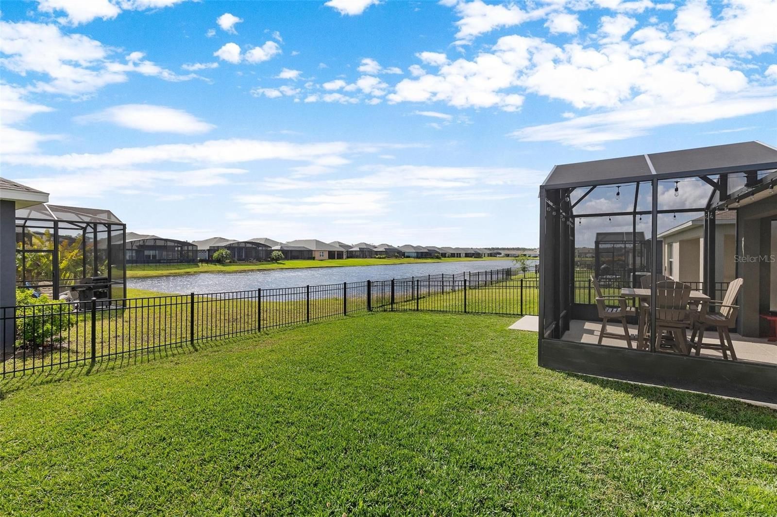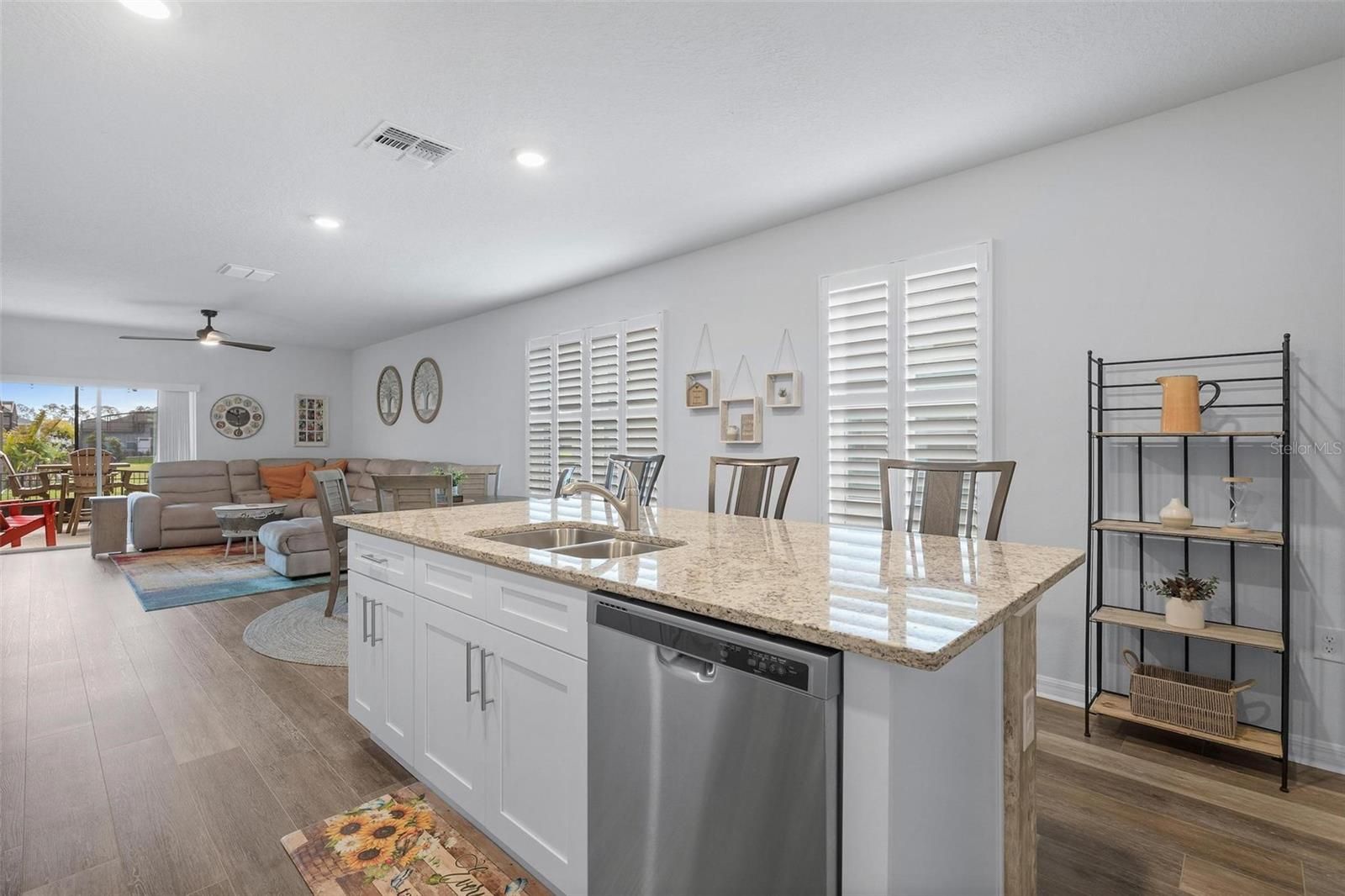 Tucked within The Palms of Venetian Bay, this beautifully crafted 2022 residence blends modern design with an easy, inviting flow, ideal for everyday living and memorable gatherings. From moment you arrive, the charming courtyard-style porch, sealed paver driveway, and impeccably maintained landscaping set a tone of understated elegance. Inside, the open-concept layout unfolds with a natural sense of light and space. The kitchen stands at the heart of the home, showcasing soft-close ivory shaker cabinetry, gleaming granite countertops and a suite of stainless steel appliances, equally suited for casual mornings or hosting with ease. Wide-plank luxury vinyl flooring elevates the main living areas with a refined touch, while plush carpeting in the bedrooms creates a warm, restful retreat. Thoughtful enhancements are found throughout, including custom plantation shutters, a dedicated laundry room, and an upgraded garage door opener. The primary suite offers a peaceful escape, where tranquil pond views greet you each morning. A generous walk-in closet and a well-appointed en-suite bath, complete with dual vanities, a spacious linen closet, private water closet and a glass-enclosed shower updated in 2023, add comfort and style. The guest bath mirrors this attention to detail with granite surfaces and its own upgraded glass shower enclosure. Outdoors, a cathedral-style screened patio invites you to relax or entertain, enhanced by a built-in dog door added in 2023. Beyond, the aluminum-fenced backyard, with dual gates, opens to picturesque lake views, creating a serene backdrop for quiet evenings or weekend gatherings. Life in Venetian Bay extends far beyond your front door. From the vibrant Town Center’s shops and dining to the championship 18-hole golf course, spa services, and an array of parks, trails, and tennis and pickleball courts, the community offers a dynamic yet relaxed lifestyle. Ideally near the clubhouse and just nine miles from the beach, this home captures the essence of comfort, convenience and Florida living at its finest, with ample green space ready for your future private pool.