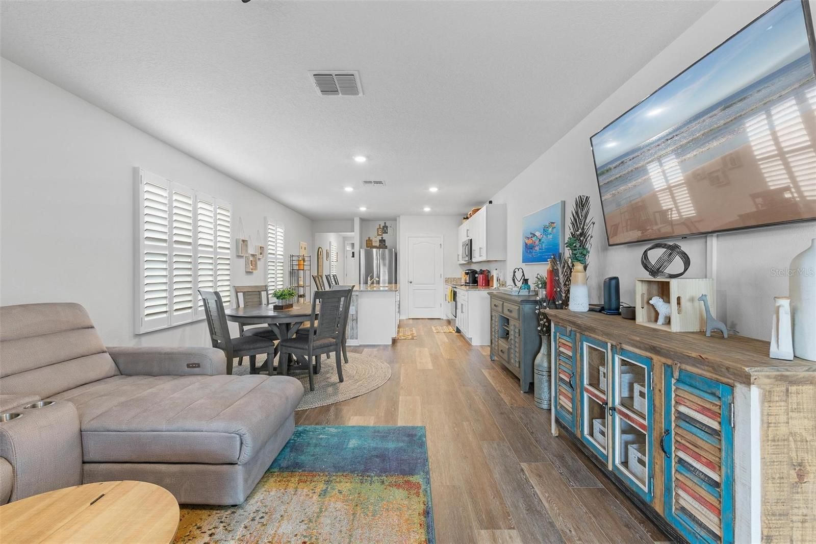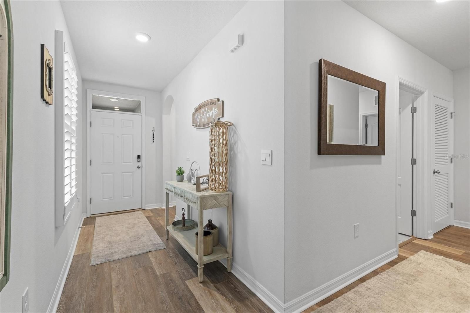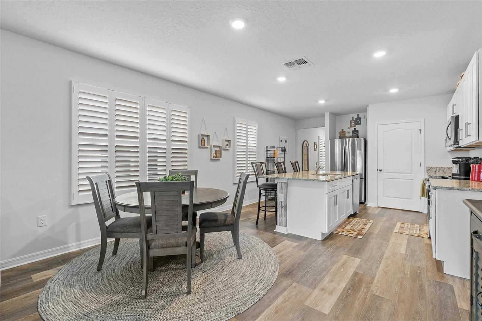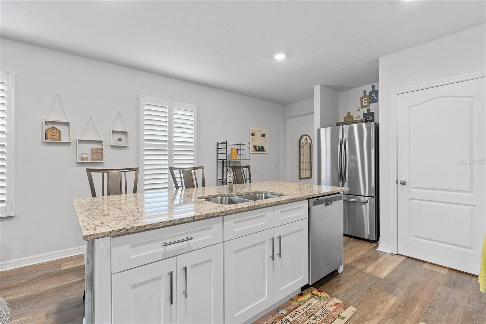 Tucked within The Palms of Venetian Bay, this beautifully crafted 2022 residence blends modern design with an easy, inviting flow, ideal for everyday living and memorable gatherings. From moment you arrive, the charming courtyard-style porch, sealed paver driveway, and impeccably maintained landscaping set a tone of understated elegance. Inside, the open-concept layout unfolds with a natural sense of light and space. The kitchen stands at the heart of the home, showcasing soft-close ivory shaker cabinetry, gleaming granite countertops and a suite of stainless steel appliances, equally suited for casual mornings or hosting with ease. Wide-plank luxury vinyl flooring elevates the main living areas with a refined touch, while plush carpeting in the bedrooms creates a warm, restful retreat. Thoughtful enhancements are found throughout, including custom plantation shutters, a dedicated laundry room, and an upgraded garage door opener. The primary suite offers a peaceful escape, where tranquil pond views greet you each morning. A generous walk-in closet and a well-appointed en-suite bath, complete with dual vanities, a spacious linen closet, private water closet and a glass-enclosed shower updated in 2023, add comfort and style. The guest bath mirrors this attention to detail with granite surfaces and its own upgraded glass shower enclosure. Outdoors, a cathedral-style screened patio invites you to relax or entertain, enhanced by a built-in dog door added in 2023. Beyond, the aluminum-fenced backyard, with dual gates, opens to picturesque lake views, creating a serene backdrop for quiet evenings or weekend gatherings. Life in Venetian Bay extends far beyond your front door. From the vibrant Town Center’s shops and dining to the championship 18-hole golf course, spa services, and an array of parks, trails, and tennis and pickleball courts, the community offers a dynamic yet relaxed lifestyle. Ideally near the clubhouse and just nine miles from the beach, this home captures the essence of comfort, convenience and Florida living at its finest, with ample green space ready for your future private pool.