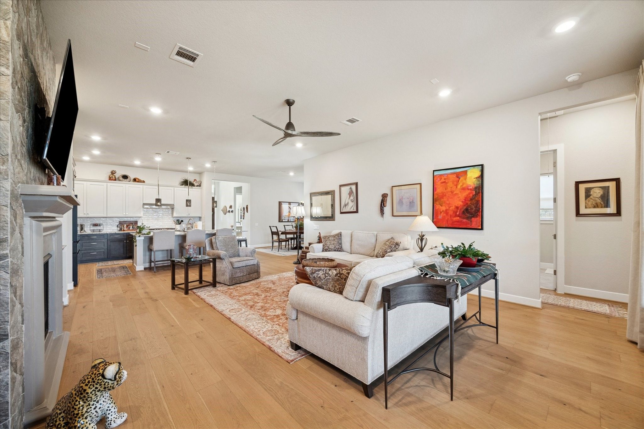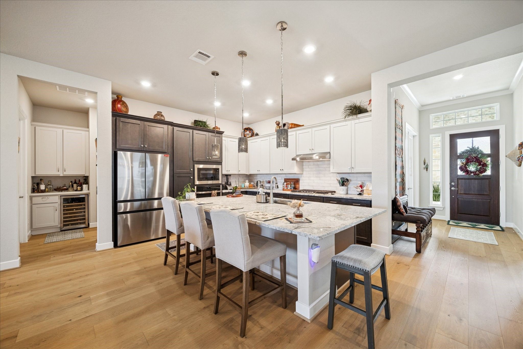 Total WOW factor home which current homeowner has added over $150,000 in upgrades. If you are looking for true quality in a 55+gated community this home has so much to offer! Upgrades include rebuilt Kitchen with light gray and charcoal soft close cabinets, waterfall edge exotic granite, butlers pantry with wine fridge, pendant lights, huge island and open to Large Family Room with Fireplace. Home features both a Study and flex room which is currently being used as a Game Room, 3 bedrooms, upgraded bathrooms with recent full tiled shower in secondary bathroom, stunning Primary suite with many extras which include custom closets, beautful neutral hard wood floors in entire home. Outside there has been added a screened in patio, outdoor kitchen with built in grill. The backyard is a delight with no grass, walking path, firepit, flower beds, rock gardens, fountain, simply stunning. Enjoy the many amenities this community offers with is adult only pool, clubhouse and pickle ball cts.