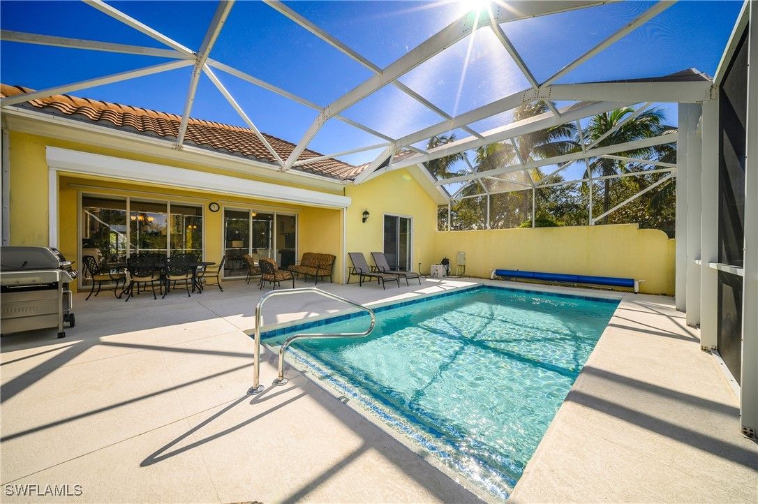 Butterflies are free to fly. Nestled in the back of Village Walk of Bonita across from our breathtaking Butterfly Gardens, you will find this immaculately kept home. This coveted OAKMONT Model with three bedrooms and a den/office is being sold fully furnished. The home is move in ready for those looking to escape the upcoming winter up North and in the Midwest . This is truly a must see property. Upon entering the home, you see right through the exterior glass sliding doors onto the Lanai sorting a newly resurfaced Pool and new pool pump. This is just one of the well maintained areas being sold with this home. Dining Al Fresco on the lanai is a special treat overlooking the pool and landscaped area. When all sliders are open, you experience indoor/outdoor living at its best. When inquiring about the Roof age, the answer is 5 Years, Air Conditioning 4 Years old. Plantation shutters are in all rooms. Stainless Steel Kitchen Aid appliances complement the white Kitchen cabinetry. For ease of mind, the home has Remote controlled Roll Down Hurricane Shutters on the front and back, and Accordion shutters on all remaining windows. Envision yourself living the Florida lifestyle you deserve in this serene setting. The community is well known for its abundance of clubs you can join, activities galore with onsite activities director, a Resort pool second to none with dining service poolside while mingling with other lay back residents. For the Sports enthusiast, you have access to tennis, pickleball, bocce, basketball, lap pool and large fitness center overlooking the lake; other amenities include Village Walk Bar and Grill, Library, Community Center , Gazebo, Bagel Shop, Hairdresser, Royal Scoop Ice Cream Shop, Car Wash. Recognized as one of the lowest HOA fees for what is included (even cable tv and xfinity wifi), you can't go wrong This is truly THE place to call home. Come explore for yourself. You will be happy you did.