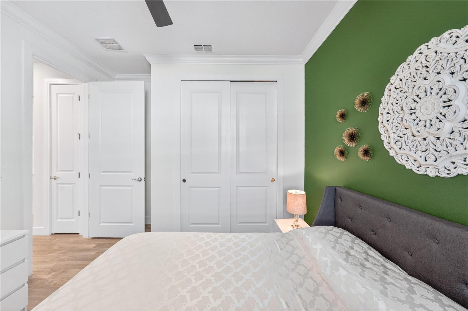 - Crown Molding, Eat-in Kitchen, In-Wall Pest Control, Kitchen/Family Room Combo, Open Floorplan, Main Level Primary, Stone Counters, Thermostat, Walk-In Closet(s)