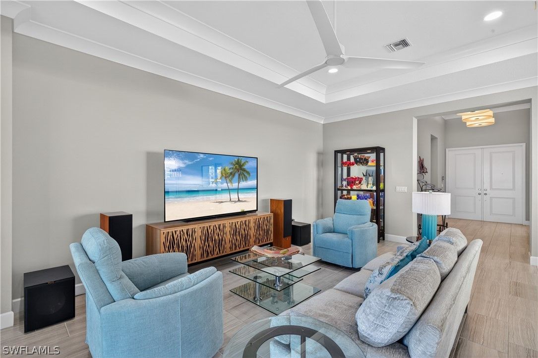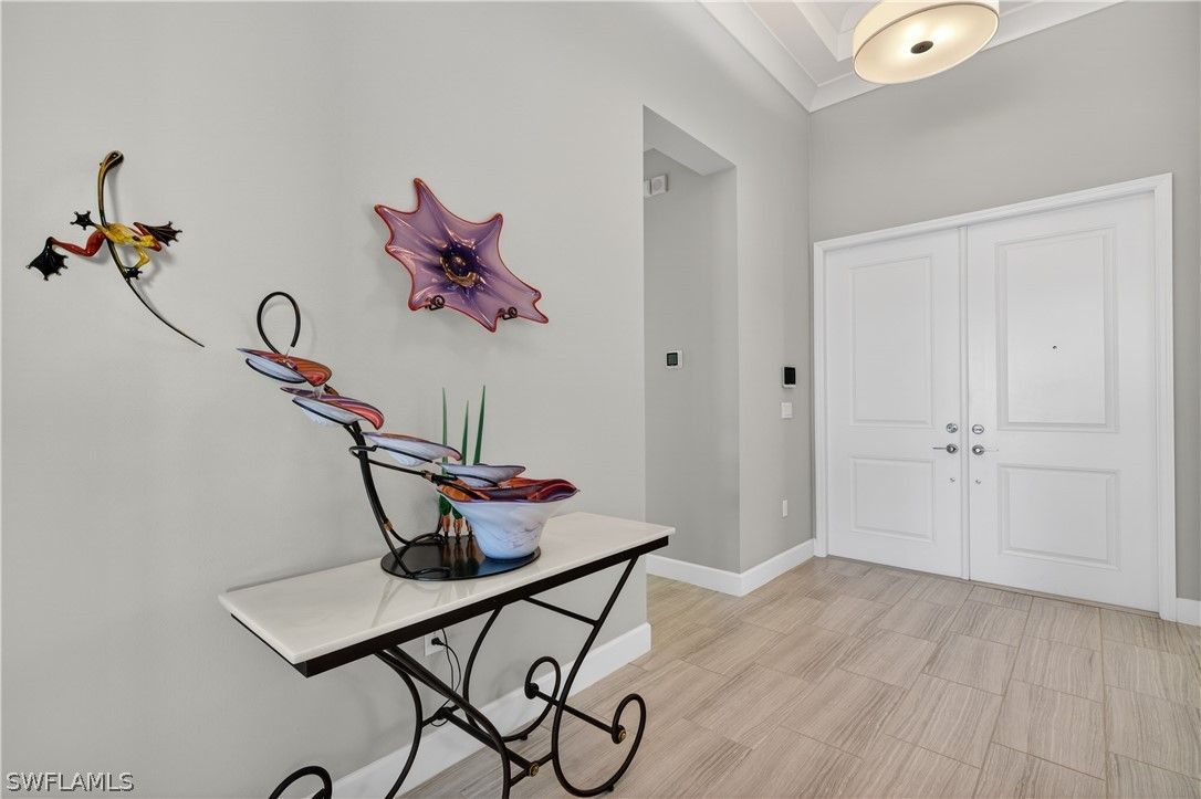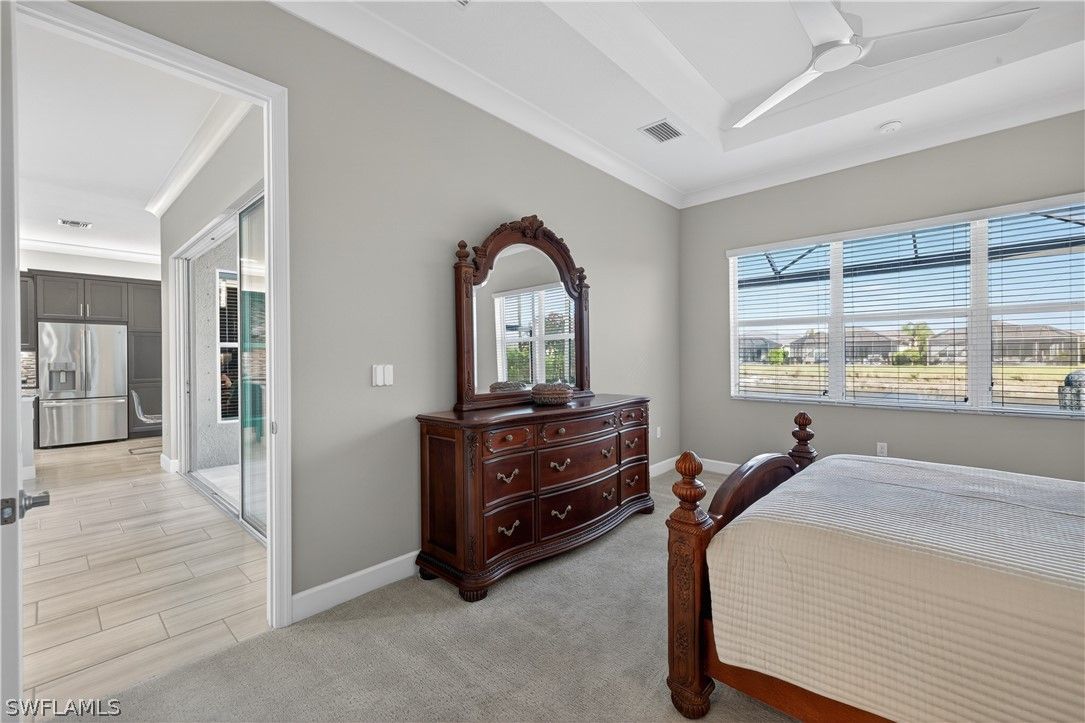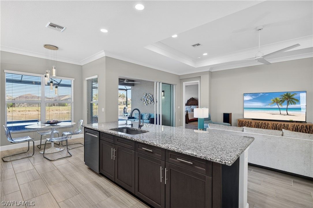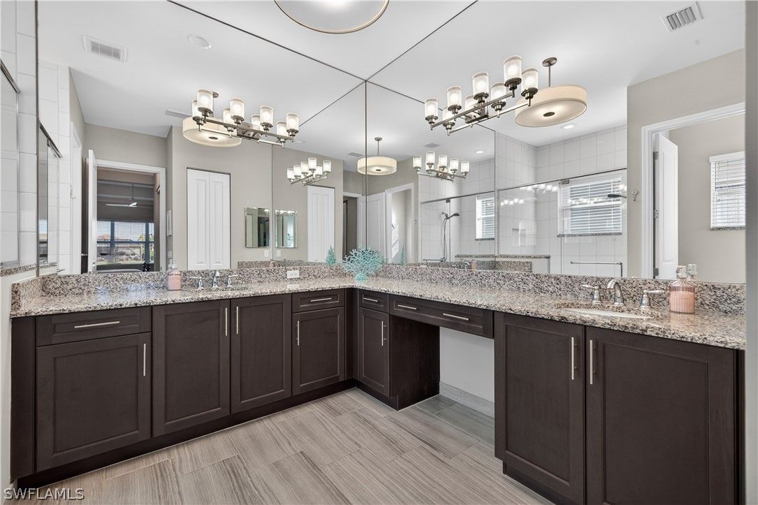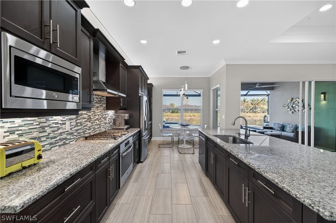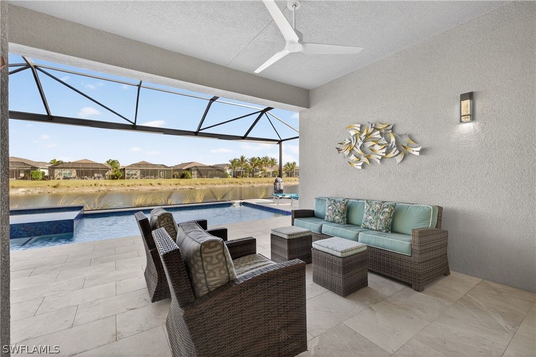 Discover refined lakefront living at 28732 Montecristo Loop in Valencia Bonita — a highly sought-after CABERNET MODEL offering approximately 2,200 square feet under air, 3 bedrooms plus den, 2 baths, and an EXPANDED 2½-CAR GARAGE ideal for a golf cart, workshop, or additional storage. Designed for seamless indoor-outdoor Florida living, this residence centers around a stunning GAS-HEATED POOL and SPA finished with luxury-level iridescent coping tile with iridescent coastal-inspired finishing, surrounded by the upgraded lanai tiles featuring slip-resistant, leathered marble tiles professionally set in concrete for a seamless, low-maintenance outdoor experience, perfectly positioned to capture tranquil LAKE VIEWS and breathtaking sunset skies. The covered under-roof lanai provides an elegant extension of the home, complete with a custom knee wall, gas stub-out, and electrical already in place for a future summer kitchen. Inside, the open-concept floor plan is filled with natural light and enhanced by 12x24 upgraded tile flooring throughout the main living areas and den, 7¼" CROWN MOLDING, tray ceilings, upgraded recessed lighting, and designer fixtures. Pre-wired surround sound with upgraded Cat5 and HDMI wiring, and a neutral, sophisticated palette create a move-in ready yet highly customized environment. The gourmet gas kitchen is a true focal point, featuring upgraded cabinetry with pull-out drawers, a 96" PANTRY CONVERSION with under-cabinet lighting, designer backsplash, large stainless steel undermount sink, and upgraded stainless appliances including a 30" GE Profile FIVE-BURNER GAS RANGE with griddle, and 26" vented chimney hood. A TANKLESS gas hot water heater adds efficiency and modern convenience. The primary suite offers a spa-inspired bath with MIRROR-TO-CEILING detailing, frameless glass shower enclosure, and elevated finishes throughout. The laundry room is equally refined with upgraded cabinetry and utility sink. The extended garage includes INSULATED DOORS and an EPOXY-pebble coated floor, completing a home with over $90,000 in thoughtful upgrades. Valencia Bonita is one of Southwest Florida’s premier active adult communities, featuring a 45,000-square-foot clubhouse with a theatre, three resort pools, tennis, bocce, and eight pickleball courts. Residents enjoy a full-service restaurant, indoor and outdoor bar, firepit gathering areas, spa services, card and pottery rooms, a catering kitchen, live entertainment, and a full-time lifestyle director curating events year-round. Offering exceptional value within today’s evolving market — embracing the vitality, connection, and long-term enjoyment that define life at Valencia​​‌​​​​‌​​‌‌​‌‌​​​‌‌​‌​‌​​‌‌​​​‌ Bonita.