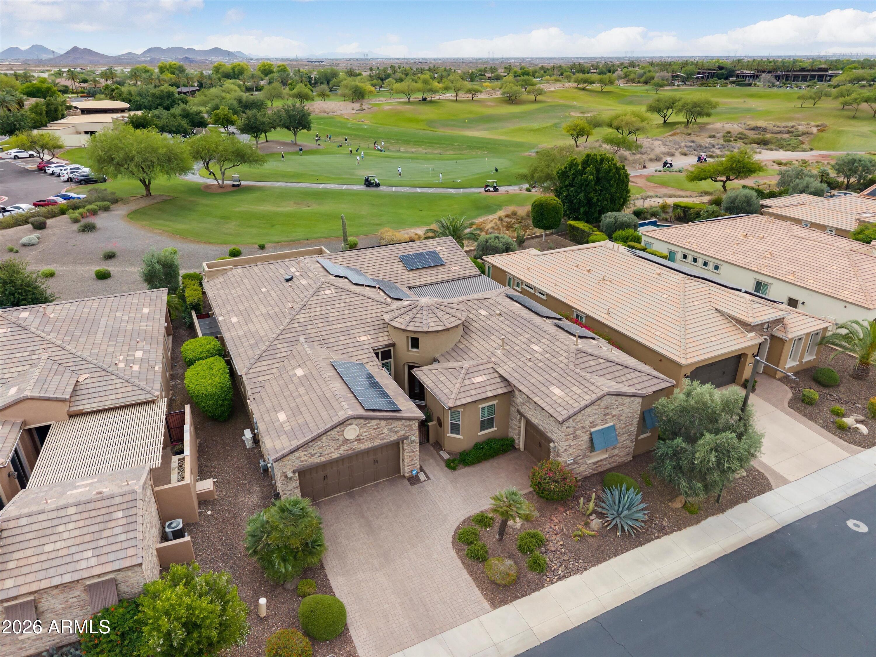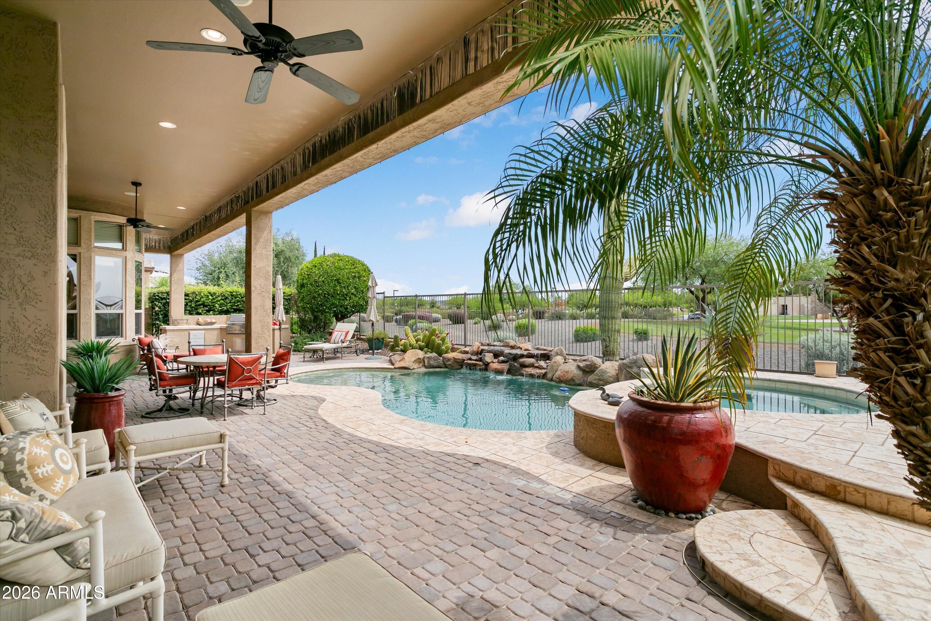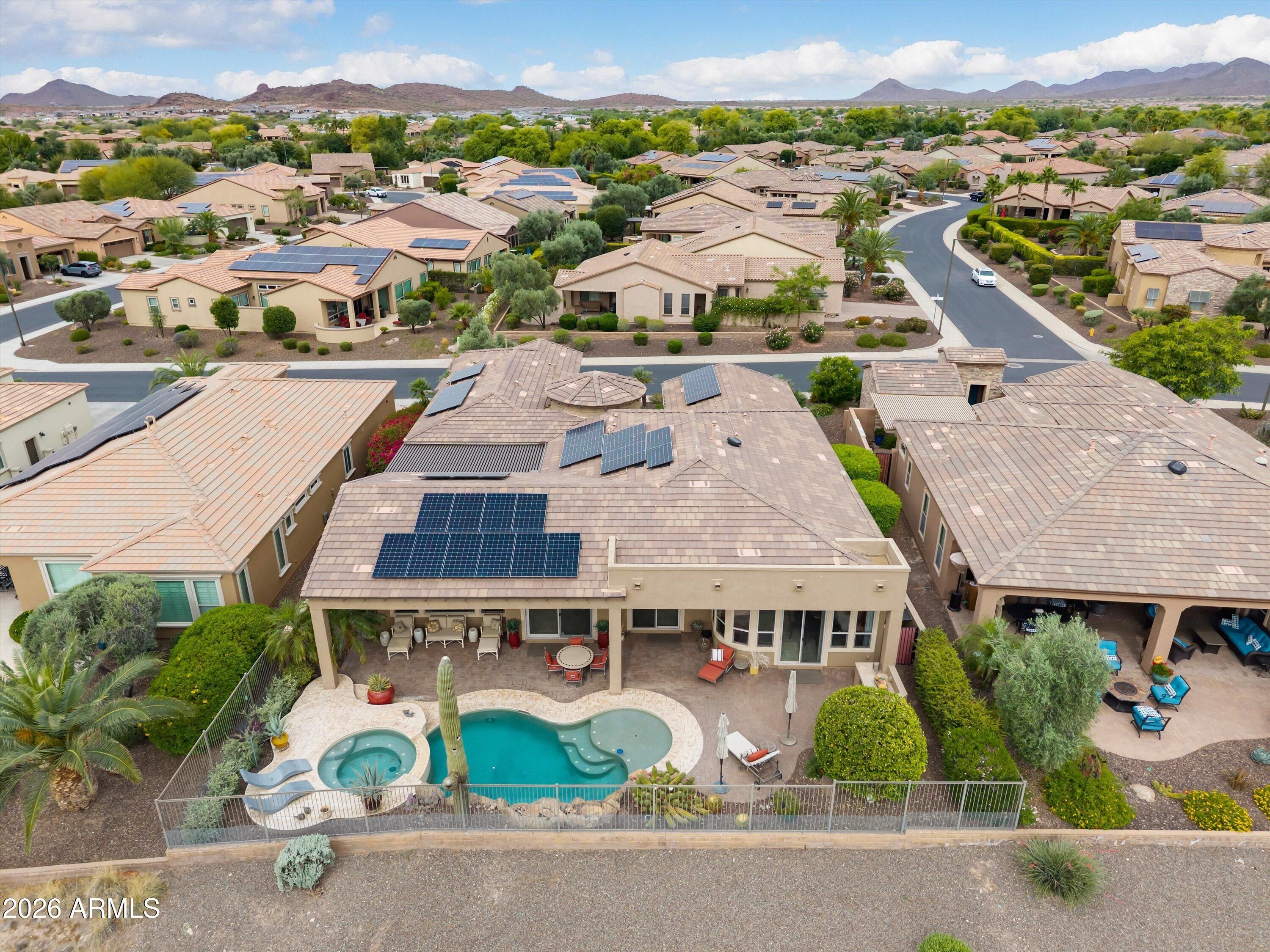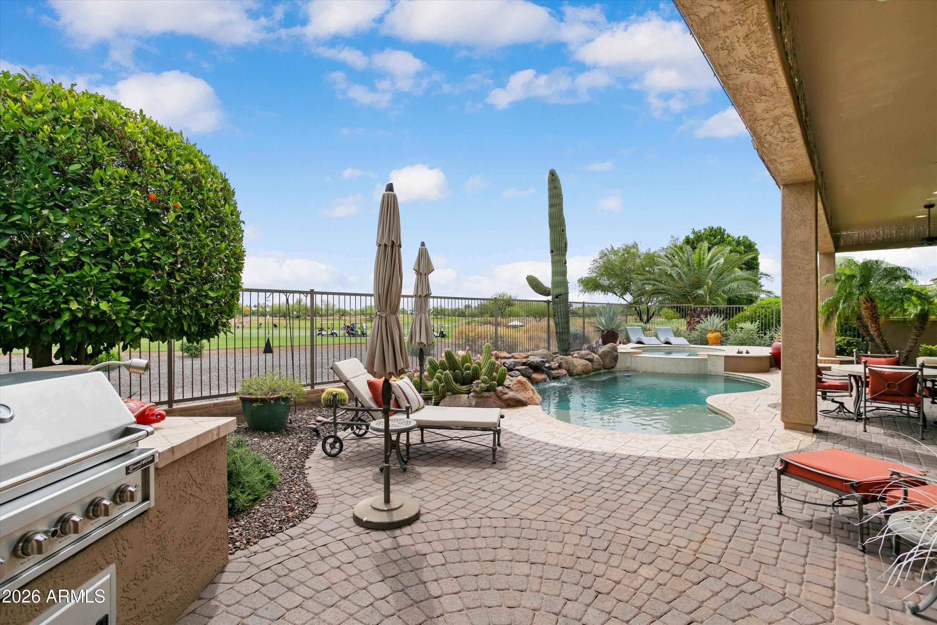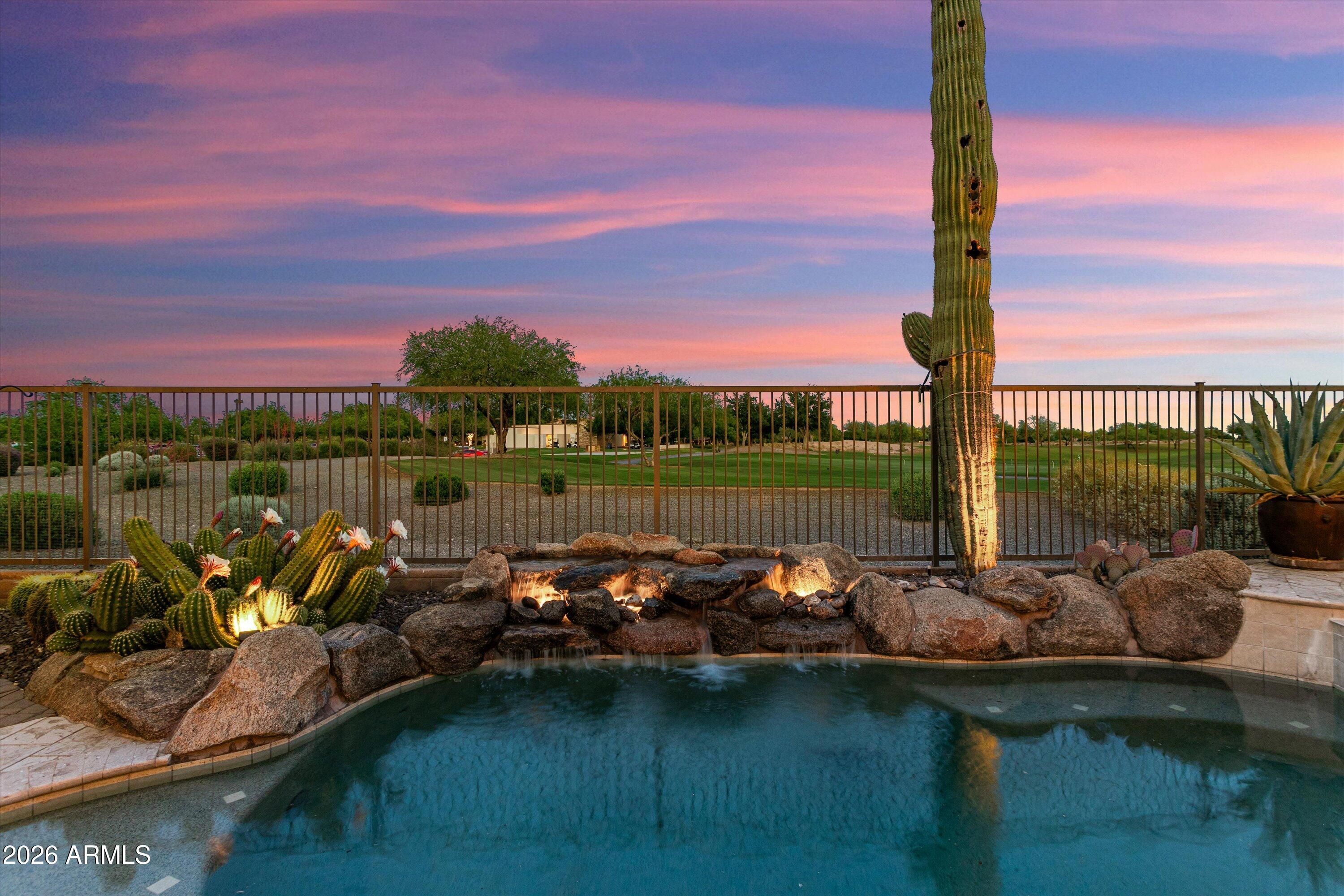 'RESORT' BACKYARD OASIS ON GOLF COURSE with heated POOL AND SPA. Stunning 'Stellare' ideal for indoor/outdoor entertaining and enhanced with MANY thoughtfully added updates beginning in 2021 including OWNED SOLAR! This elegant award-winning floor plan has soaring 12' CEILINGS, an expansive great room, gourmet kitchen with large morning room, 3 ENSUITE BEDROOMS plus half-bath, den & 2+1 garages, NO CARPETING. With golf views & dramatic SUNRISE & SUNSET views the backyard features a covered & a huge extended patio-both w/pavers, travertine pavers surrounding the pool w/waterfall & spillover spa, built-in BBQ island w/new Grand Turbo gas BBQ-2025, misters, custom landscaping & wrought iron fence. Extended side paver courtyard off the great room provides more outdoor living. Spacious chef's dream kitchen with extensive cabinetry & counter space, deluxe granite slab on counters & large island, GE Monogram stainless built-in appliances with five-burner cooktop surrounded by a focal-point decorative designer vent hood to the ceiling and a relaxing morning room surrounded with windows and a sliding glass door to the patio. Enjoy breakfast or morning coffee outdoors. The 38' long great room with an area for dining and sliding glass doors to the patio features a beautiful wet bar with seating & beverage refrigerator. The primary suite is spectacular with access to the side courtyard and paver path to the backyard, bay wall in the bedroom, attractively finished five-piece bath including jetted soaking tub & huge walk-in closet. The two attractive on-suite guest bedrooms and half bath are in a separate wing of the house. Updates since 2021 include OWNED SOLAR (9.84kW-average electric bills $63/month for past 12 months), two HVAC systems, mini-split in main garage, cabinets added to laundry room and both garages, tankless hot water heater, Hunter Douglas silhouette sheers, clearstory window coverings on remotes, custom window treatments, pergola over side courtyard, deluxe closet organizing system in primary suite, sunshade covering the pool equipment, door on den, & ceiling fans. Here is YOUR SPECTACULAR HOME. Located in award-winning gated, 55+ Trilogy at Vistancia with 5-star-resort style amenities at the 35,000 SF Kiva Club with indoor & outdoor pools, fitness center, day spa, cafe, billiards, meeting rooms, library, tennis courts, pickle ball, bocce ball, events & a plethora of activities to choose from. Outstanding Gary Panks-designed golf course is woven throughout the neighborhood. The Mita Club has additional community amenities. Easy access from Trilogy to the 303, shopping, restaurants, entertainment, Lake Pleasant & Paloma Park.