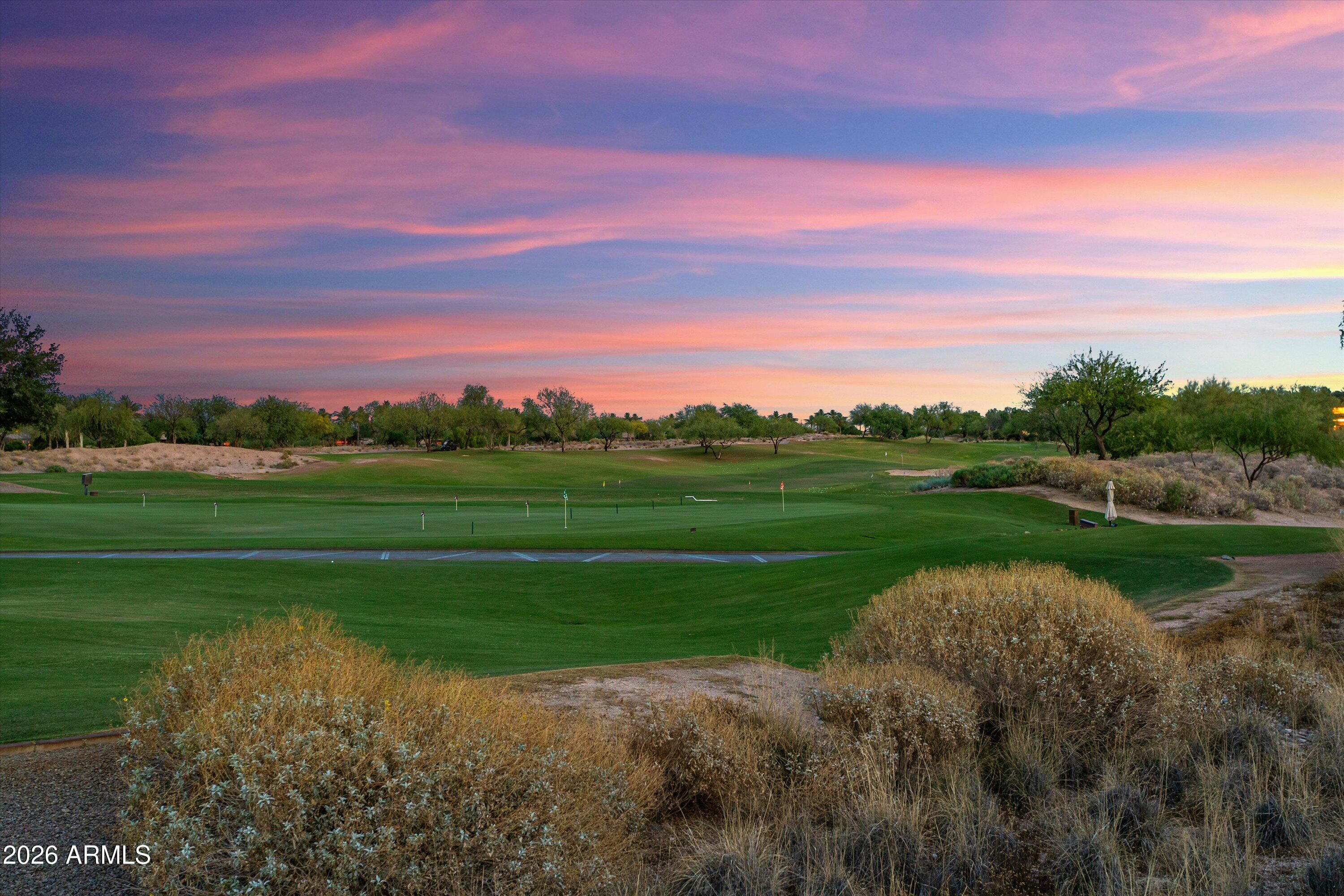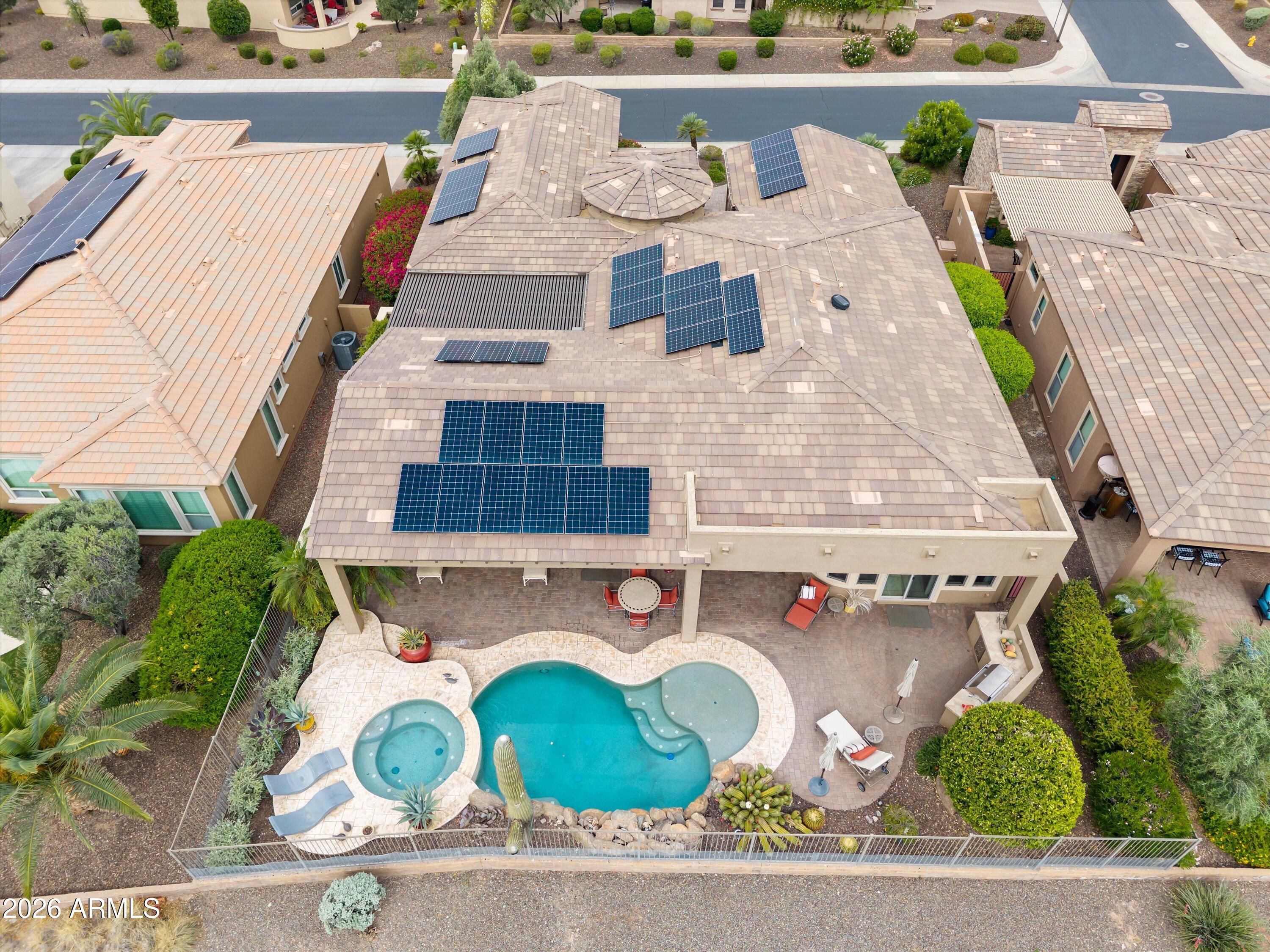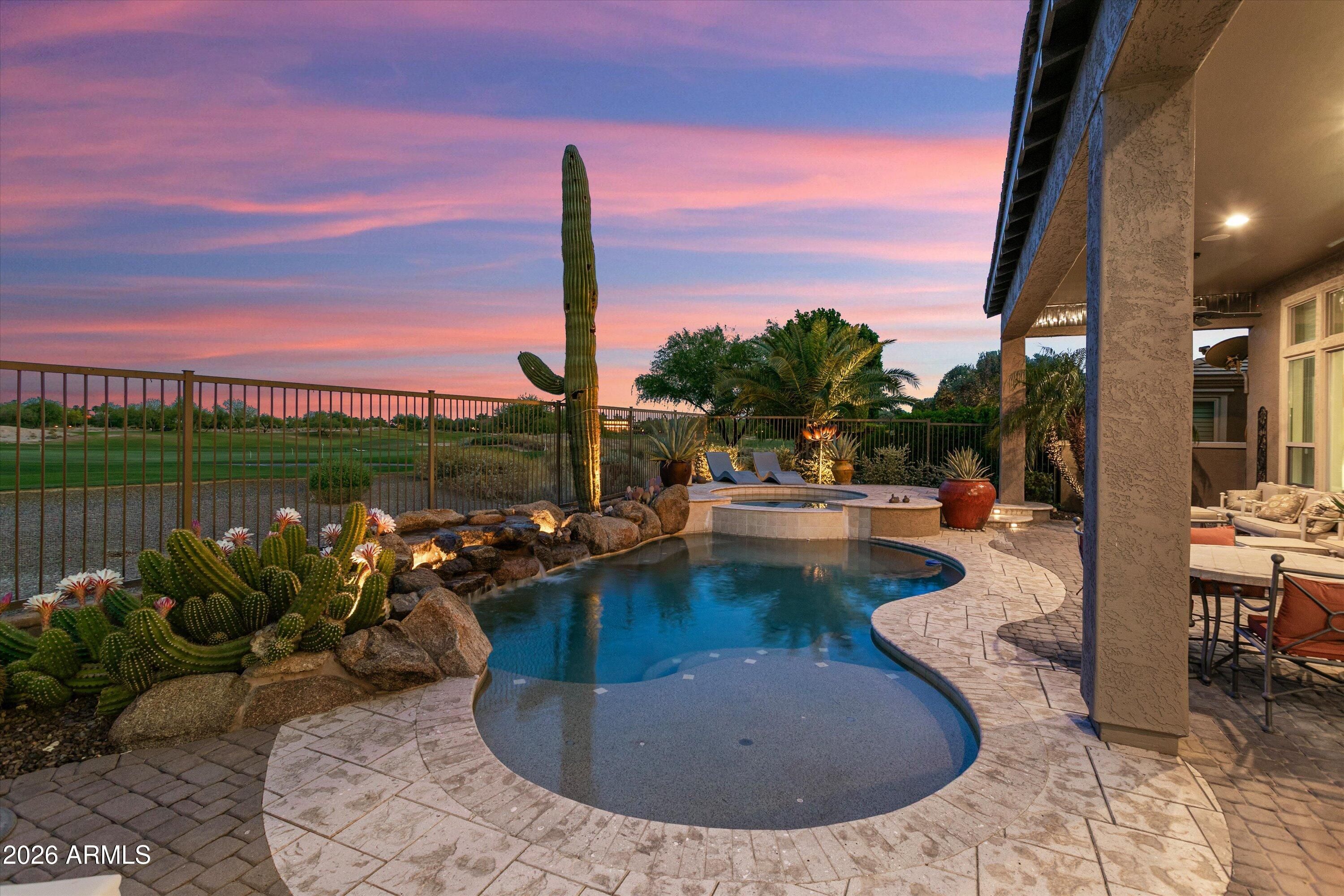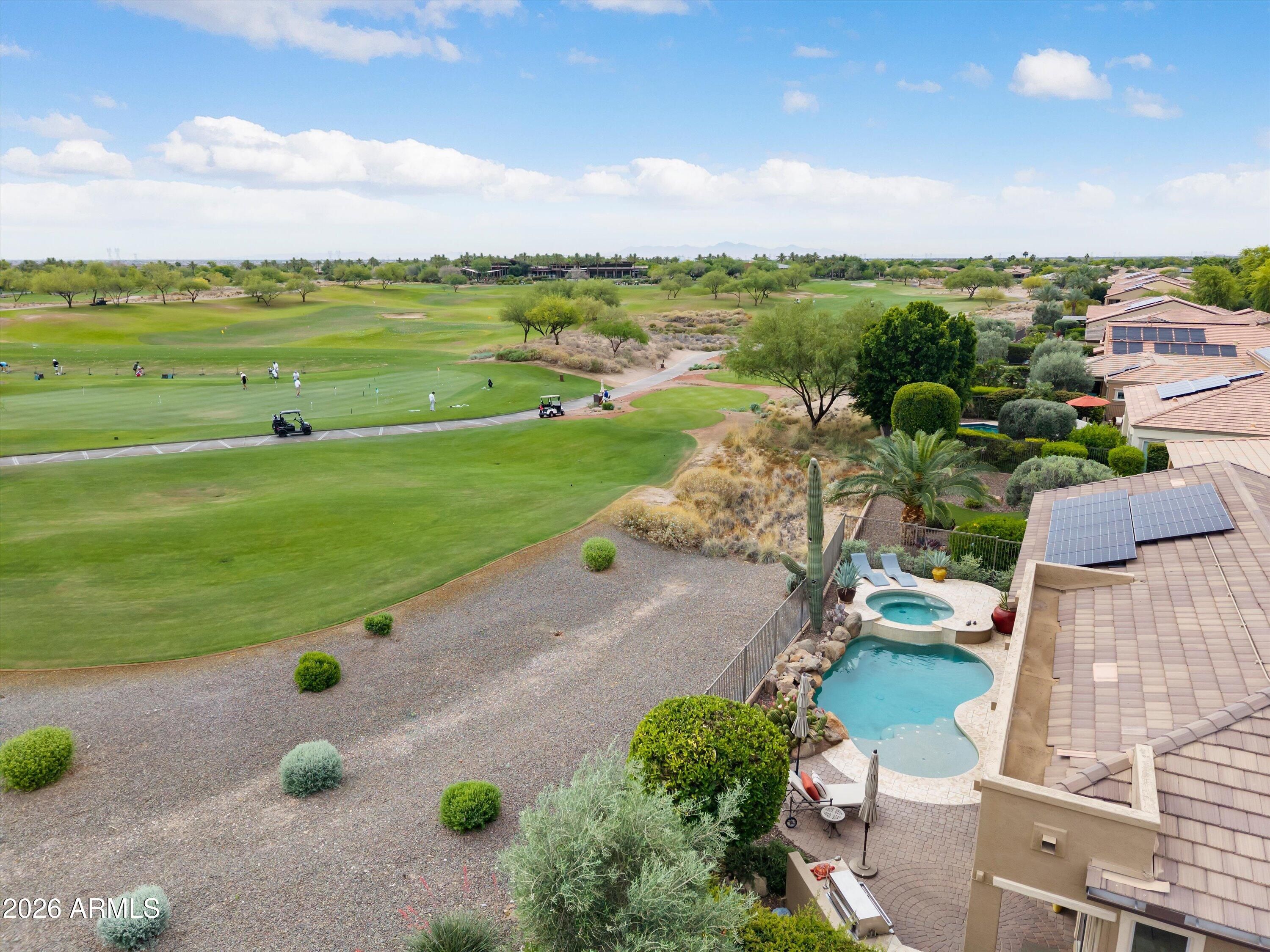 'RESORT' BACKYARD OASIS ON GOLF COURSE with heated POOL AND SPA. Stunning 'Stellare' ideal for indoor/outdoor entertaining and enhanced with MANY thoughtfully added updates beginning in 2021 including OWNED SOLAR! This elegant award-winning floor plan has soaring 12' CEILINGS, an expansive great room, gourmet kitchen with large morning room, 3 ENSUITE BEDROOMS plus half-bath, den & 2+1 garages, NO CARPETING. With golf views & dramatic SUNRISE & SUNSET views the backyard features a covered & a huge extended patio-both w/pavers, travertine pavers surrounding the pool w/waterfall & spillover spa, built-in BBQ island w/new Grand Turbo gas BBQ-2025, misters, custom landscaping & wrought iron fence. Extended side paver courtyard off the great room provides more outdoor living. Spacious chef's dream kitchen with extensive cabinetry & counter space, deluxe granite slab on counters & large island, GE Monogram stainless built-in appliances with five-burner cooktop surrounded by a focal-point decorative designer vent hood to the ceiling and a relaxing morning room surrounded with windows and a sliding glass door to the patio. Enjoy breakfast or morning coffee outdoors. The 38' long great room with an area for dining and sliding glass doors to the patio features a beautiful wet bar with seating & beverage refrigerator. The primary suite is spectacular with access to the side courtyard and paver path to the backyard, bay wall in the bedroom, attractively finished five-piece bath including jetted soaking tub & huge walk-in closet. The two attractive on-suite guest bedrooms and half bath are in a separate wing of the house. Updates since 2021 include OWNED SOLAR (9.84kW-average electric bills $63/month for past 12 months), two HVAC systems, mini-split in main garage, cabinets added to laundry room and both garages, tankless hot water heater, Hunter Douglas silhouette sheers, clearstory window coverings on remotes, custom window treatments, pergola over side courtyard, deluxe closet organizing system in primary suite, sunshade covering the pool equipment, door on den, & ceiling fans. Here is YOUR SPECTACULAR HOME. Located in award-winning gated, 55+ Trilogy at Vistancia with 5-star-resort style amenities at the 35,000 SF Kiva Club with indoor & outdoor pools, fitness center, day spa, cafe, billiards, meeting rooms, library, tennis courts, pickle ball, bocce ball, events & a plethora of activities to choose from. Outstanding Gary Panks-designed golf course is woven throughout the neighborhood. The Mita Club has additional community amenities. Easy access from Trilogy to the 303, shopping, restaurants, entertainment, Lake Pleasant & Paloma Park.