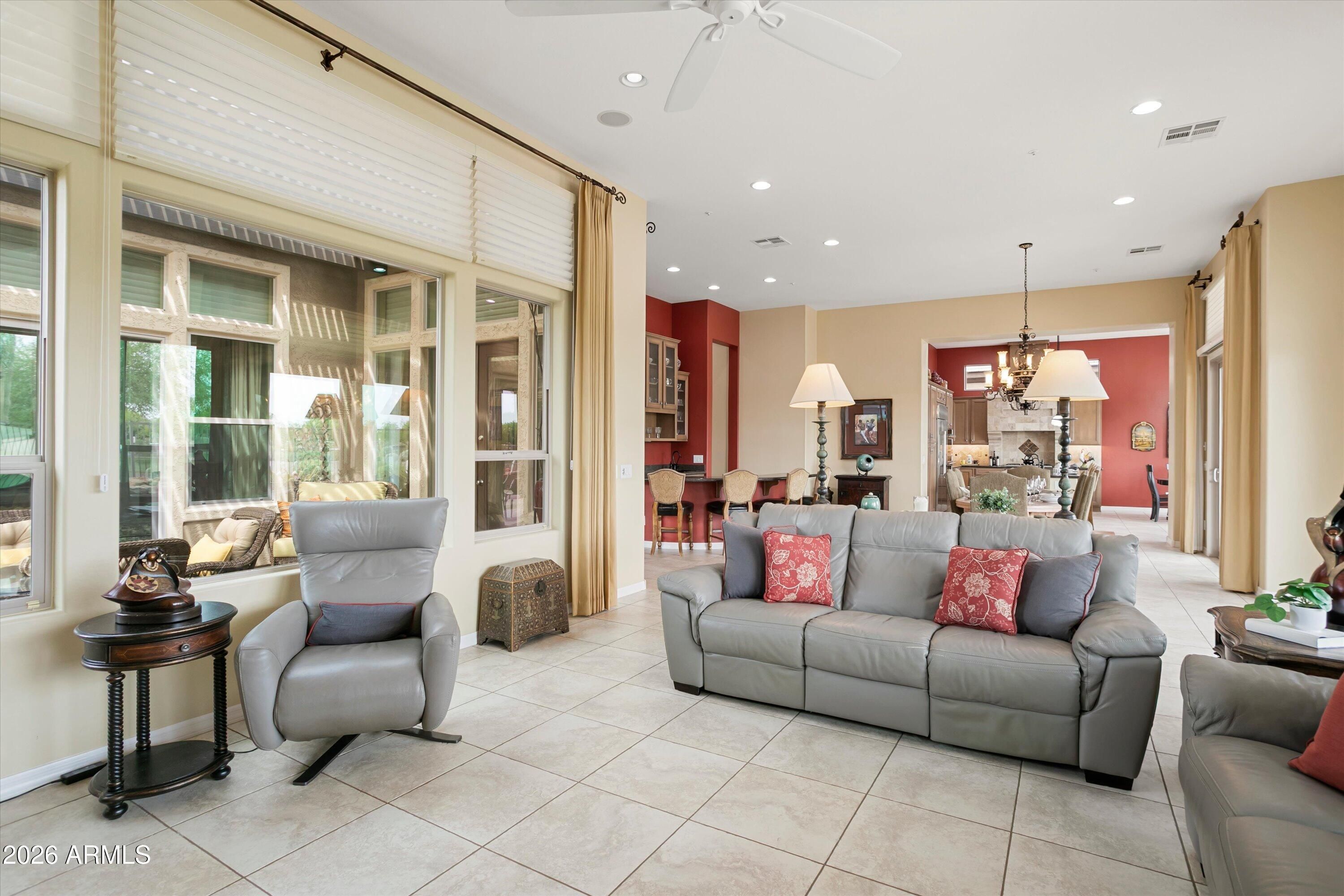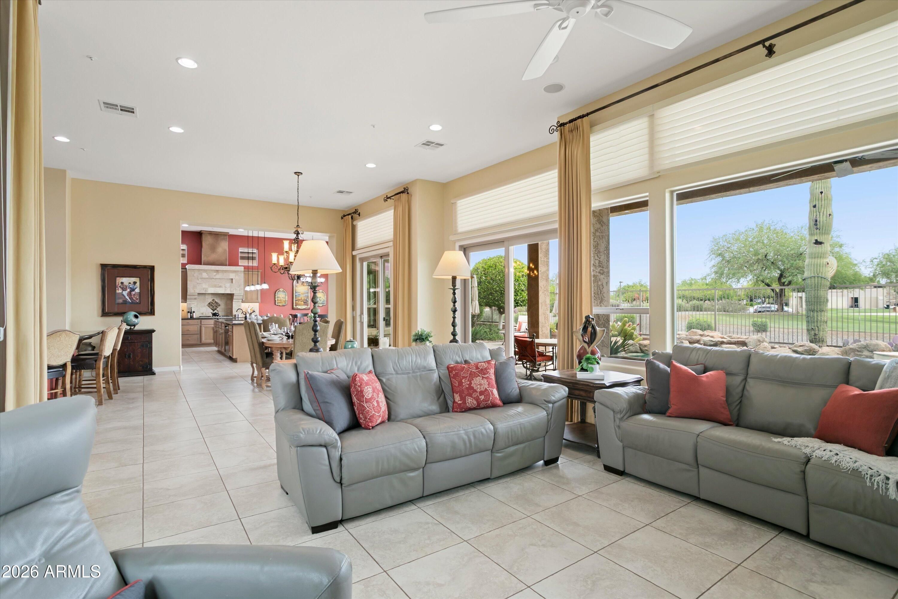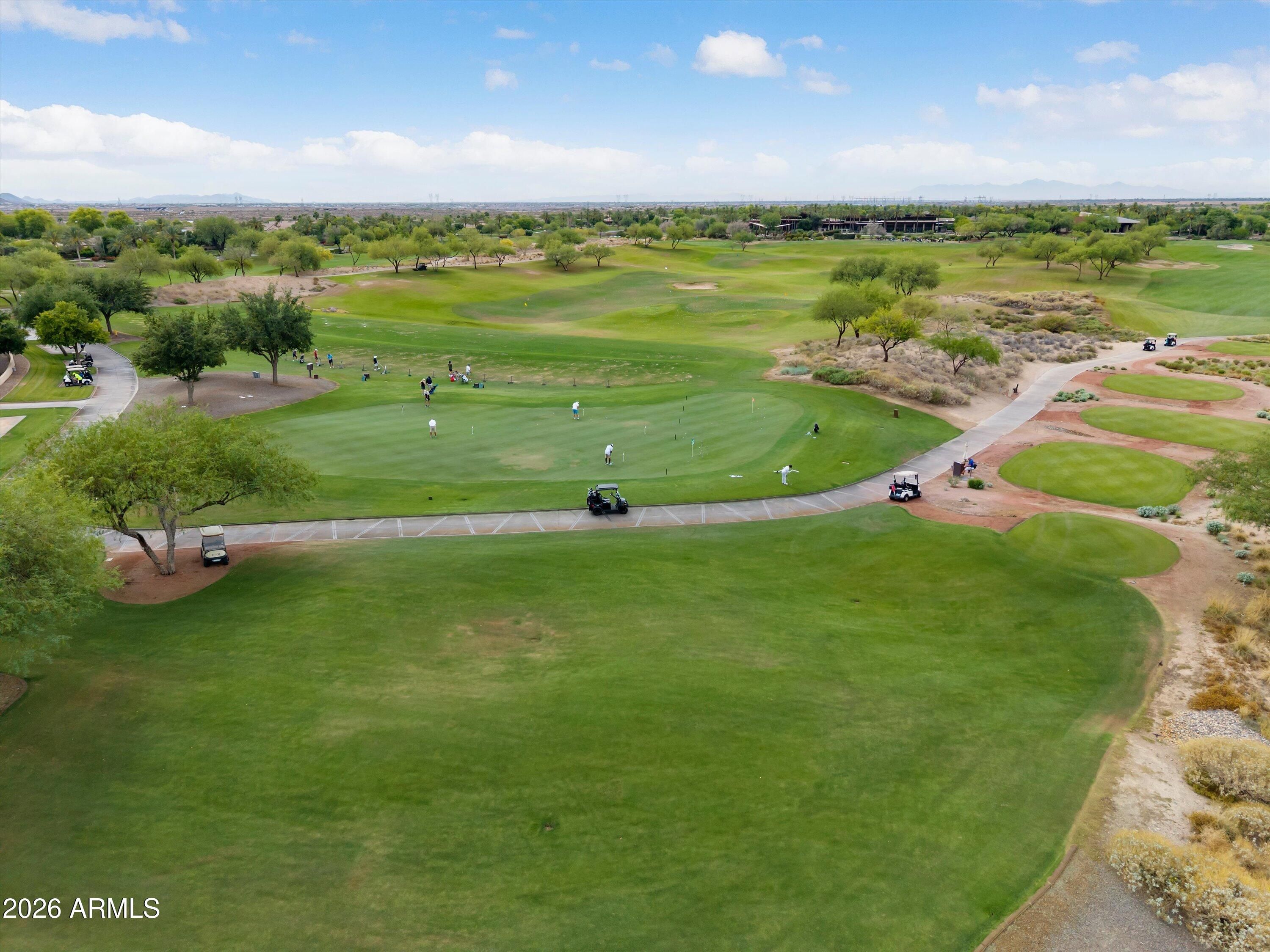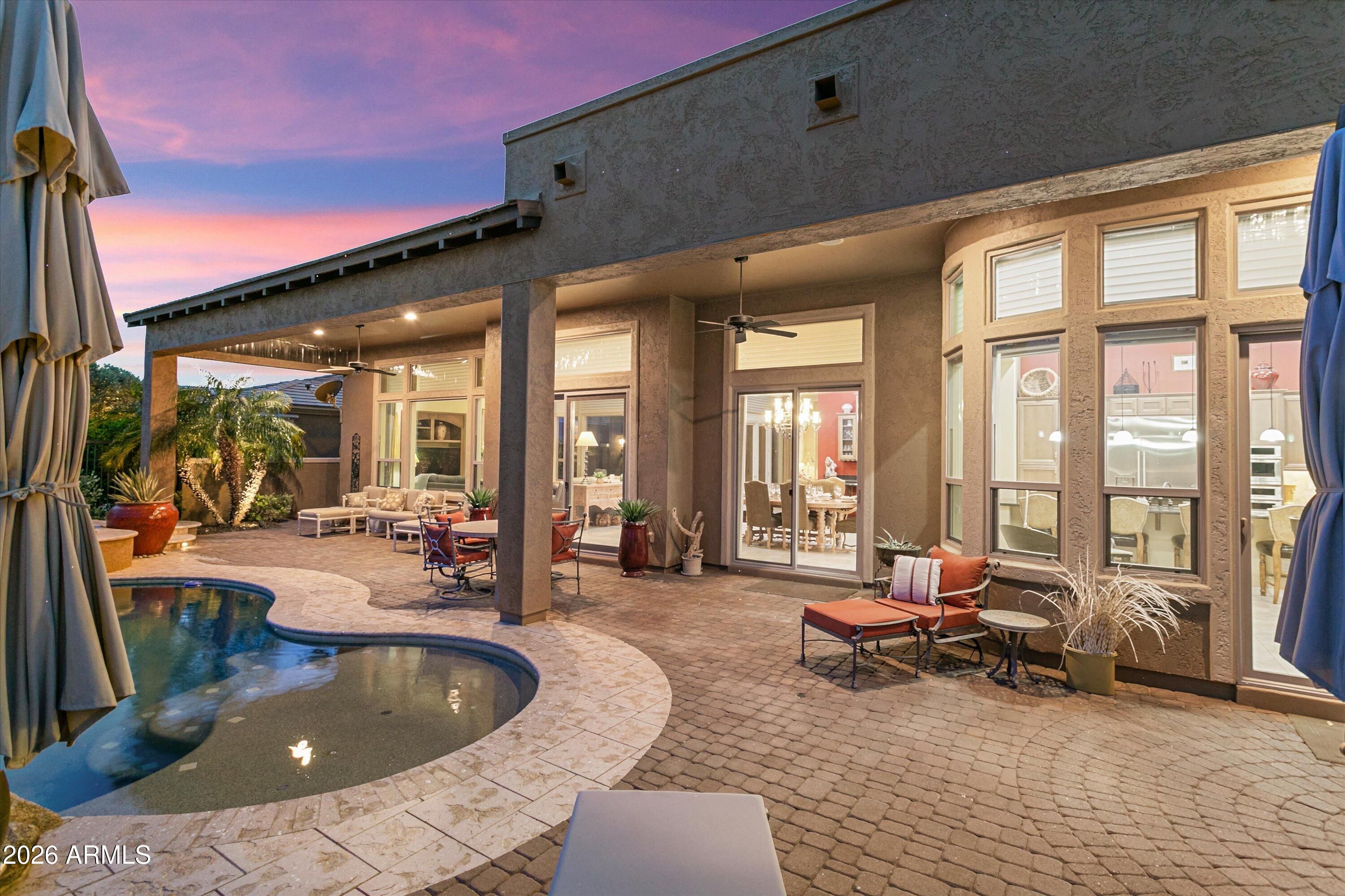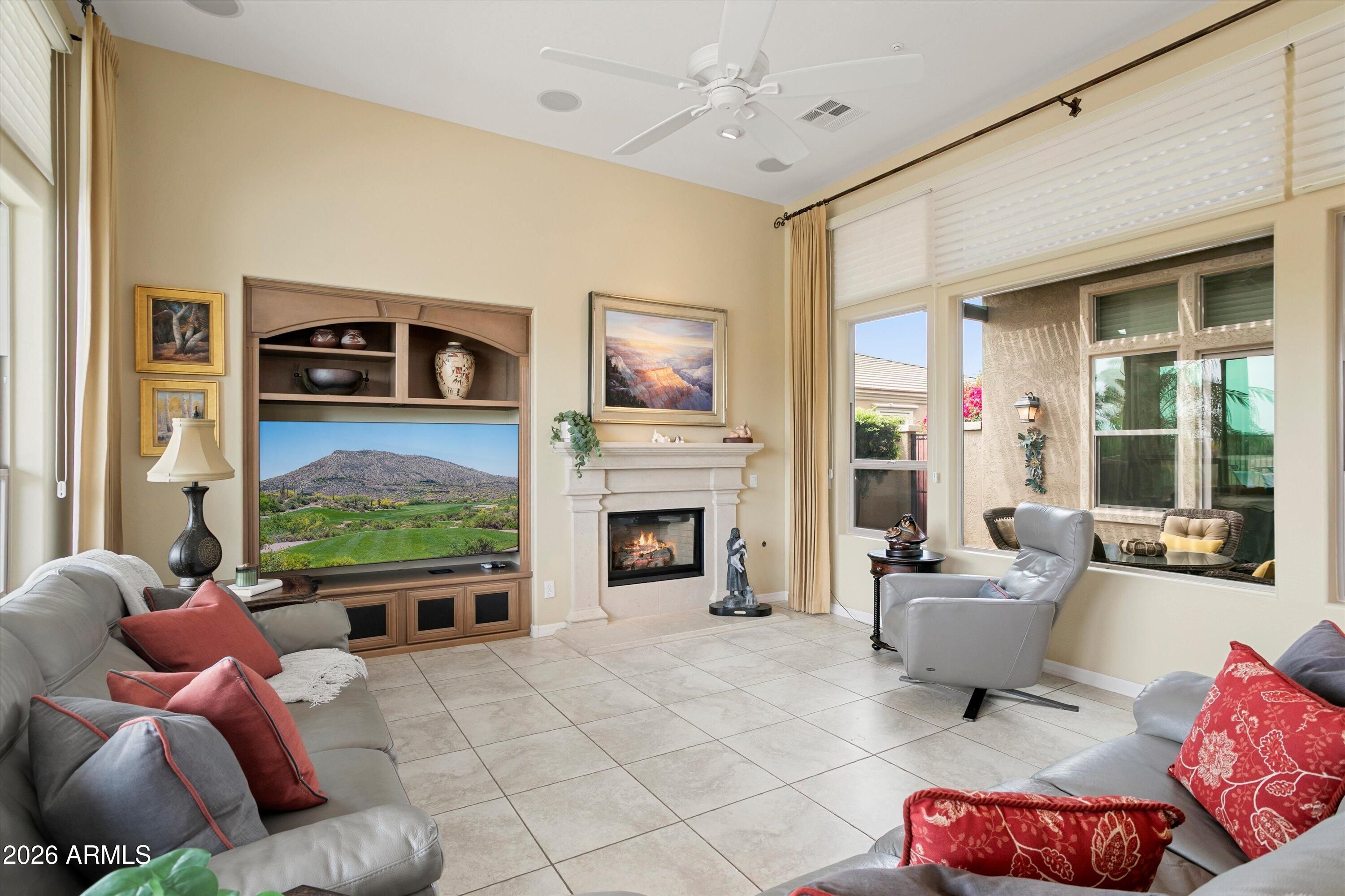 'RESORT' BACKYARD OASIS ON GOLF COURSE with heated POOL AND SPA. Stunning 'Stellare' ideal for indoor/outdoor entertaining and enhanced with MANY thoughtfully added updates beginning in 2021 including OWNED SOLAR! This elegant award-winning floor plan has soaring 12' CEILINGS, an expansive great room, gourmet kitchen with large morning room, 3 ENSUITE BEDROOMS plus half-bath, den & 2+1 garages, NO CARPETING. With golf views & dramatic SUNRISE & SUNSET views the backyard features a covered & a huge extended patio-both w/pavers, travertine pavers surrounding the pool w/waterfall & spillover spa, built-in BBQ island w/new Grand Turbo gas BBQ-2025, misters, custom landscaping & wrought iron fence. Extended side paver courtyard off the great room provides more outdoor living. Spacious chef's dream kitchen with extensive cabinetry & counter space, deluxe granite slab on counters & large island, GE Monogram stainless built-in appliances with five-burner cooktop surrounded by a focal-point decorative designer vent hood to the ceiling and a relaxing morning room surrounded with windows and a sliding glass door to the patio. Enjoy breakfast or morning coffee outdoors. The 38' long great room with an area for dining and sliding glass doors to the patio features a beautiful wet bar with seating & beverage refrigerator. The primary suite is spectacular with access to the side courtyard and paver path to the backyard, bay wall in the bedroom, attractively finished five-piece bath including jetted soaking tub & huge walk-in closet. The two attractive on-suite guest bedrooms and half bath are in a separate wing of the house. Updates since 2021 include OWNED SOLAR (9.84kW-average electric bills $63/month for past 12 months), two HVAC systems, mini-split in main garage, cabinets added to laundry room and both garages, tankless hot water heater, Hunter Douglas silhouette sheers, clearstory window coverings on remotes, custom window treatments, pergola over side courtyard, deluxe closet organizing system in primary suite, sunshade covering the pool equipment, door on den, & ceiling fans. Here is YOUR SPECTACULAR HOME. Located in award-winning gated, 55+ Trilogy at Vistancia with 5-star-resort style amenities at the 35,000 SF Kiva Club with indoor & outdoor pools, fitness center, day spa, cafe, billiards, meeting rooms, library, tennis courts, pickle ball, bocce ball, events & a plethora of activities to choose from. Outstanding Gary Panks-designed golf course is woven throughout the neighborhood. The Mita Club has additional community amenities. Easy access from Trilogy to the 303, shopping, restaurants, entertainment, Lake Pleasant & Paloma Park.