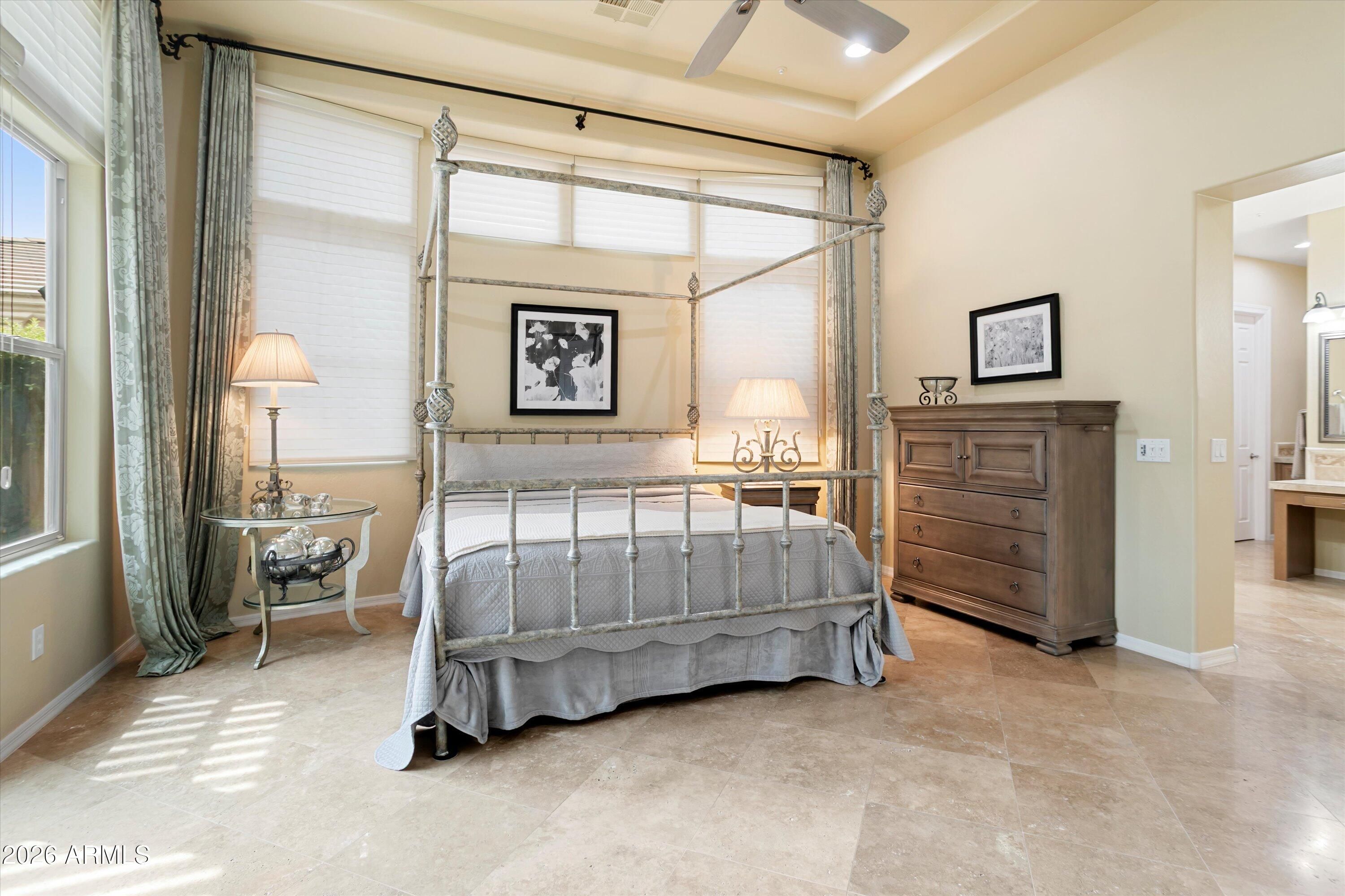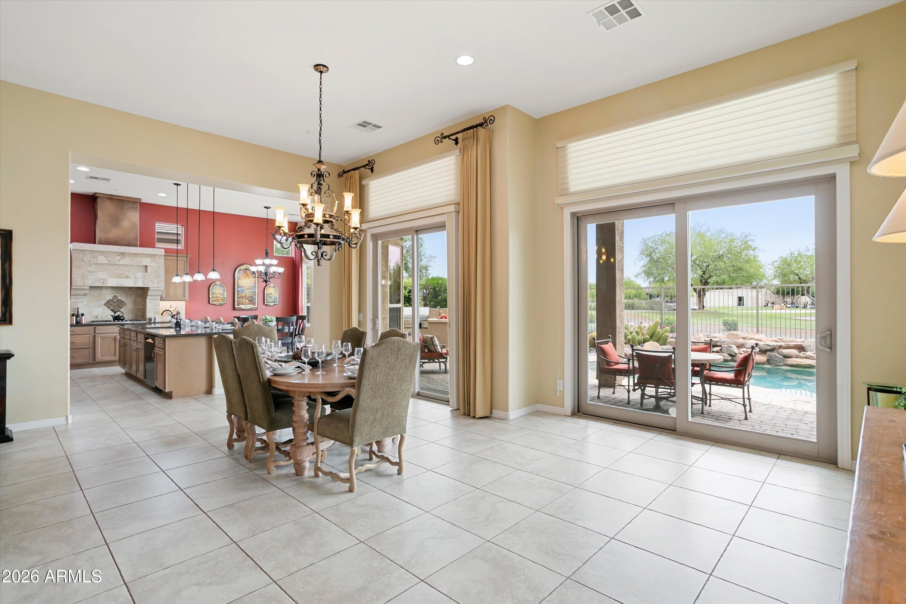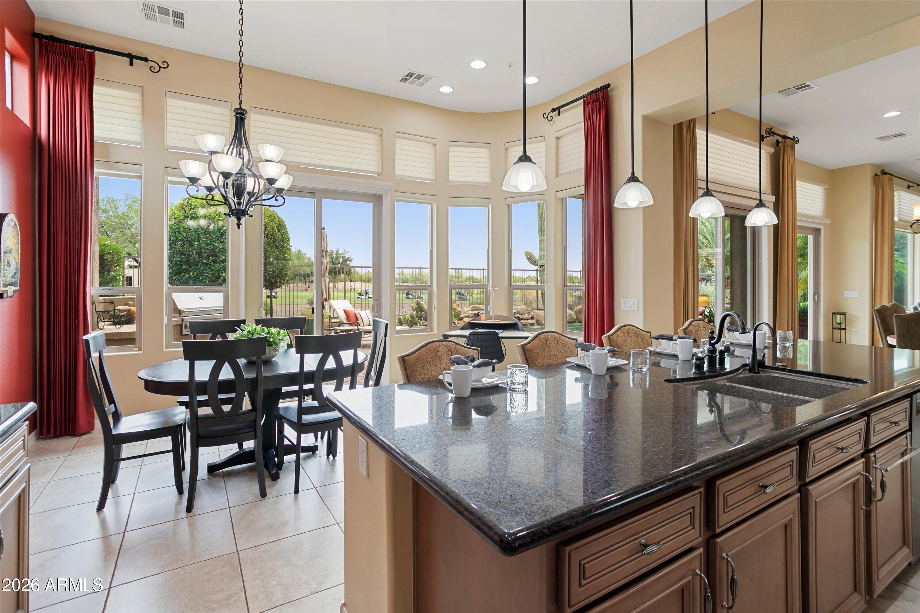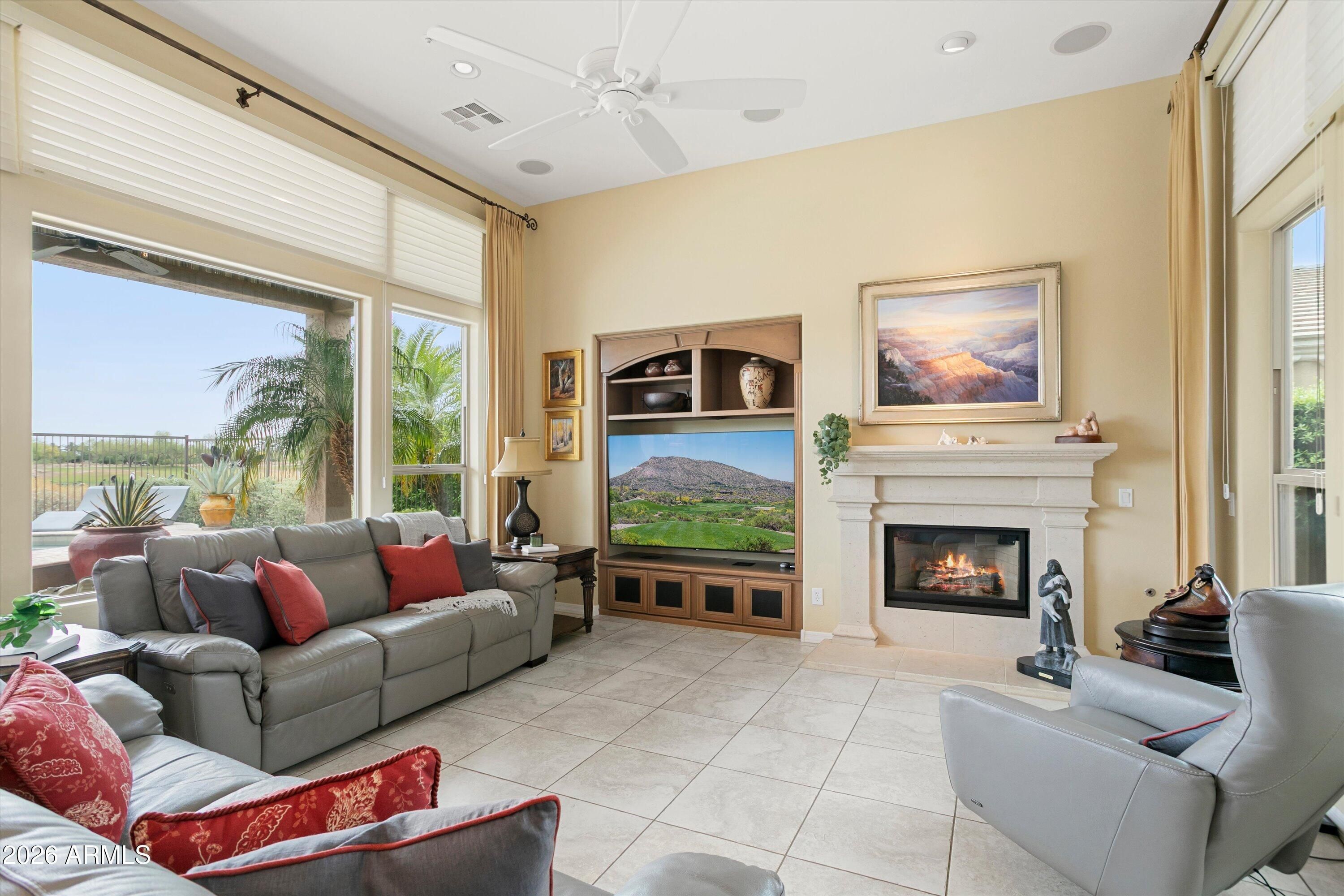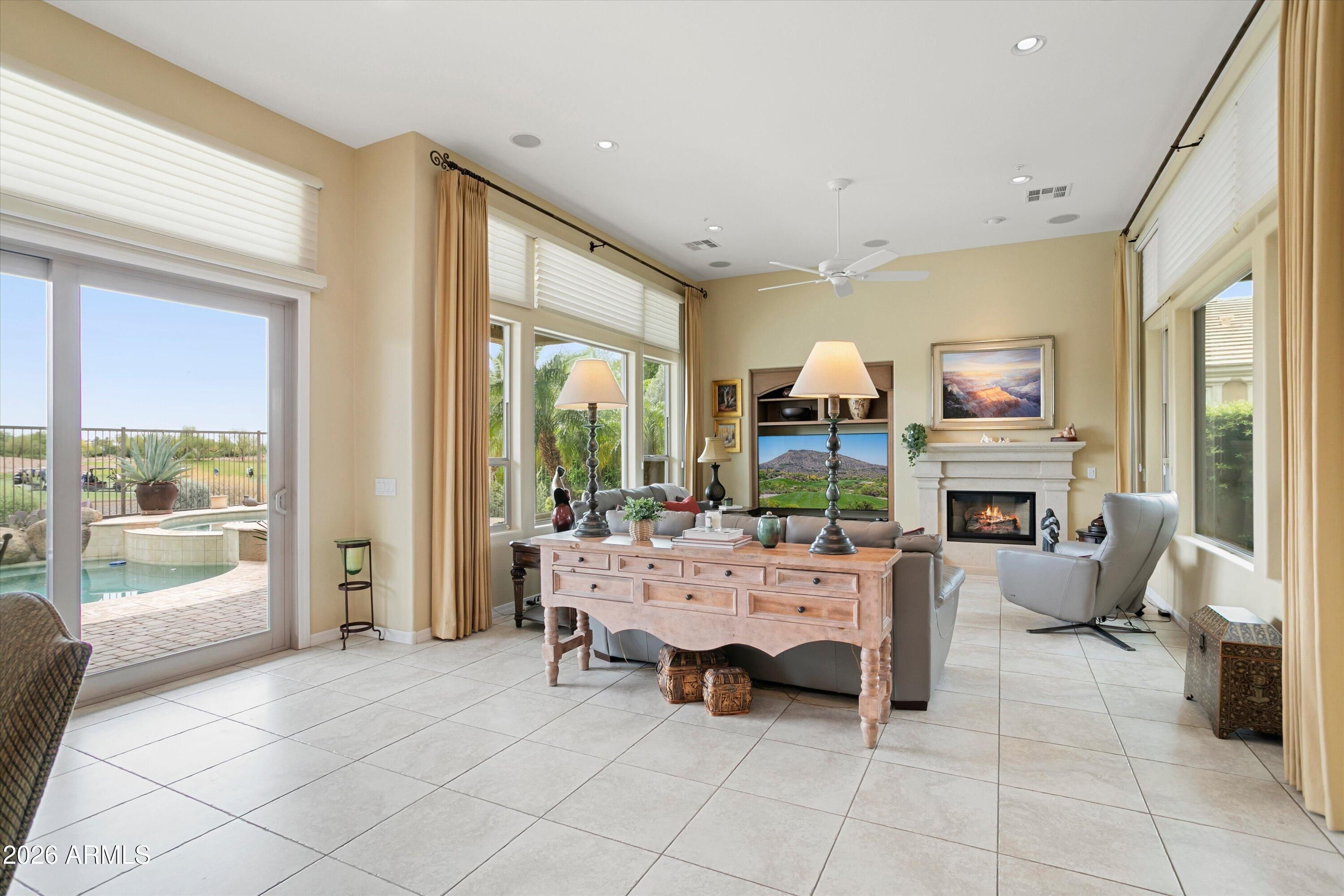 'RESORT' BACKYARD OASIS ON GOLF COURSE with heated POOL AND SPA. Stunning 'Stellare' ideal for indoor/outdoor entertaining and enhanced with MANY thoughtfully added updates beginning in 2021 including OWNED SOLAR! This elegant award-winning floor plan has soaring 12' CEILINGS, an expansive great room, gourmet kitchen with large morning room, 3 ENSUITE BEDROOMS plus half-bath, den & 2+1 garages, NO CARPETING. With golf views & dramatic SUNRISE & SUNSET views the backyard features a covered & a huge extended patio-both w/pavers, travertine pavers surrounding the pool w/waterfall & spillover spa, built-in BBQ island w/new Grand Turbo gas BBQ-2025, misters, custom landscaping & wrought iron fence. Extended side paver courtyard off the great room provides more outdoor living. Spacious chef's dream kitchen with extensive cabinetry & counter space, deluxe granite slab on counters & large island, GE Monogram stainless built-in appliances with five-burner cooktop surrounded by a focal-point decorative designer vent hood to the ceiling and a relaxing morning room surrounded with windows and a sliding glass door to the patio. Enjoy breakfast or morning coffee outdoors. The 38' long great room with an area for dining and sliding glass doors to the patio features a beautiful wet bar with seating & beverage refrigerator. The primary suite is spectacular with access to the side courtyard and paver path to the backyard, bay wall in the bedroom, attractively finished five-piece bath including jetted soaking tub & huge walk-in closet. The two attractive on-suite guest bedrooms and half bath are in a separate wing of the house. Updates since 2021 include OWNED SOLAR (9.84kW-average electric bills $63/month for past 12 months), two HVAC systems, mini-split in main garage, cabinets added to laundry room and both garages, tankless hot water heater, Hunter Douglas silhouette sheers, clearstory window coverings on remotes, custom window treatments, pergola over side courtyard, deluxe closet organizing system in primary suite, sunshade covering the pool equipment, door on den, & ceiling fans. Here is YOUR SPECTACULAR HOME. Located in award-winning gated, 55+ Trilogy at Vistancia with 5-star-resort style amenities at the 35,000 SF Kiva Club with indoor & outdoor pools, fitness center, day spa, cafe, billiards, meeting rooms, library, tennis courts, pickle ball, bocce ball, events & a plethora of activities to choose from. Outstanding Gary Panks-designed golf course is woven throughout the neighborhood. The Mita Club has additional community amenities. Easy access from Trilogy to the 303, shopping, restaurants, entertainment, Lake Pleasant & Paloma Park.
