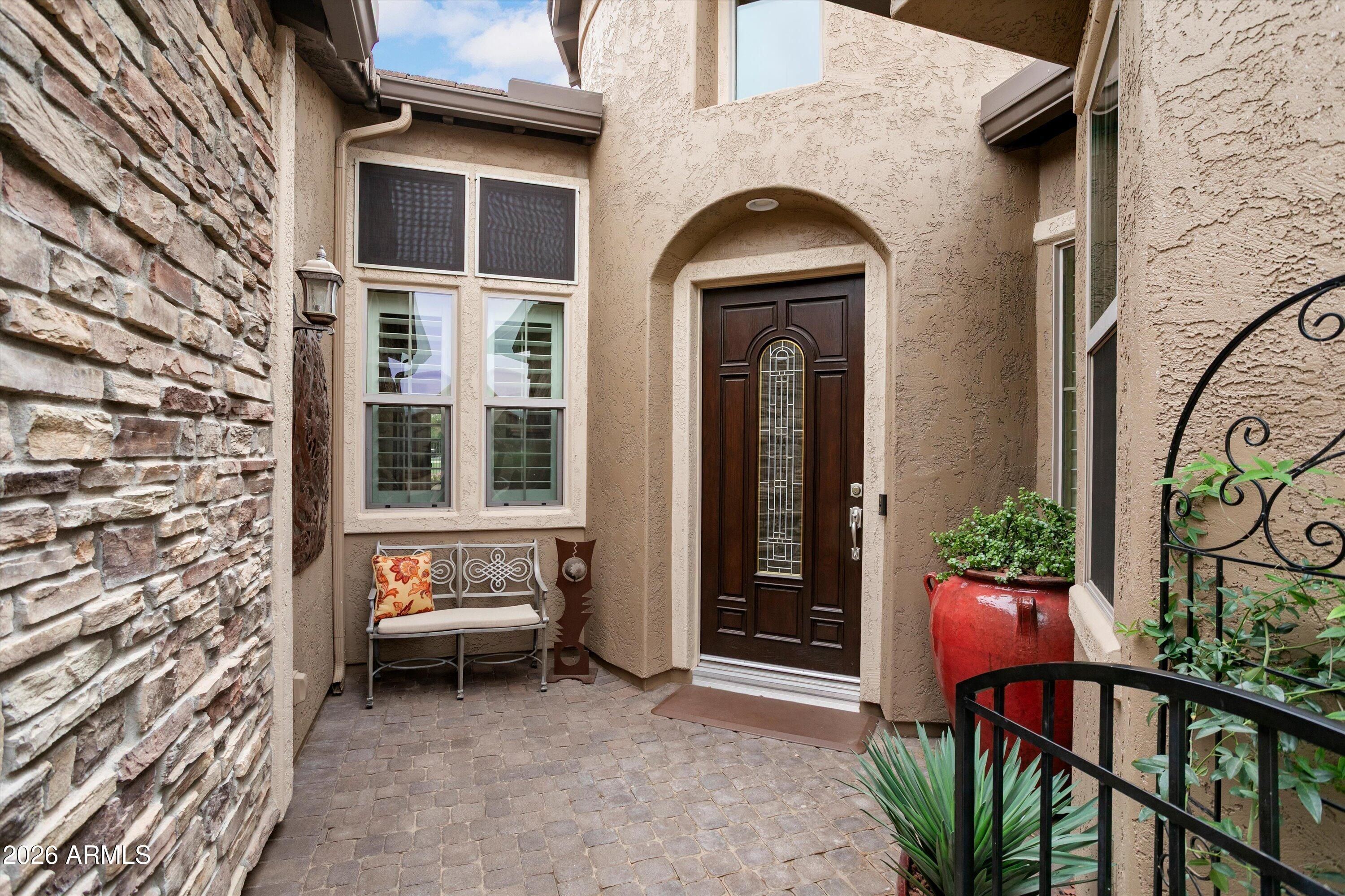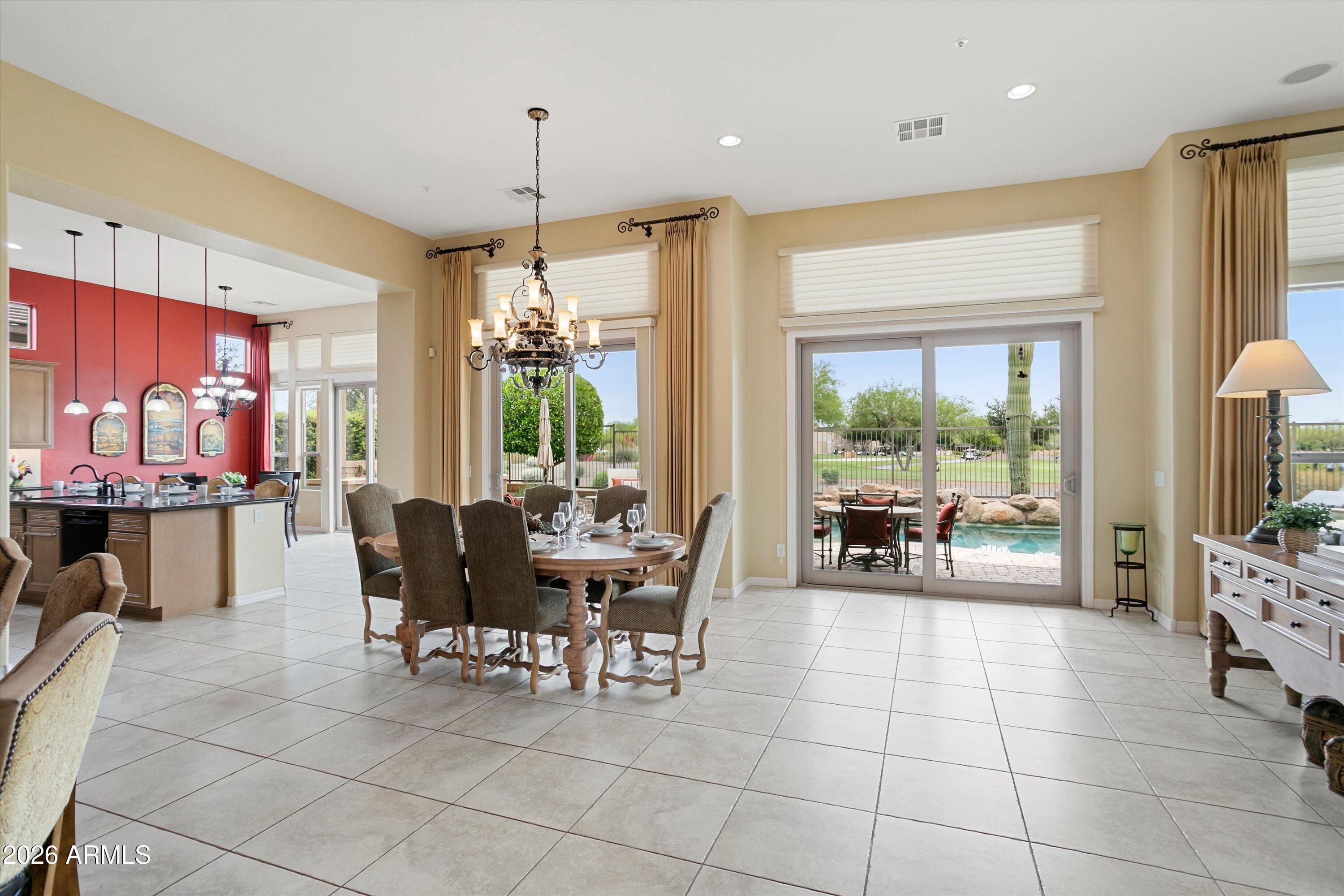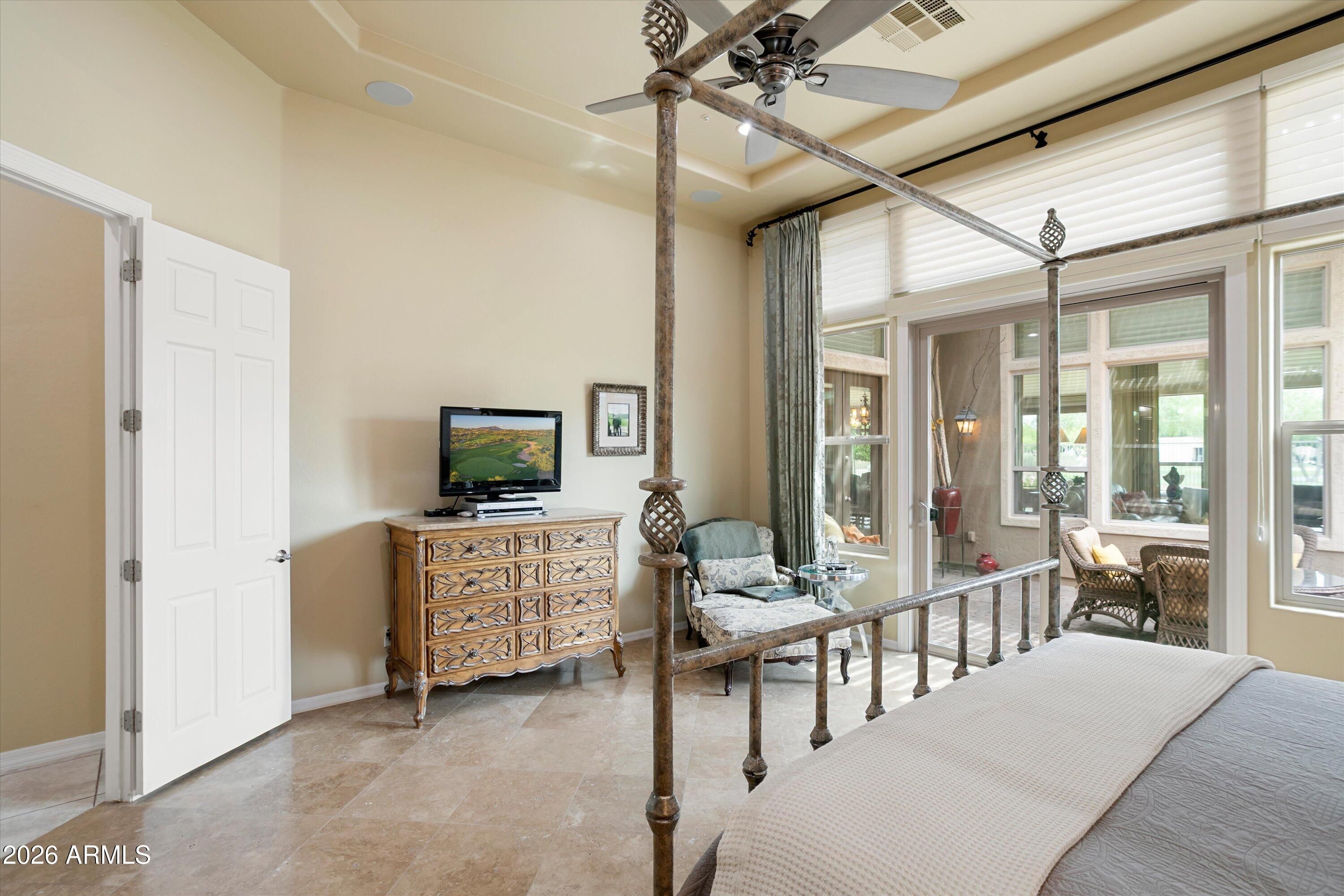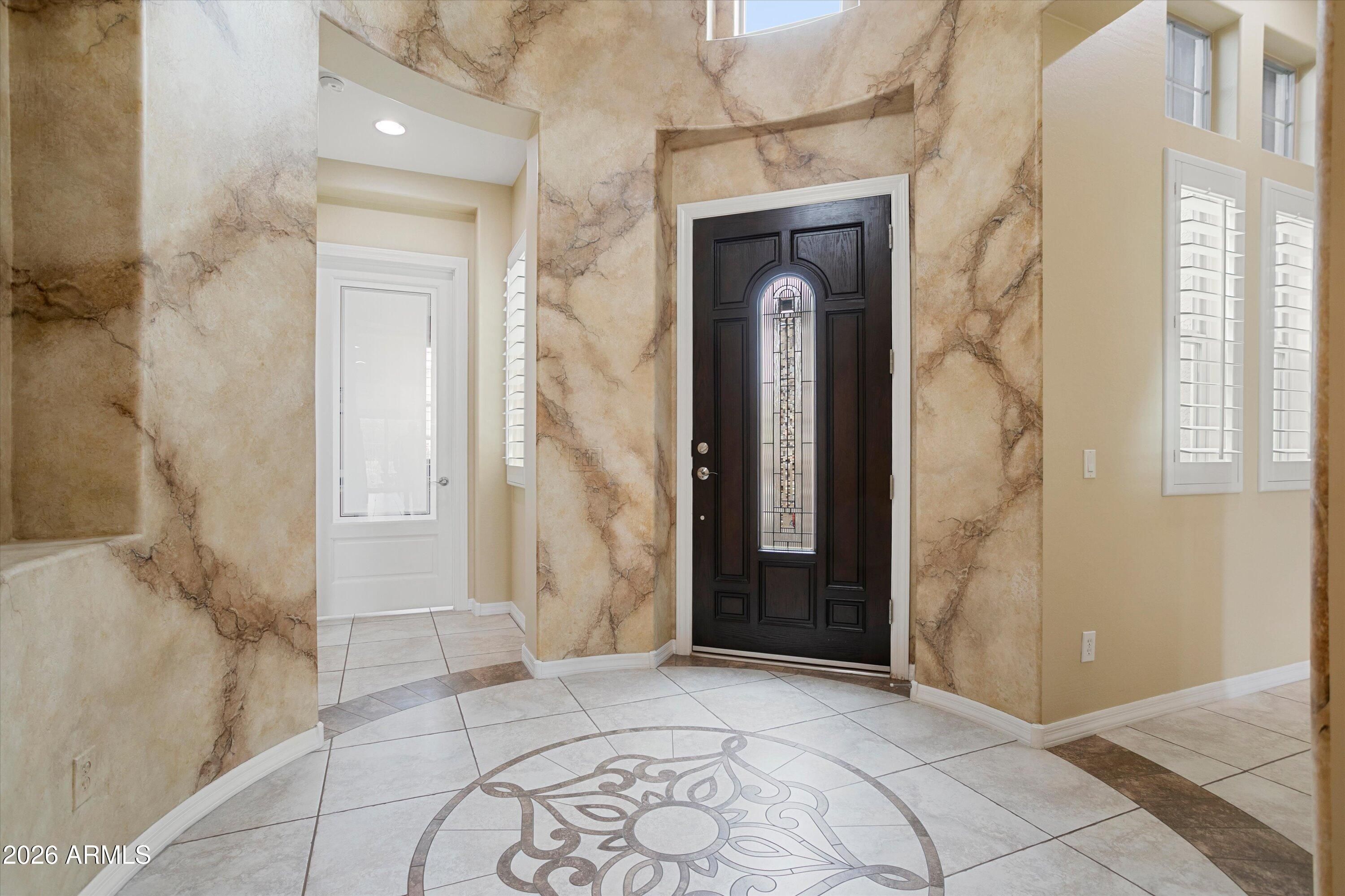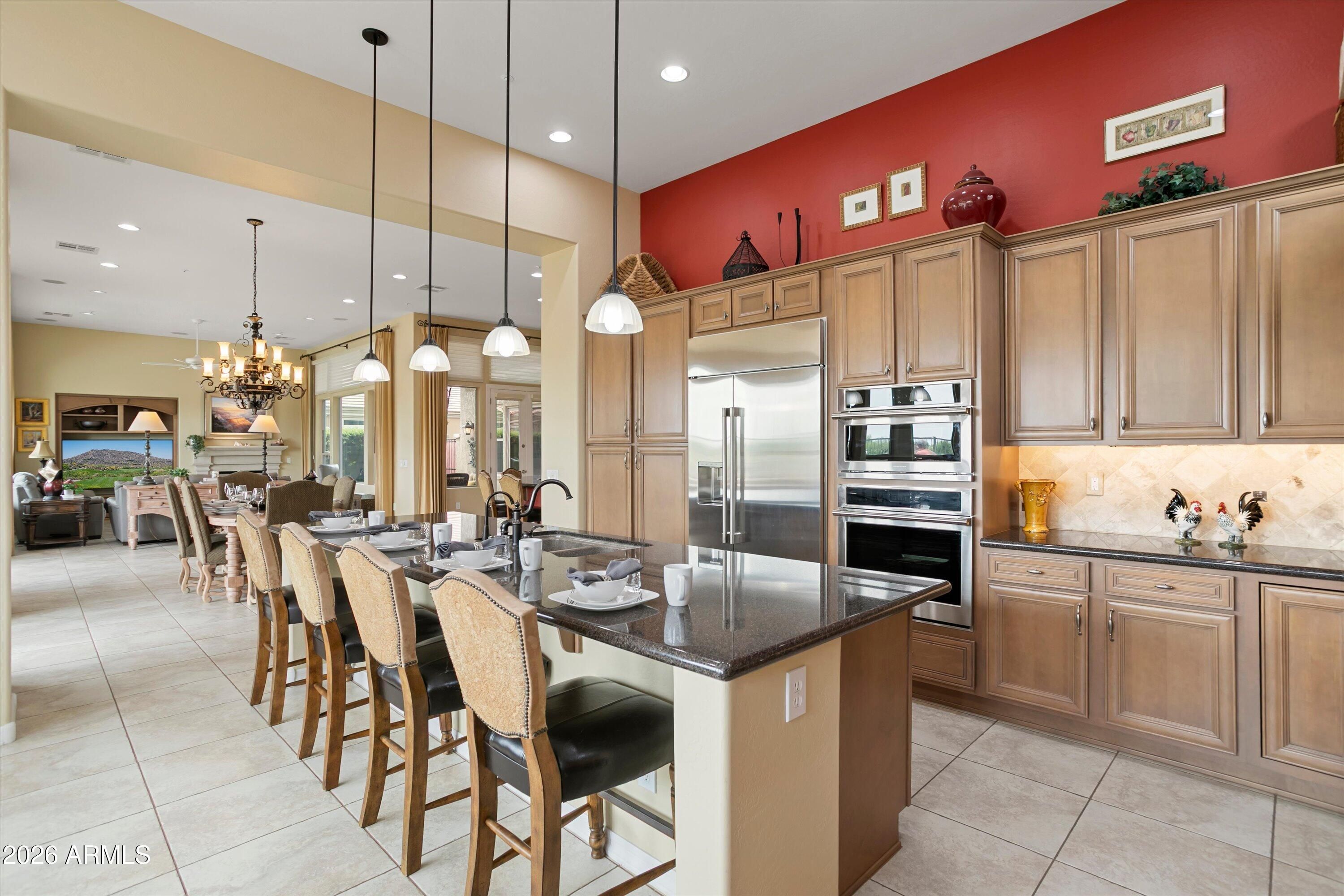 'RESORT' BACKYARD OASIS ON GOLF COURSE with heated POOL AND SPA. Stunning 'Stellare' ideal for indoor/outdoor entertaining and enhanced with MANY thoughtfully added updates beginning in 2021 including OWNED SOLAR! This elegant award-winning floor plan has soaring 12' CEILINGS, an expansive great room, gourmet kitchen with large morning room, 3 ENSUITE BEDROOMS plus half-bath, den & 2+1 garages, NO CARPETING. With golf views & dramatic SUNRISE & SUNSET views the backyard features a covered & a huge extended patio-both w/pavers, travertine pavers surrounding the pool w/waterfall & spillover spa, built-in BBQ island w/new Grand Turbo gas BBQ-2025, misters, custom landscaping & wrought iron fence. Extended side paver courtyard off the great room provides more outdoor living. Spacious chef's dream kitchen with extensive cabinetry & counter space, deluxe granite slab on counters & large island, GE Monogram stainless built-in appliances with five-burner cooktop surrounded by a focal-point decorative designer vent hood to the ceiling and a relaxing morning room surrounded with windows and a sliding glass door to the patio. Enjoy breakfast or morning coffee outdoors. The 38' long great room with an area for dining and sliding glass doors to the patio features a beautiful wet bar with seating & beverage refrigerator. The primary suite is spectacular with access to the side courtyard and paver path to the backyard, bay wall in the bedroom, attractively finished five-piece bath including jetted soaking tub & huge walk-in closet. The two attractive on-suite guest bedrooms and half bath are in a separate wing of the house. Updates since 2021 include OWNED SOLAR (9.84kW-average electric bills $63/month for past 12 months), two HVAC systems, mini-split in main garage, cabinets added to laundry room and both garages, tankless hot water heater, Hunter Douglas silhouette sheers, clearstory window coverings on remotes, custom window treatments, pergola over side courtyard, deluxe closet organizing system in primary suite, sunshade covering the pool equipment, door on den, & ceiling fans. Here is YOUR SPECTACULAR HOME. Located in award-winning gated, 55+ Trilogy at Vistancia with 5-star-resort style amenities at the 35,000 SF Kiva Club with indoor & outdoor pools, fitness center, day spa, cafe, billiards, meeting rooms, library, tennis courts, pickle ball, bocce ball, events & a plethora of activities to choose from. Outstanding Gary Panks-designed golf course is woven throughout the neighborhood. The Mita Club has additional community amenities. Easy access from Trilogy to the 303, shopping, restaurants, entertainment, Lake Pleasant & Paloma Park.