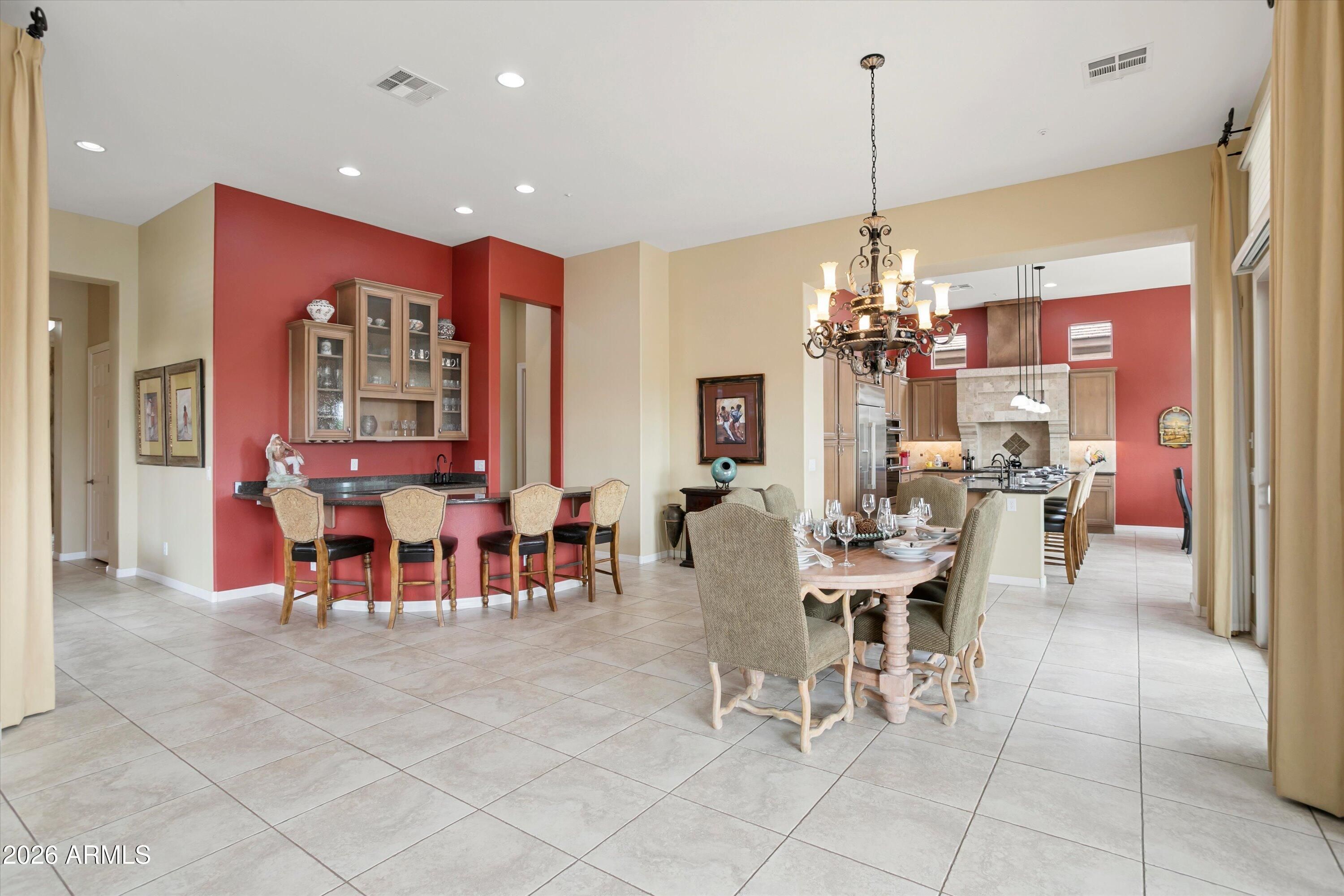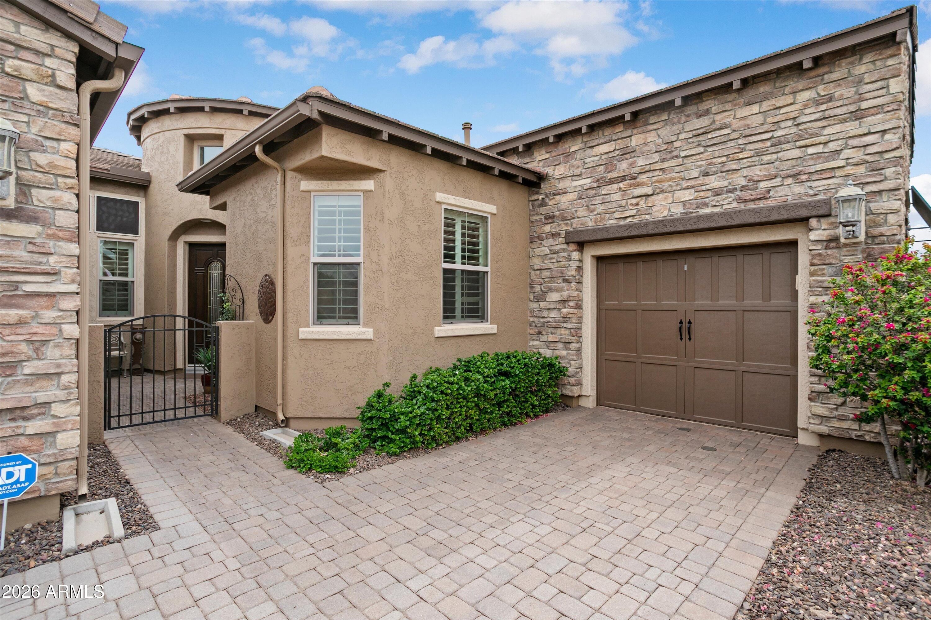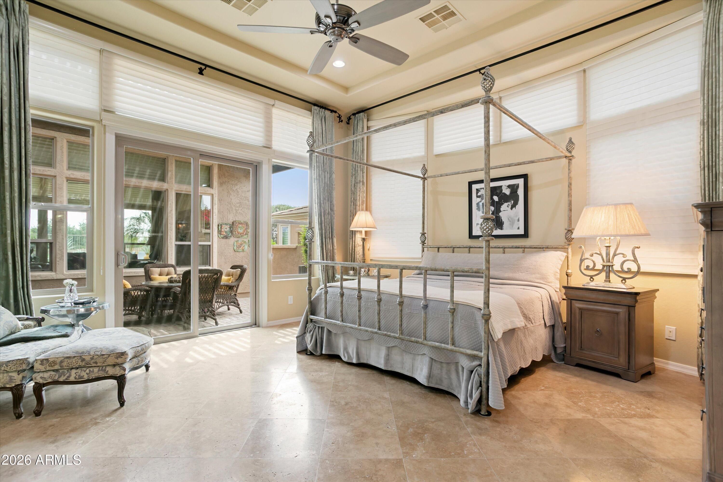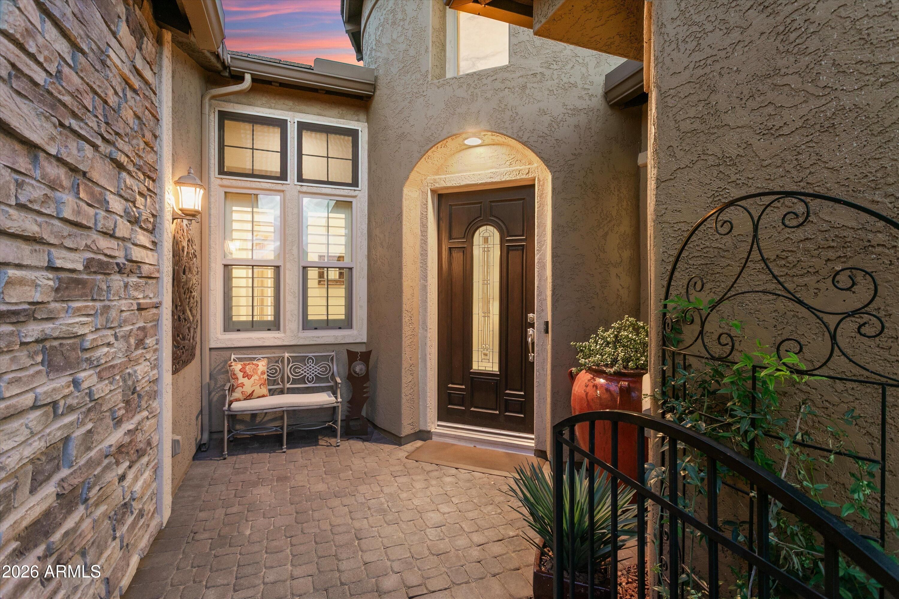 'RESORT' BACKYARD OASIS ON GOLF COURSE with heated POOL AND SPA. Stunning 'Stellare' ideal for indoor/outdoor entertaining and enhanced with MANY thoughtfully added updates beginning in 2021 including OWNED SOLAR! This elegant award-winning floor plan has soaring 12' CEILINGS, an expansive great room, gourmet kitchen with large morning room, 3 ENSUITE BEDROOMS plus half-bath, den & 2+1 garages, NO CARPETING. With golf views & dramatic SUNRISE & SUNSET views the backyard features a covered & a huge extended patio-both w/pavers, travertine pavers surrounding the pool w/waterfall & spillover spa, built-in BBQ island w/new Grand Turbo gas BBQ-2025, misters, custom landscaping & wrought iron fence. Extended side paver courtyard off the great room provides more outdoor living. Spacious chef's dream kitchen with extensive cabinetry & counter space, deluxe granite slab on counters & large island, GE Monogram stainless built-in appliances with five-burner cooktop surrounded by a focal-point decorative designer vent hood to the ceiling and a relaxing morning room surrounded with windows and a sliding glass door to the patio. Enjoy breakfast or morning coffee outdoors. The 38' long great room with an area for dining and sliding glass doors to the patio features a beautiful wet bar with seating & beverage refrigerator. The primary suite is spectacular with access to the side courtyard and paver path to the backyard, bay wall in the bedroom, attractively finished five-piece bath including jetted soaking tub & huge walk-in closet. The two attractive on-suite guest bedrooms and half bath are in a separate wing of the house. Updates since 2021 include OWNED SOLAR (9.84kW-average electric bills $63/month for past 12 months), two HVAC systems, mini-split in main garage, cabinets added to laundry room and both garages, tankless hot water heater, Hunter Douglas silhouette sheers, clearstory window coverings on remotes, custom window treatments, pergola over side courtyard, deluxe closet organizing system in primary suite, sunshade covering the pool equipment, door on den, & ceiling fans. Here is YOUR SPECTACULAR HOME. Located in award-winning gated, 55+ Trilogy at Vistancia with 5-star-resort style amenities at the 35,000 SF Kiva Club with indoor & outdoor pools, fitness center, day spa, cafe, billiards, meeting rooms, library, tennis courts, pickle ball, bocce ball, events & a plethora of activities to choose from. Outstanding Gary Panks-designed golf course is woven throughout the neighborhood. The Mita Club has additional community amenities. Easy access from Trilogy to the 303, shopping, restaurants, entertainment, Lake Pleasant & Paloma Park.