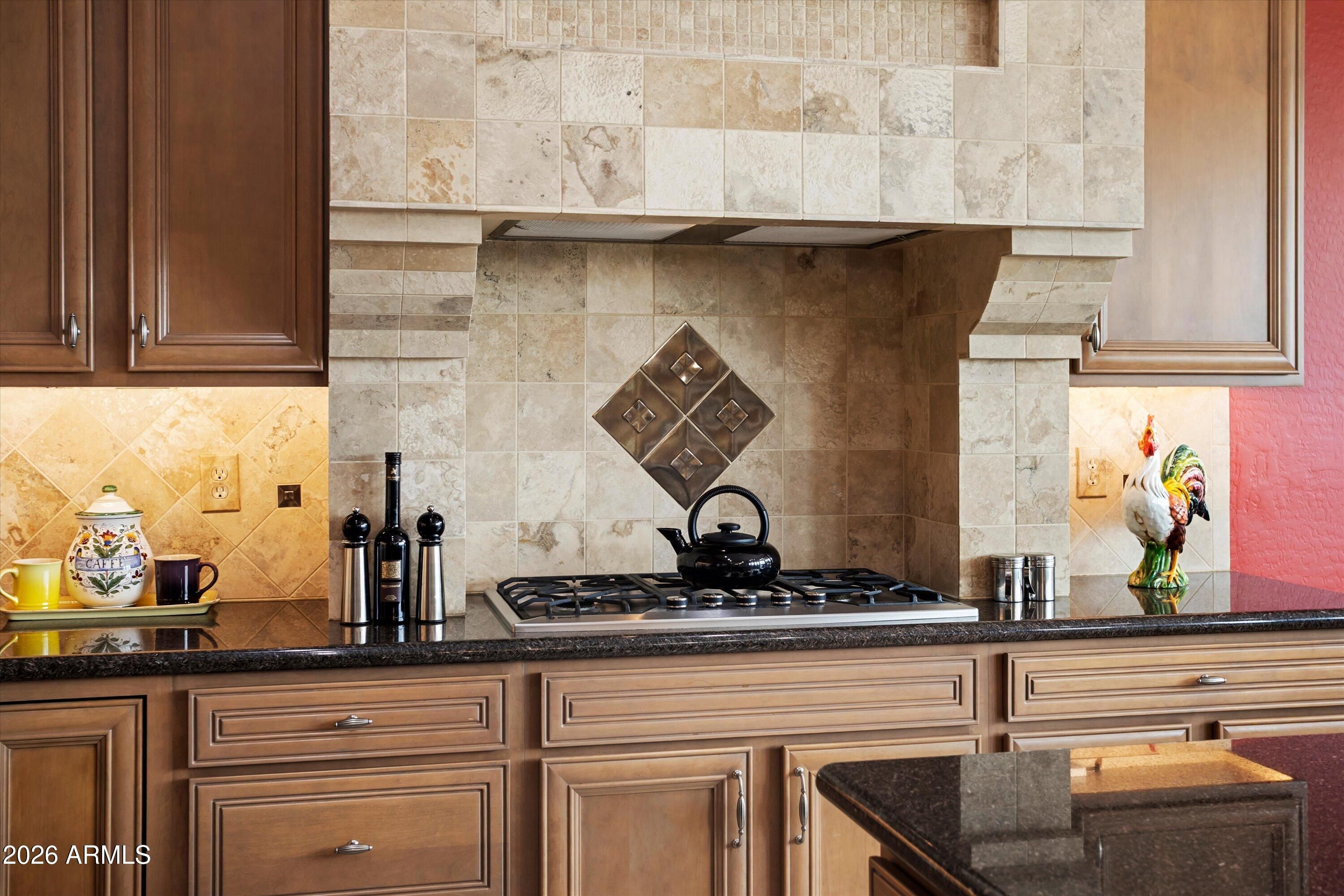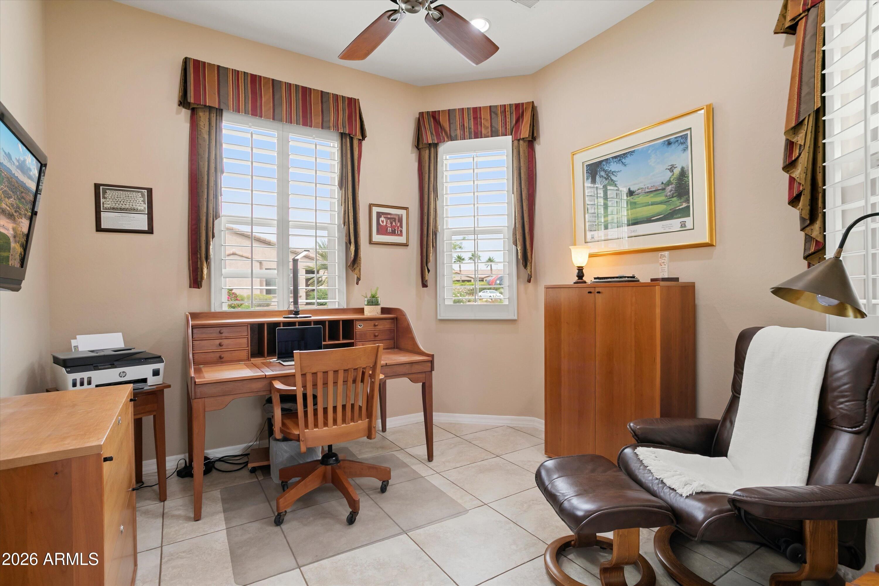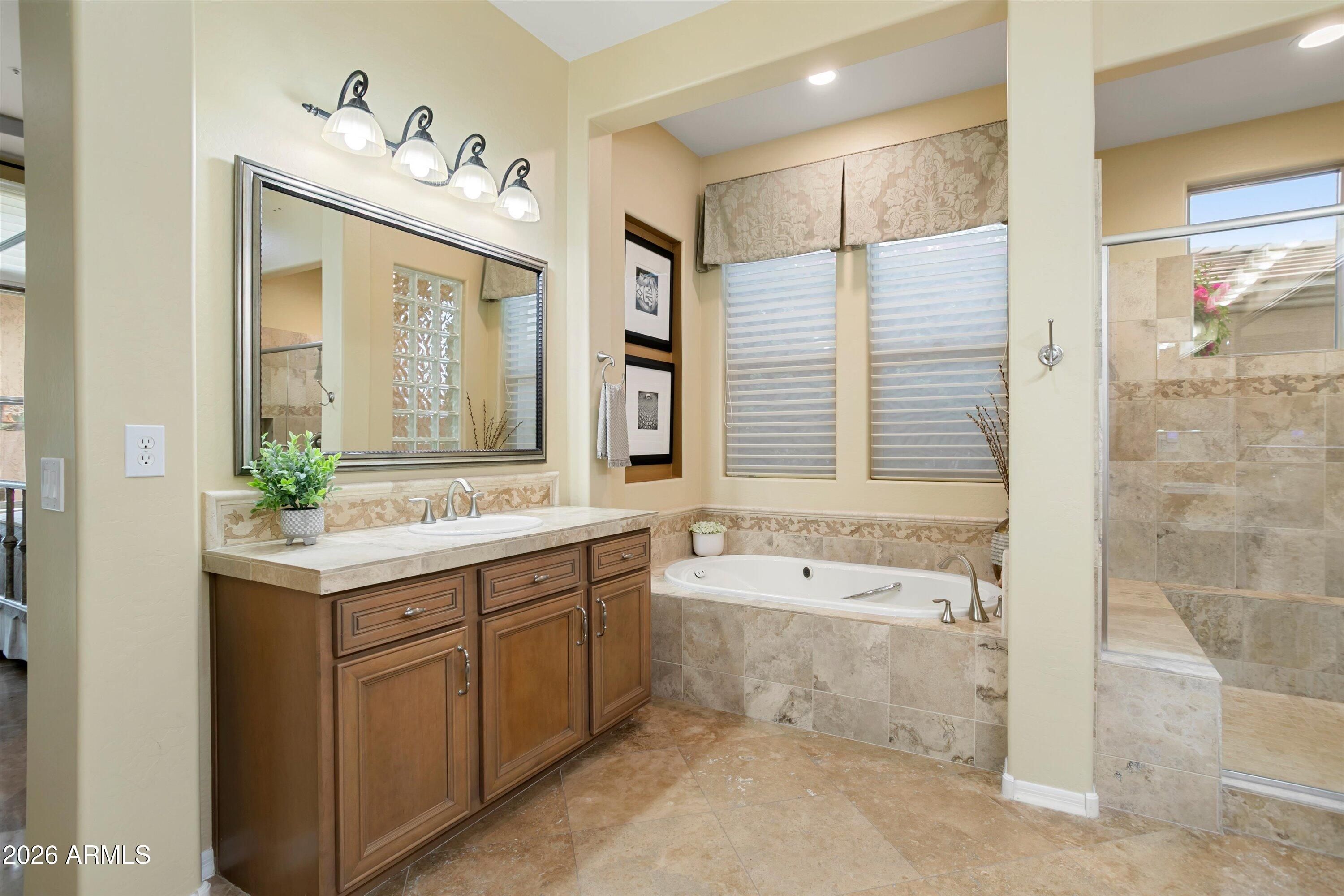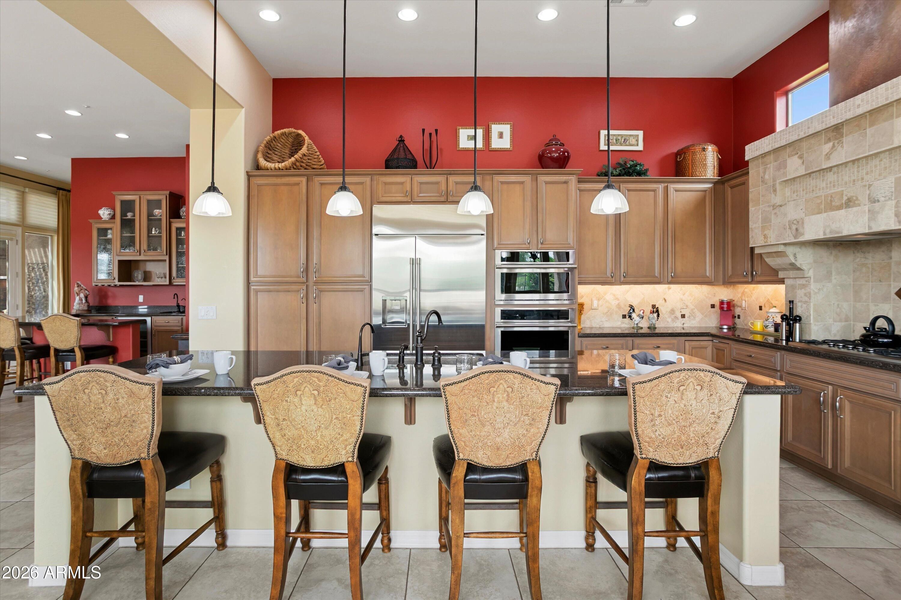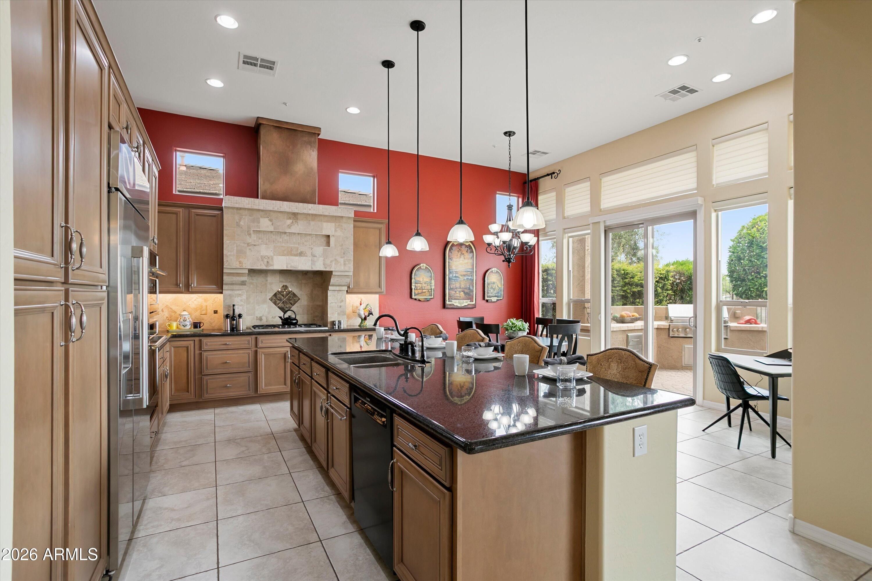'RESORT' BACKYARD OASIS ON GOLF COURSE with heated POOL AND SPA. Stunning 'Stellare' ideal for indoor/outdoor entertaining and enhanced with MANY thoughtfully added updates beginning in 2021 including OWNED SOLAR! This elegant award-winning floor plan has soaring 12' CEILINGS, an expansive great room, gourmet kitchen with large morning room, 3 ENSUITE BEDROOMS plus half-bath, den & 2+1 garages, NO CARPETING. With golf views & dramatic SUNRISE & SUNSET views the backyard features a covered & a huge extended patio-both w/pavers, travertine pavers surrounding the pool w/waterfall & spillover spa, built-in BBQ island w/new Grand Turbo gas BBQ-2025, misters, custom landscaping & wrought iron fence. Extended side paver courtyard off the great room provides more outdoor living. Spacious chef's dream kitchen with extensive cabinetry & counter space, deluxe granite slab on counters & large island, GE Monogram stainless built-in appliances with five-burner cooktop surrounded by a focal-point decorative designer vent hood to the ceiling and a relaxing morning room surrounded with windows and a sliding glass door to the patio. Enjoy breakfast or morning coffee outdoors. The 38' long great room with an area for dining and sliding glass doors to the patio features a beautiful wet bar with seating & beverage refrigerator. The primary suite is spectacular with access to the side courtyard and paver path to the backyard, bay wall in the bedroom, attractively finished five-piece bath including jetted soaking tub & huge walk-in closet. The two attractive on-suite guest bedrooms and half bath are in a separate wing of the house. Updates since 2021 include OWNED SOLAR (9.84kW-average electric bills $63/month for past 12 months), two HVAC systems, mini-split in main garage, cabinets added to laundry room and both garages, tankless hot water heater, Hunter Douglas silhouette sheers, clearstory window coverings on remotes, custom window treatments, pergola over side courtyard, deluxe closet organizing system in primary suite, sunshade covering the pool equipment, door on den, & ceiling fans. Here is YOUR SPECTACULAR HOME. Located in award-winning gated, 55+ Trilogy at Vistancia with 5-star-resort style amenities at the 35,000 SF Kiva Club with indoor & outdoor pools, fitness center, day spa, cafe, billiards, meeting rooms, library, tennis courts, pickle ball, bocce ball, events & a plethora of activities to choose from. Outstanding Gary Panks-designed golf course is woven throughout the neighborhood. The Mita Club has additional community amenities. Easy access from Trilogy to the 303, shopping, restaurants, entertainment, Lake Pleasant & Paloma Park.