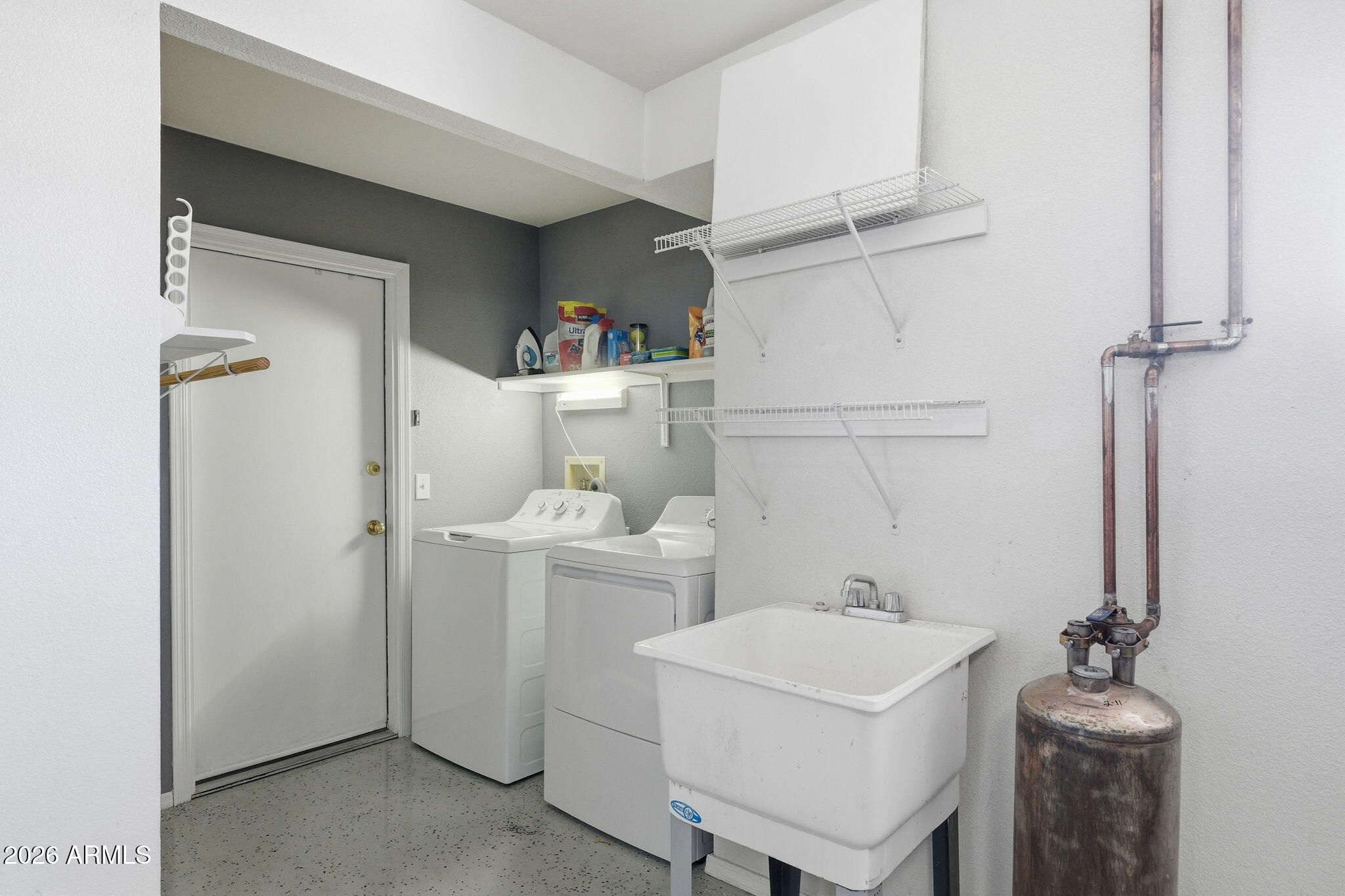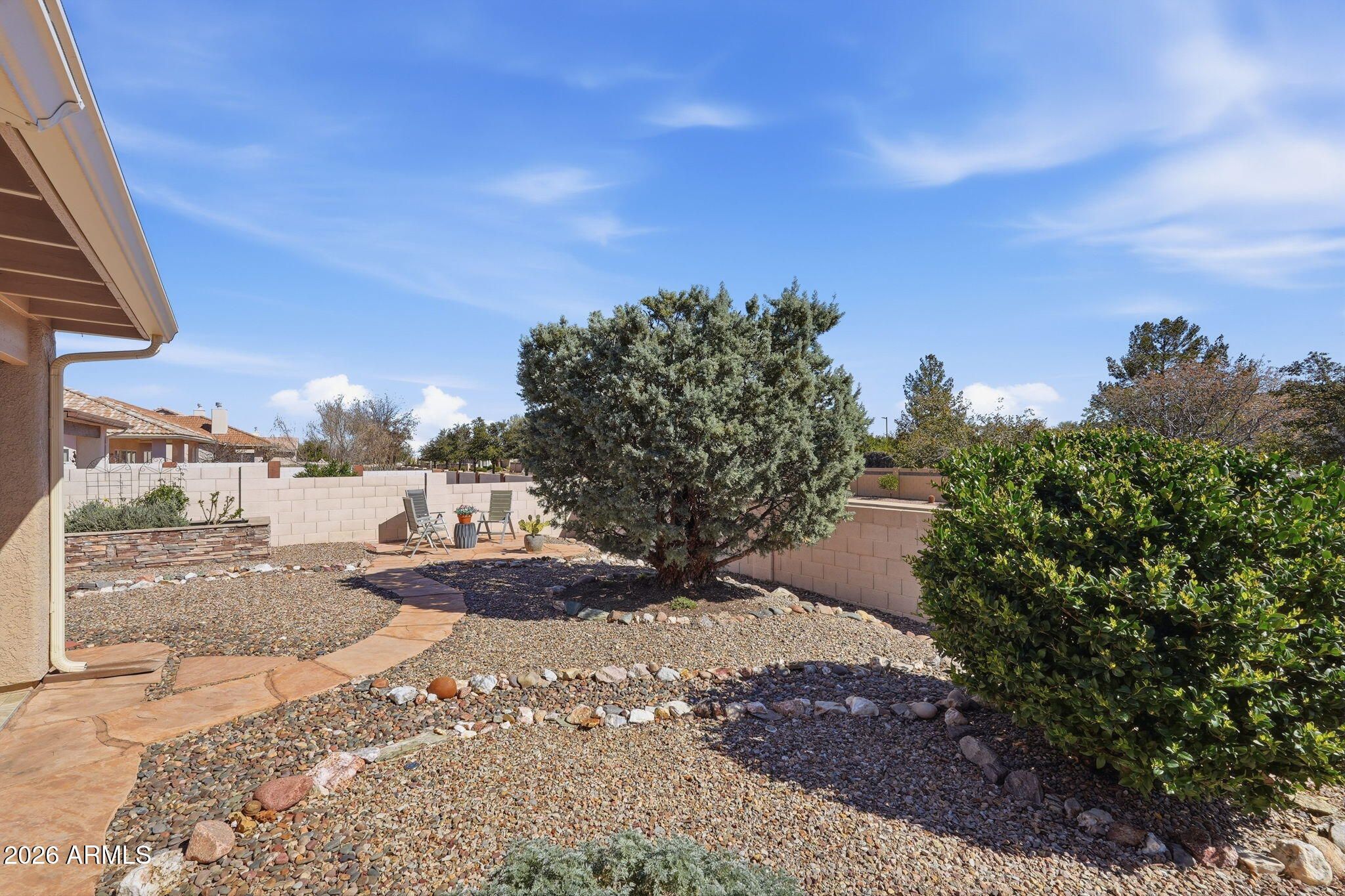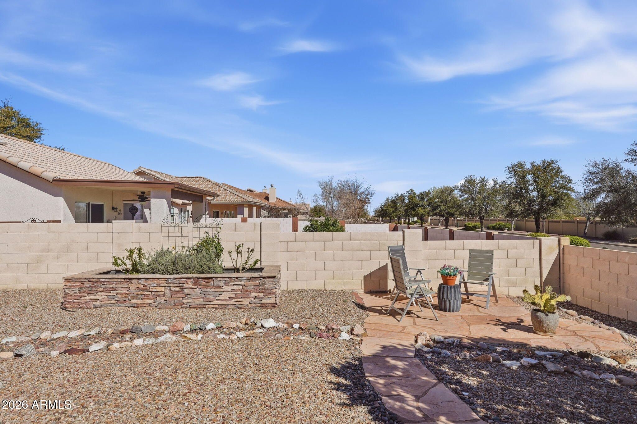 Arizona living at its best in the highly desirable 55+ gated community of Winterhaven. Move-in ready split floor plan with upgrades throughout including tile flooring, sunscreens on exterior windows, and a new HVAC (2025). Kitchen features stainless steel appliances and granite countertops. Washer and Dryer with a laundry sink are also included. The spacious primary suite has a walk-in closet, double sinks, large garden tub, and a separate shower. Step outside to your covered patio oasis, perfect for relaxing or entertaining, surrounded by beautiful low-maintenance desert landscaping. The neighborhood offers a community pool, clubhouse, pickleball and many other activities. A wonderful opportunity in a welcoming adult community. See it today!