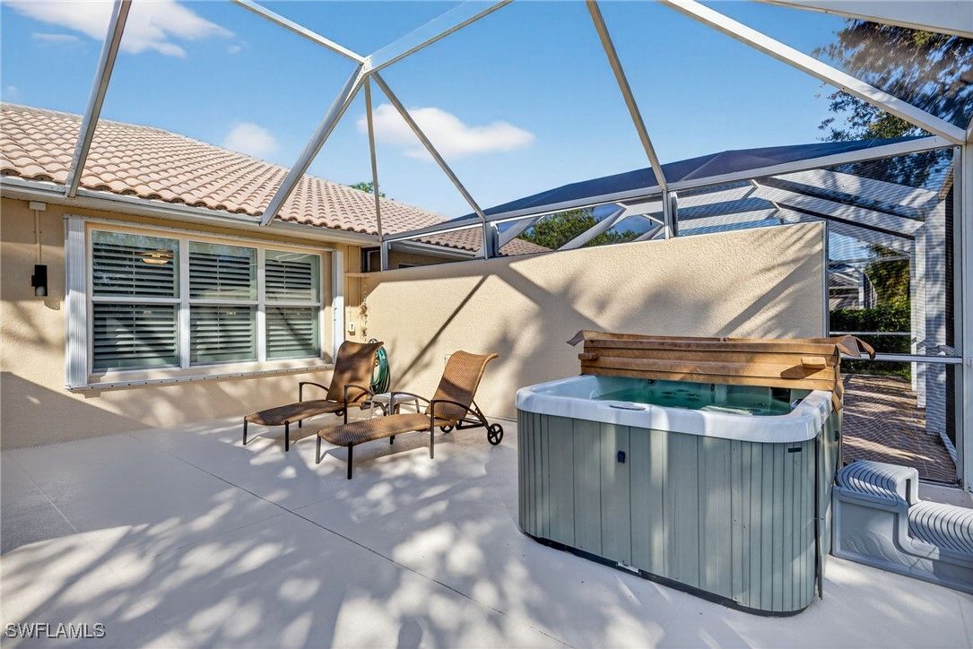 Come LIVE PLAY & RELAX in the amazing community of VillageWalk of Bonita. This desirable and rarely available Carrington floor plan is an attached villa with 3BR 2BA and a 2-car garage. You will love the private backyard oasis with its extended lanai that overlooks a stunning lake view, the perfect spot to relax in the hot tub, soak up the sun, host barbeques and entertain all your family and friends while enjoying our beautiful weather. Natural light fills the home through a glass front entry and numerous windows adorned with plantation shutters. The vaulted ceiling and Florida-inspired color palette create a bright, open atmosphere. The kitchen is nicely appointed with wood cabinets, a single bowl sink with a hands-free faucet, white appliances and functional Quartz countertops. Owners’ suite is generous in size, features a walk-in closet, a stylish bath with a Quartz countertop and a convenient walk-in shower with frameless shower door. Laundry has convenient storage shelves and handy utility sink. Enjoy peace of mind with easy-to-use hurricane protection, including electric and accordion hurricane shutters. Plus, a brand-new HVAC installed in 2024 ensures your comfort all year round. Xenon is just a short walk, bike or golf cart ride to the amenity rich town center that offers something for everyone: resort style & lap pools, 24/7 fitness center, lighted Har-Tru tennis courts, pickleball center and bocce all with active leagues. In addition, there is a lighted basketball court, tot lot, full-service restaurant w/indoor and outdoor dining, beauty salon, bagel shop, spa, ice cream shop, and lots of planned activities by the full-time activities director. VillageWalk of Bonita is unique with it’s pretty butterfly gardens, miles of lakes, sidewalks, walkways over connecting bridges and impressive wildlife. It’s a great location to our beautiful sandy beaches, SW Florida International Airport, shopping and entertainment destinations. Guard gated, golf cart and pet friendly. Make your showing today as this is Florida Living at its best and the perfect place to call home!