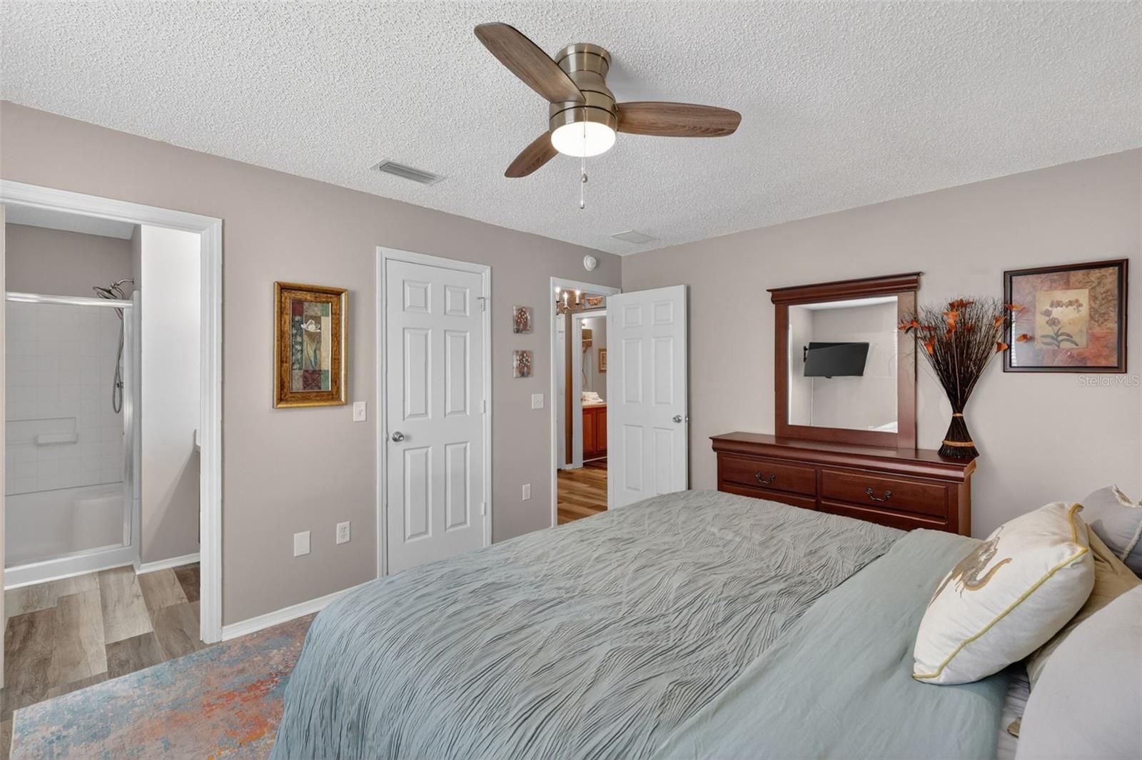 - Ceiling Fan(s), Eat-in Kitchen, Living/Dining Room, Open Floorplan, Main Level Primary, Thermostat, Walk-In Closet(s)