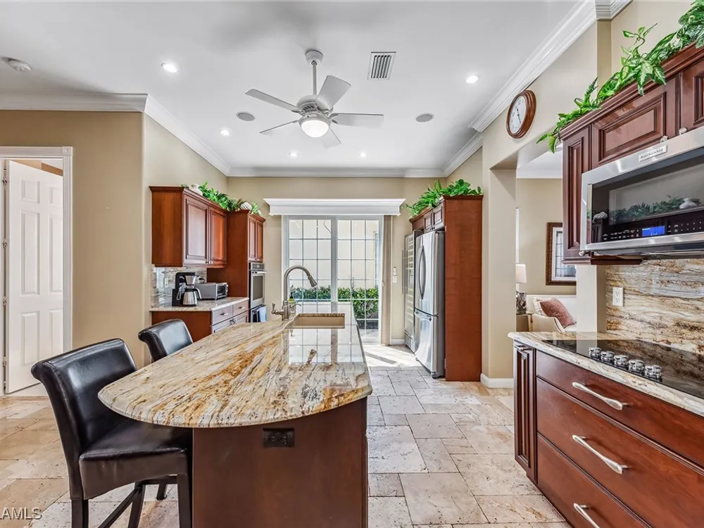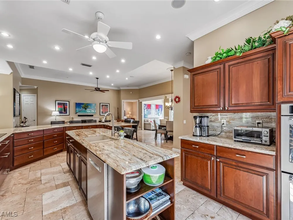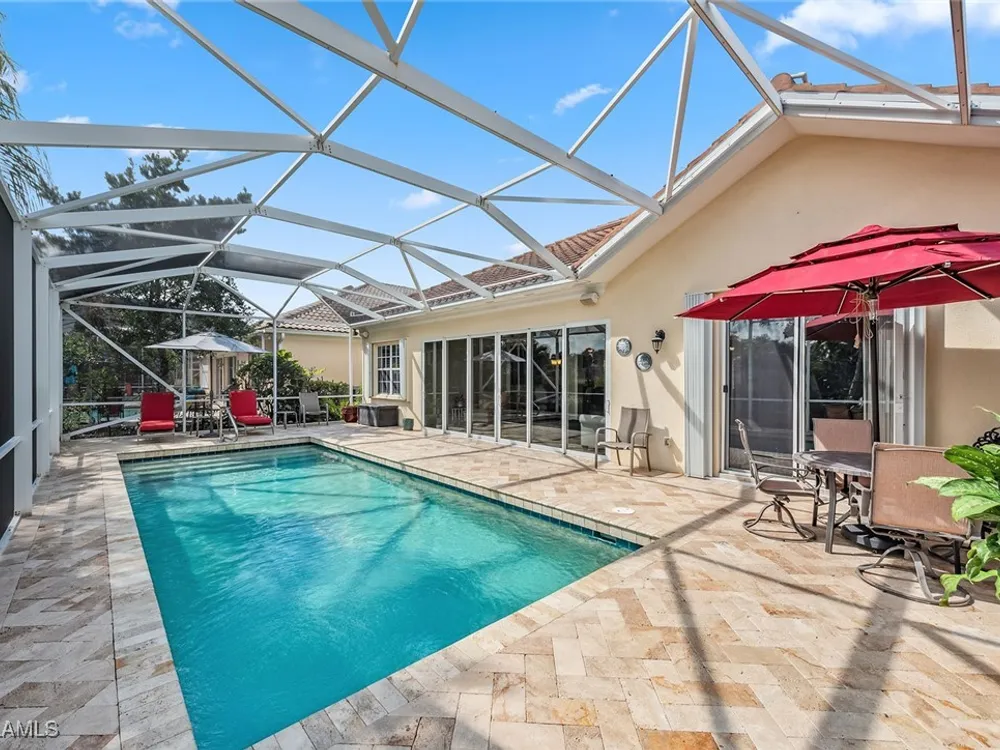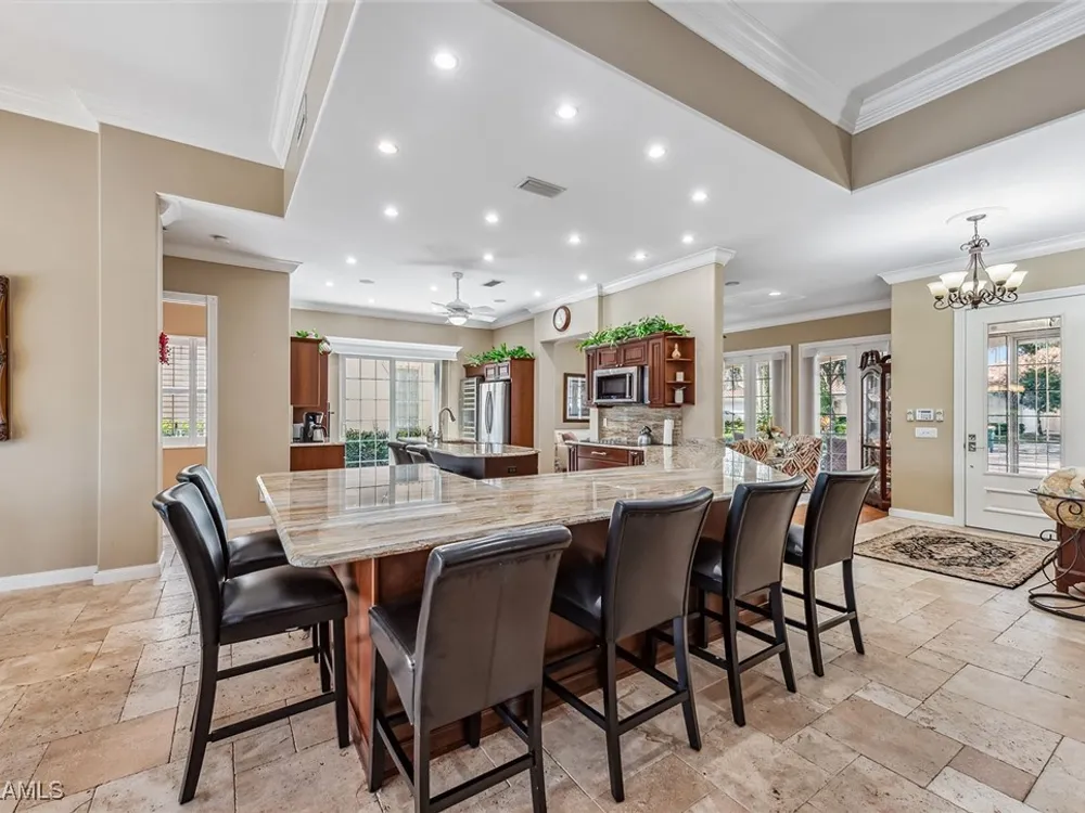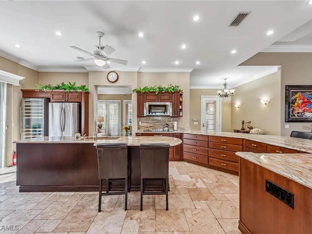 This home will make you the envy of all your neighbors with its extraordinary floor plan improvements and upgrades! Spacious and magnificent, this home strikes a tone. It’s one of a kind. Completely renovated Carlyle pool home features a custom, high-end chef's kitchen featuring self-closing cabinets, quality stainless steel appliances, large flat top granite countertops, large island and it lends itself to the ultimate modern, open floor plan. This home boasts custom, travertine stone flooring throughout and onto the lanai, and is nicely complemented by hardwood bamboo flooring in the flex room and primary bedroom. Crown molding, surround sound and custom cabinets finetune your place in the sun. Granite tops in all the baths, additional custom side-patio off the kitchen with awning. An extra wide driveway further serves your convenience as upgrade. New roof in 2019. New wall oven and new dishwasher in 2018. New refrigerator in 2019. New cooktop in 2019. New washer and dryer in 2021.