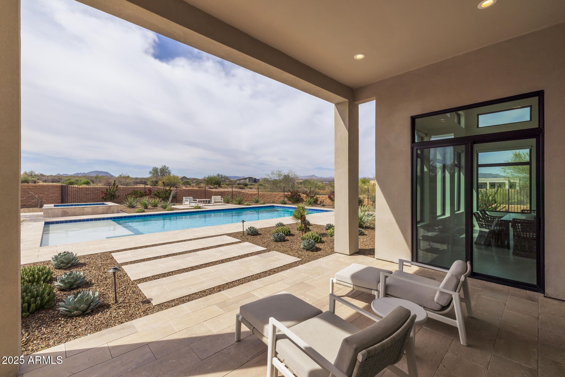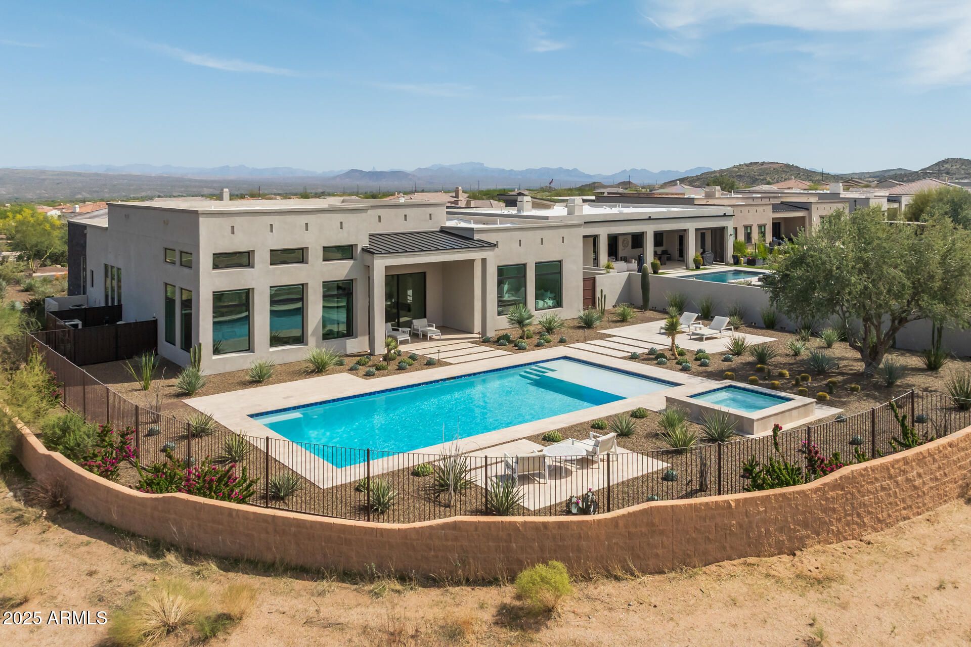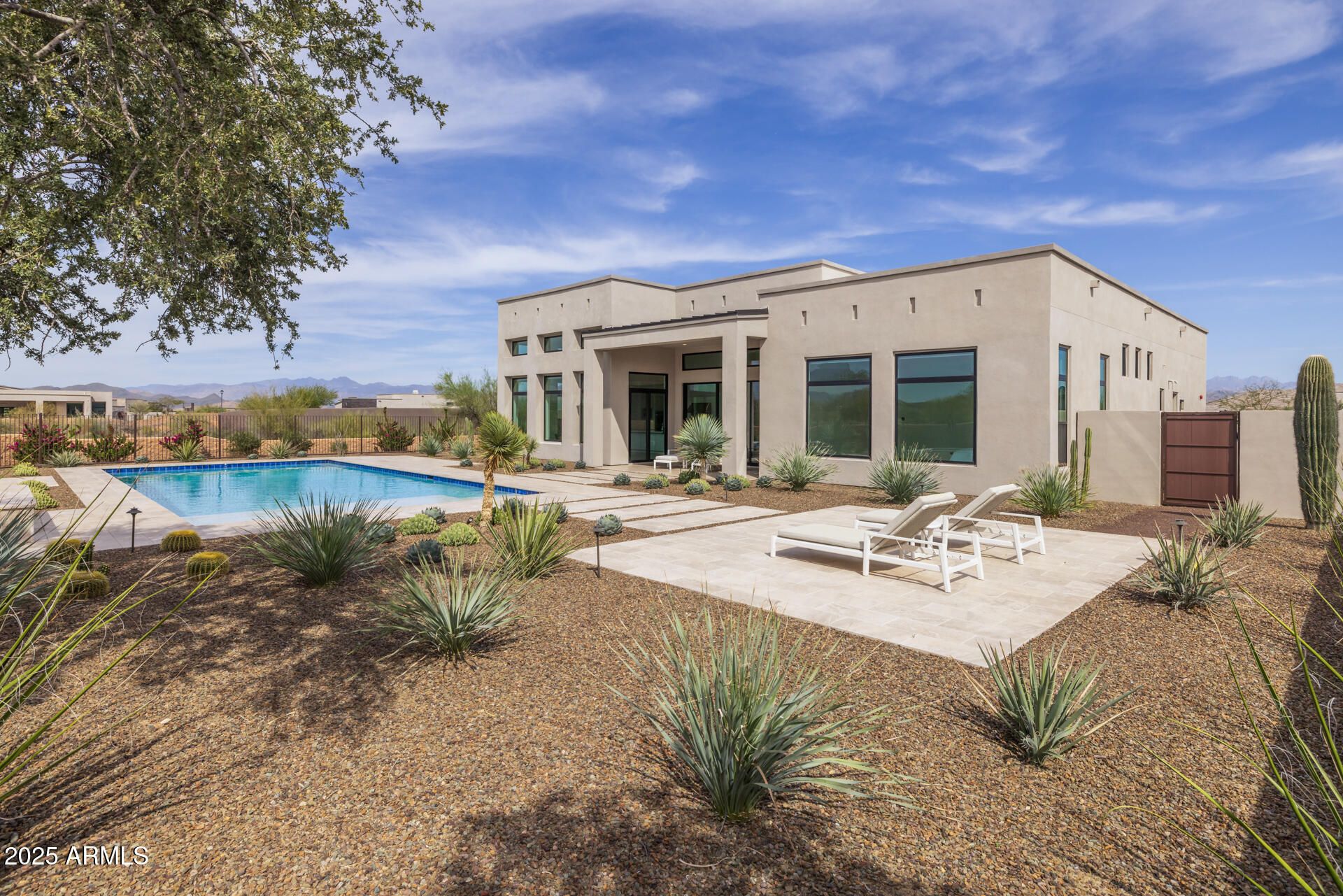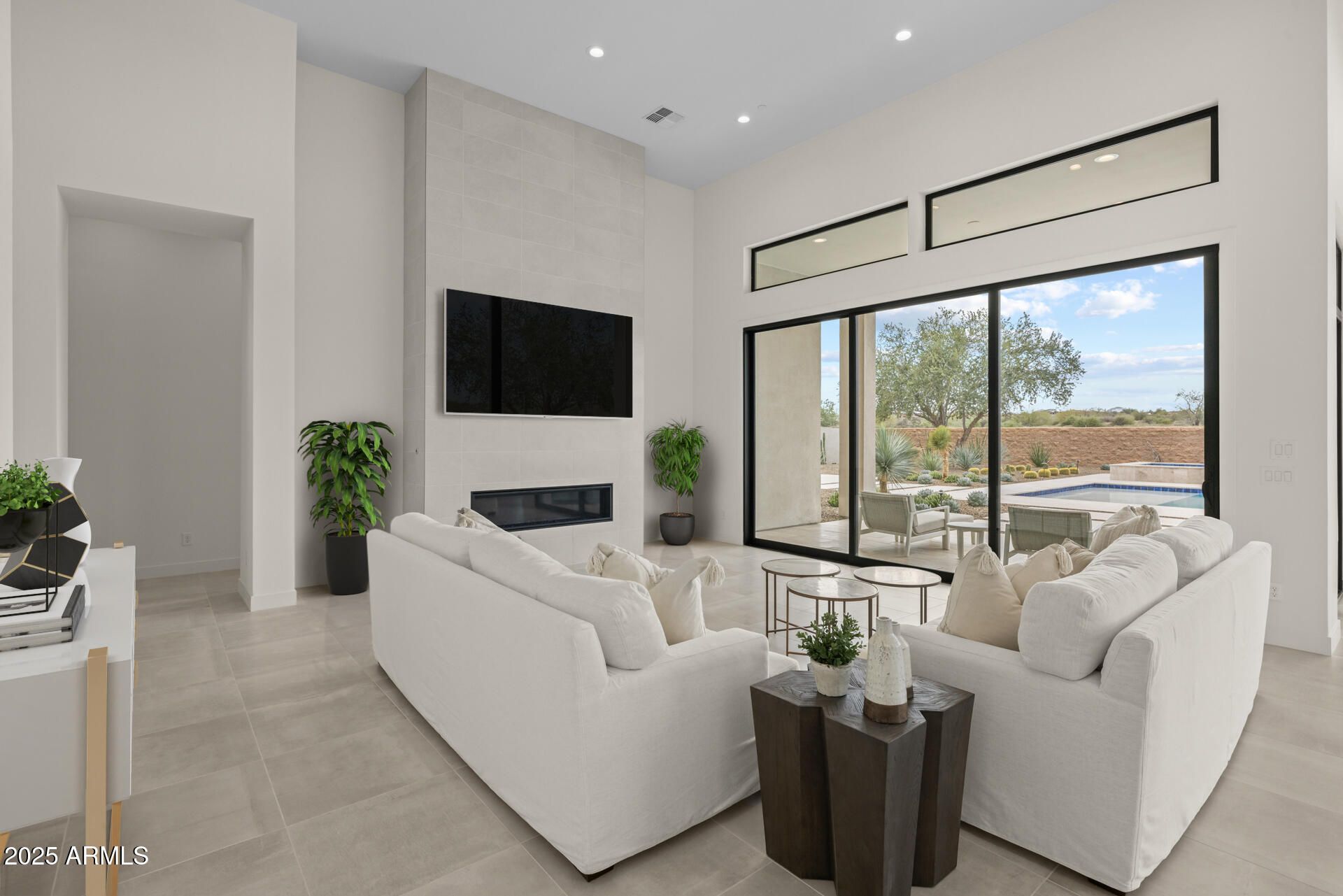 Welcome to this stunning modern home in the desirable Trilogy at Verde River, offering a sleek architectural design, a spacious three-car garage with epoxy flooring, and an extended pavered driveway, all complemented by a meticulously landscaped front yard with perfectly placed desert plants for stunning curb appeal. The Cataloni layout features 3-bedroom retreats each with their own ensuite, plus a den and an office for flexible living. Luxurious 24X24 tile spans the entire home, complemented by the practicality of electric shades. The kitchen is a masterpiece with upgraded stacked cabinetry, built-in stainless steel appliances, double ovens, a walk-in pantry, and a spacious island breakfast bar. In the great room, a multi-sliding glass door opens to reveal mountain views, complemented by a floor-to-ceiling tile fireplace. The primary ensuite is a sanctuary with a soaking tub, separate shower, dual floating vanities, custom mirrors, and a walk-in closet. Step outside to your resort-style backyard with a covered patio, travertine steps, travertine pool deck, and spa. Enjoy meticulously landscaped Sonoran desert plants while soaking in the views and sunsets. Come see this exquisite home for yourself! The amenities at Verde River are World Class with Tom Lehman inspired eighteen-hole Golf course, tennis courts, pickleball courts, and bocce ball, heated lap pool and Resort style swimming pool, hot tub, Afterburn fitness center, Helen's demonstration Kitchen for cooking classes and a 7.5 acre dog park. The community center has casual poolside dining at Eddy's Diner and gourmet dining at award-winning Needle Rock Kitchen and Tap, Alvea Spa with full-service Salon and Spa amenities, Art Loft and events center. Trilogy at Verde River is adjacent to the Tonto National Forest and is situated in the middle of miles and miles of hiking and biking trails.