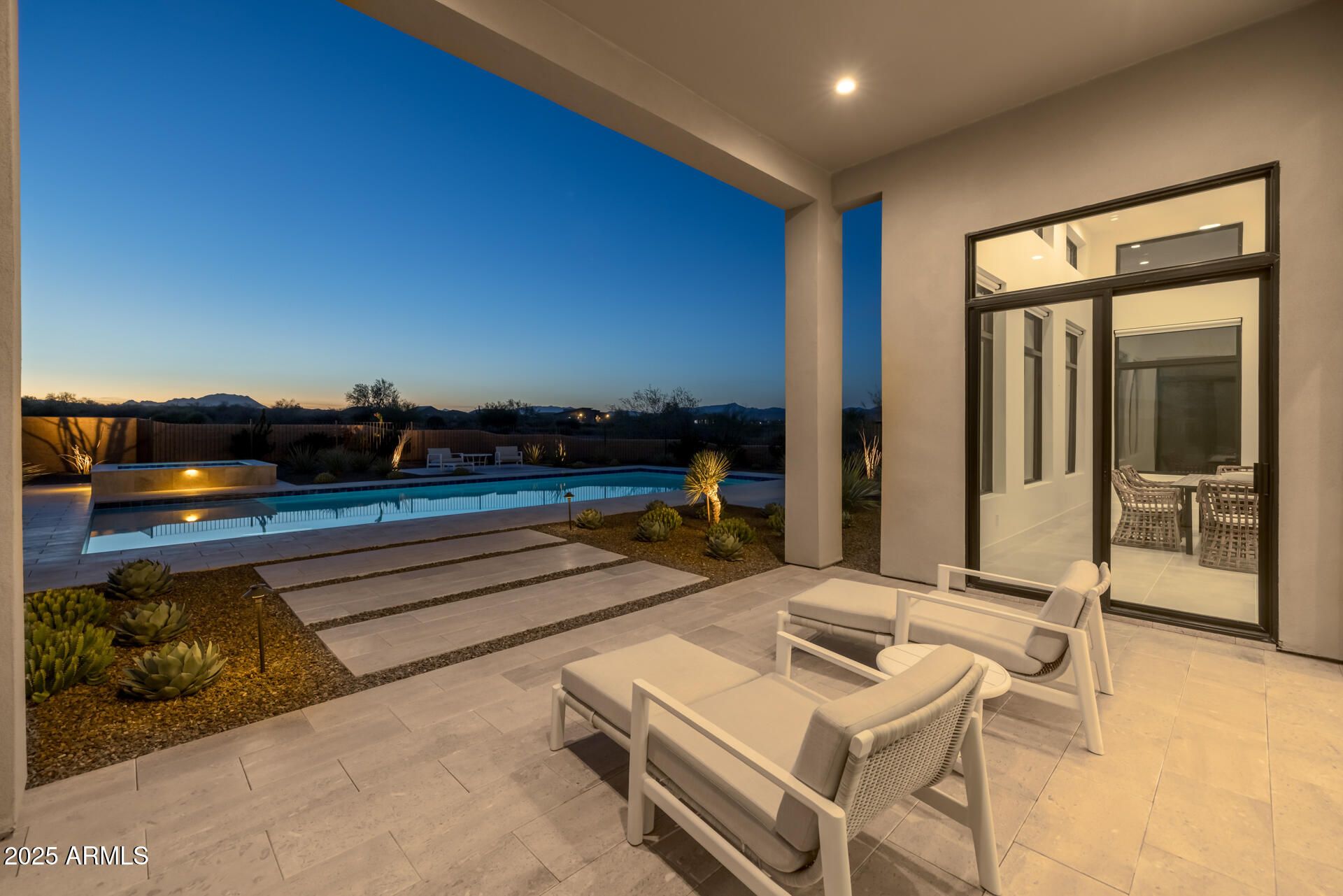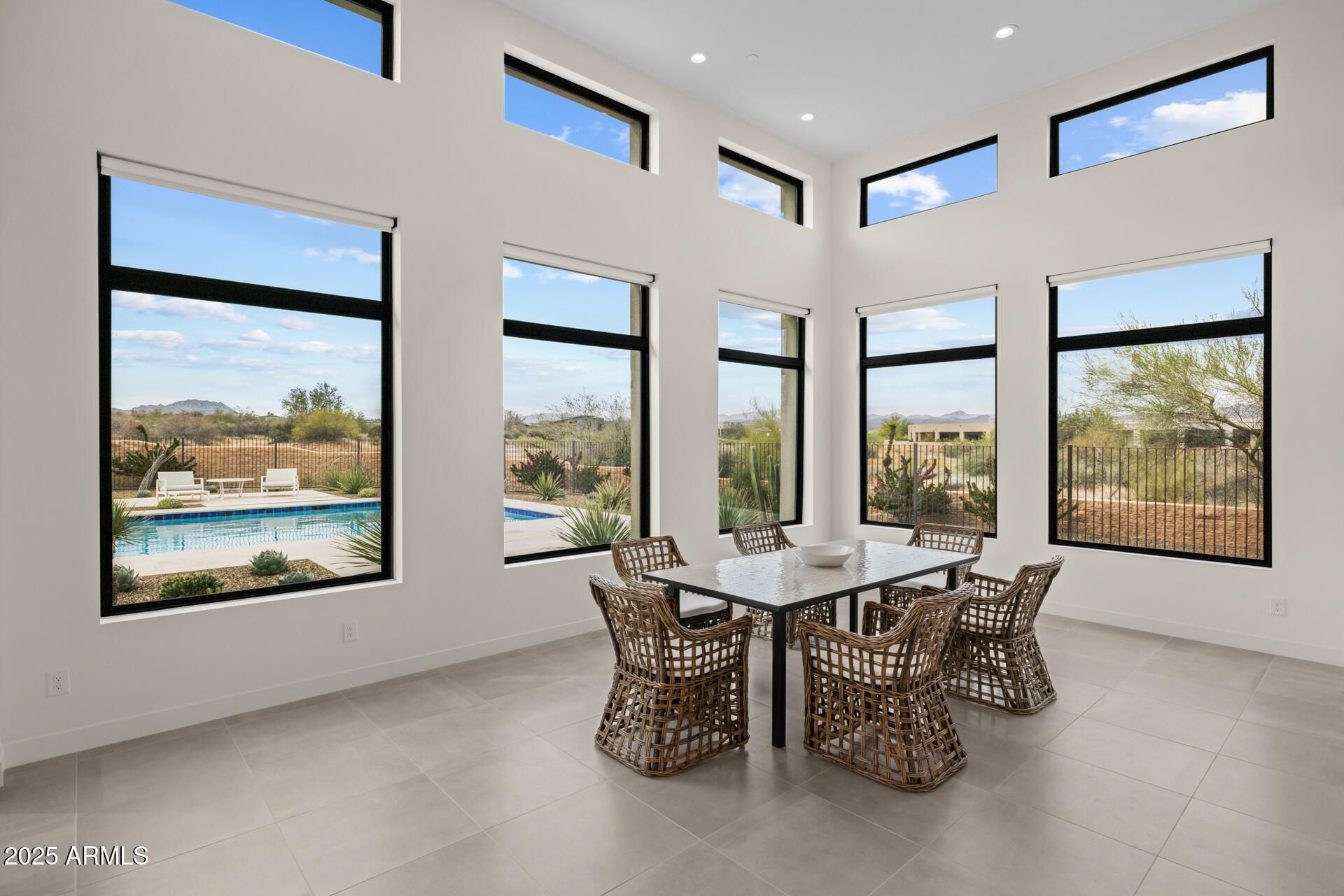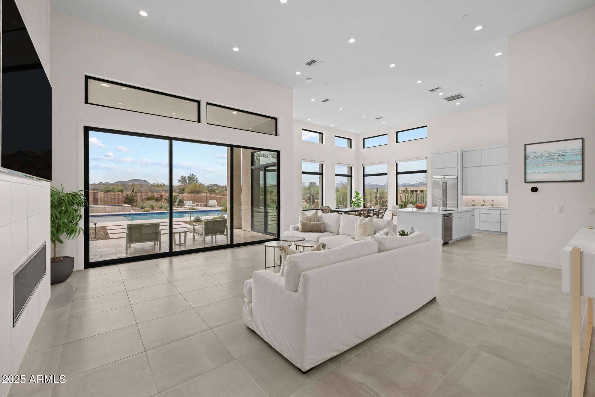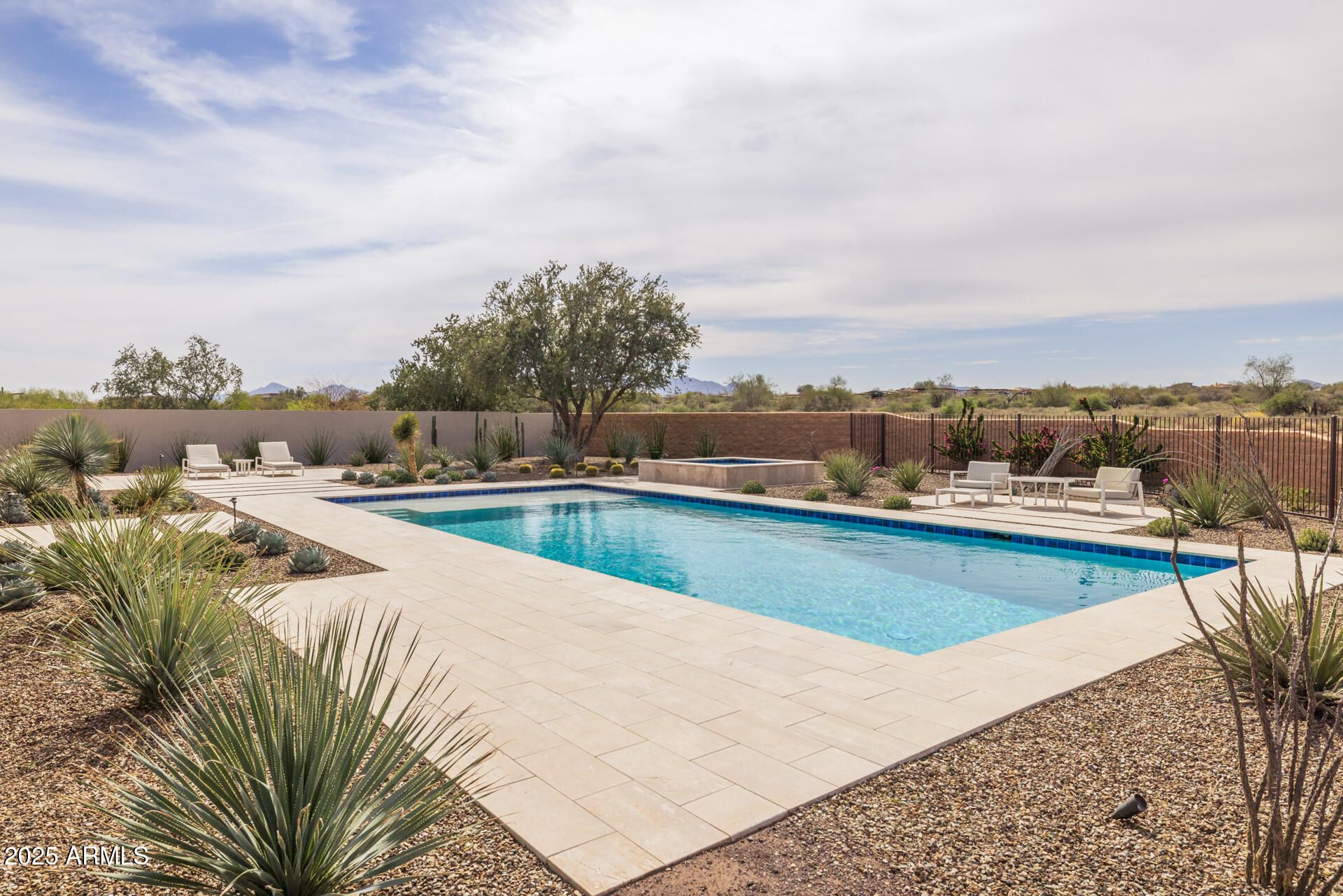 Welcome to this stunning modern home in the desirable Trilogy at Verde River, offering a sleek architectural design, a spacious three-car garage with epoxy flooring, and an extended pavered driveway, all complemented by a meticulously landscaped front yard with perfectly placed desert plants for stunning curb appeal. The Cataloni layout features 3-bedroom retreats each with their own ensuite, plus a den and an office for flexible living. Luxurious 24X24 tile spans the entire home, complemented by the practicality of electric shades. The kitchen is a masterpiece with upgraded stacked cabinetry, built-in stainless steel appliances, double ovens, a walk-in pantry, and a spacious island breakfast bar. In the great room, a multi-sliding glass door opens to reveal mountain views, complemented by a floor-to-ceiling tile fireplace. The primary ensuite is a sanctuary with a soaking tub, separate shower, dual floating vanities, custom mirrors, and a walk-in closet. Step outside to your resort-style backyard with a covered patio, travertine steps, travertine pool deck, and spa. Enjoy meticulously landscaped Sonoran desert plants while soaking in the views and sunsets. Come see this exquisite home for yourself! The amenities at Verde River are World Class with Tom Lehman inspired eighteen-hole Golf course, tennis courts, pickleball courts, and bocce ball, heated lap pool and Resort style swimming pool, hot tub, Afterburn fitness center, Helen's demonstration Kitchen for cooking classes and a 7.5 acre dog park. The community center has casual poolside dining at Eddy's Diner and gourmet dining at award-winning Needle Rock Kitchen and Tap, Alvea Spa with full-service Salon and Spa amenities, Art Loft and events center. Trilogy at Verde River is adjacent to the Tonto National Forest and is situated in the middle of miles and miles of hiking and biking trails.