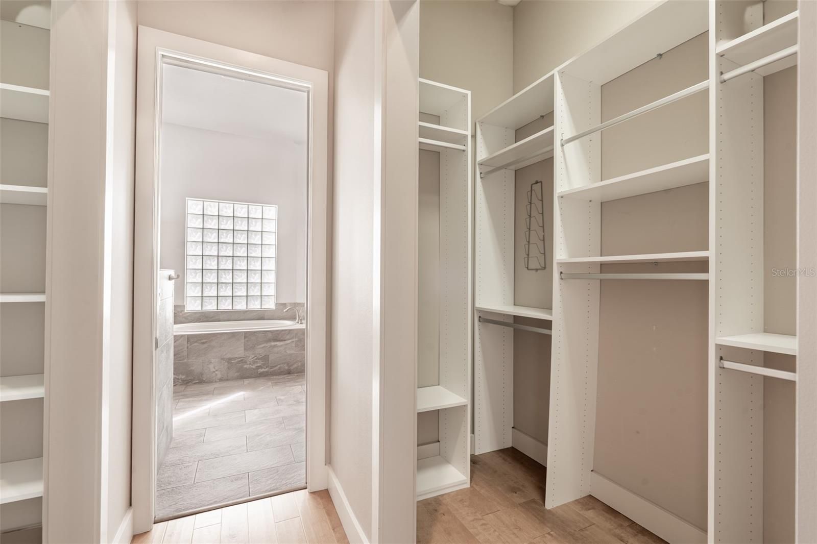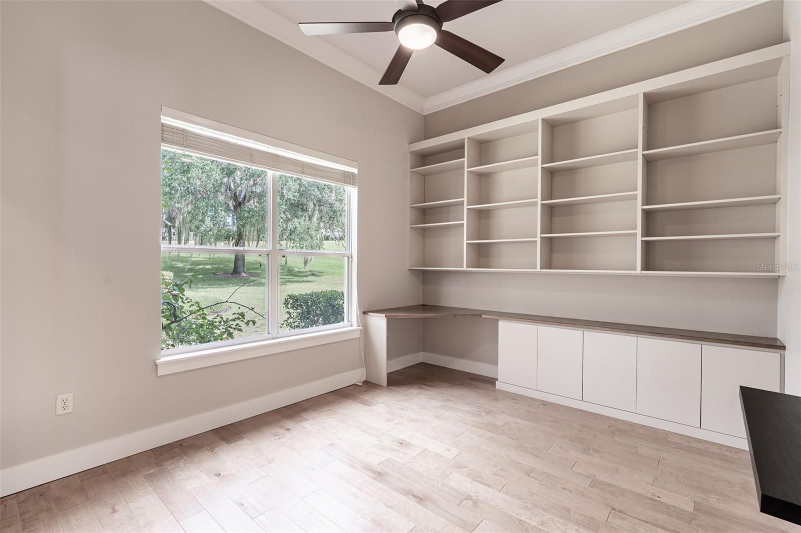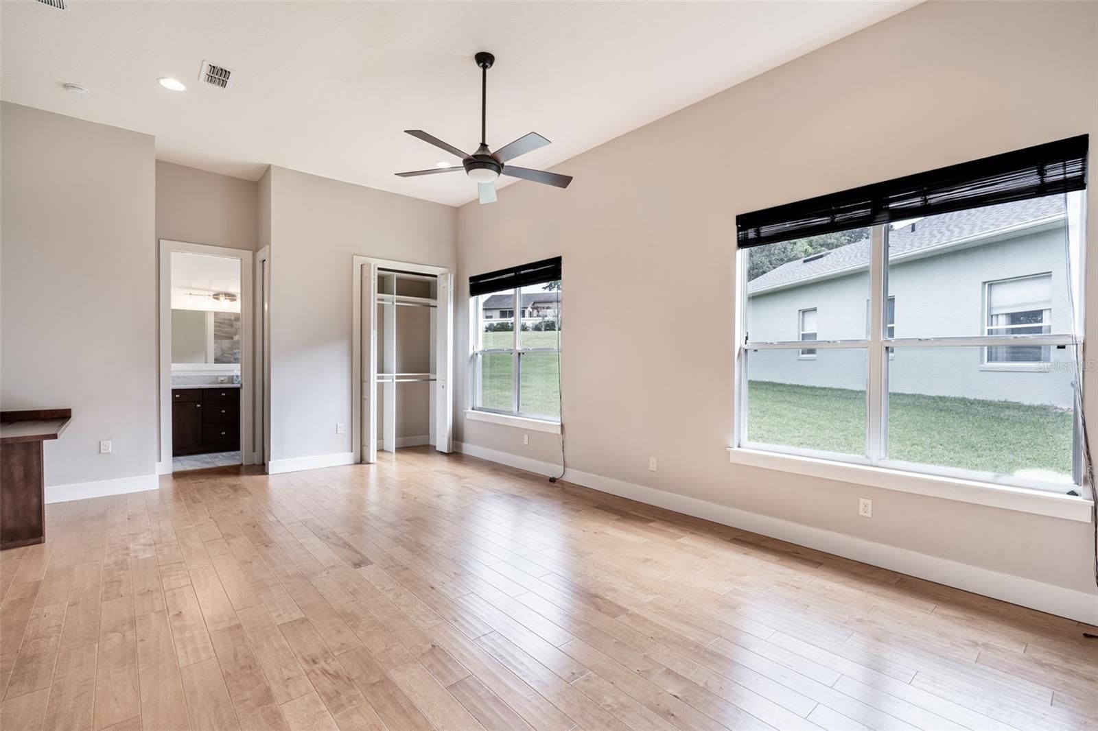 - Ceiling Fan(s), Crown Molding, Eat-in Kitchen, High Ceilings, Kitchen/Family Room Combo, Living/Dining Room, Open Floorplan, Main Level Primary, Solid Surface Counters, Solid-Wood Cabinets, Split Bedrooms, Thermostat, Walk-In Closet(s), Window Treatments