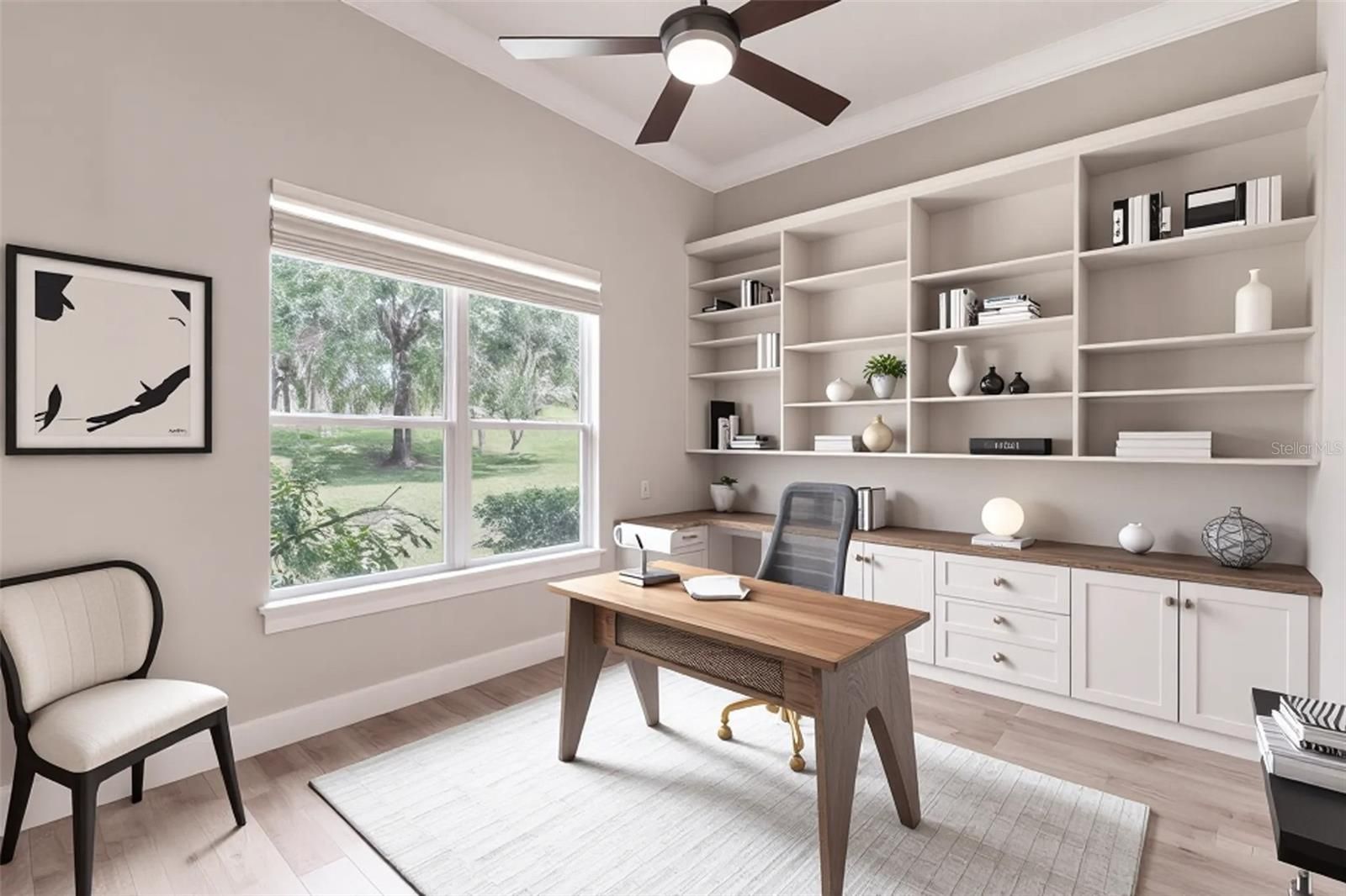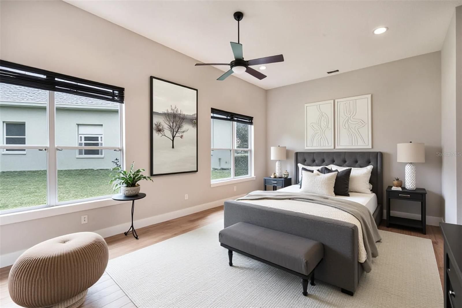 One or more photo(s) has been virtually staged. This spacious and thoughtfully remodeled residence features an open floor plan perfect for entertaining and everyday comfort. Step inside to a bright and inviting family room that flows seamlessly into the expanded kitchen and formal dining area. The kitchen has been completely reimagined with a massive island showcasing gorgeous stone accents and stunning stone countertops, providing both beauty and functionality for gatherings large and small. Originally designed as a three-bedroom layout, the two guest bedrooms have been combined to create one oversized retreat, perfect as a second suite, hobby room, or dual-purpose space. The split floor plan ensures privacy, with a large primary suite featuring dual vanities, a garden tub, separate shower, and his & hers closets. Additional highlights include crown molding, central vacuum, pre-wiring for surround sound, security system, a three-car garage, and two A/C units for maximum efficiency year-round with dual comfort climate zone-control. Dual A/C units installed 2017 and 2019. Set within a sought-after 55+ community, residents enjoy world-class amenities including a 28,000 sq. ft. clubhouse, indoor and outdoor pools, fitness center with sauna, pickle-ball and tennis courts, billiards, crafts, shuffleboard, ballroom, library, and more. Ideally located close to shopping, dining, medical facilities, the National Training Center, and just a short drive to Disney and the airport, this home offers both luxury and convenience.