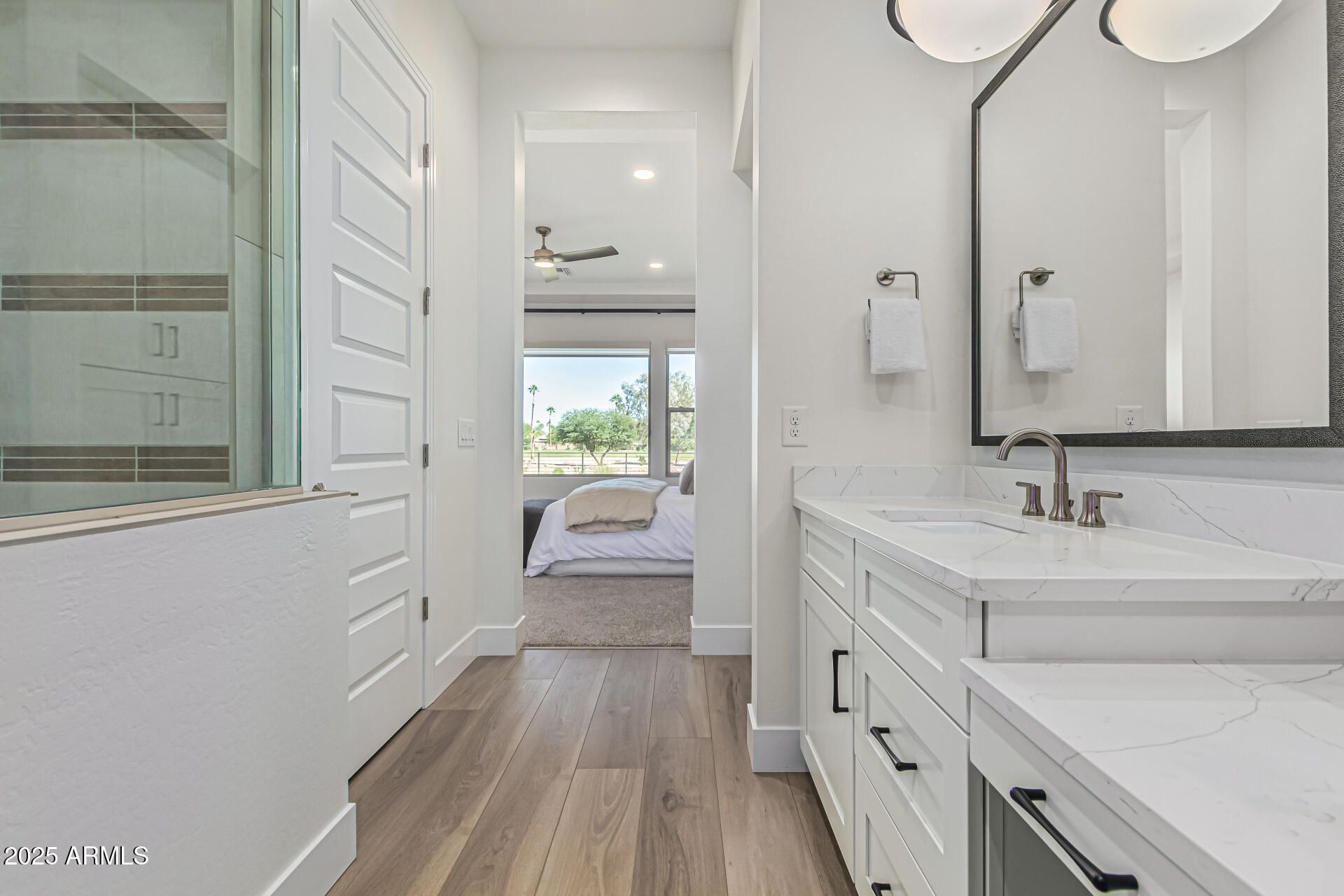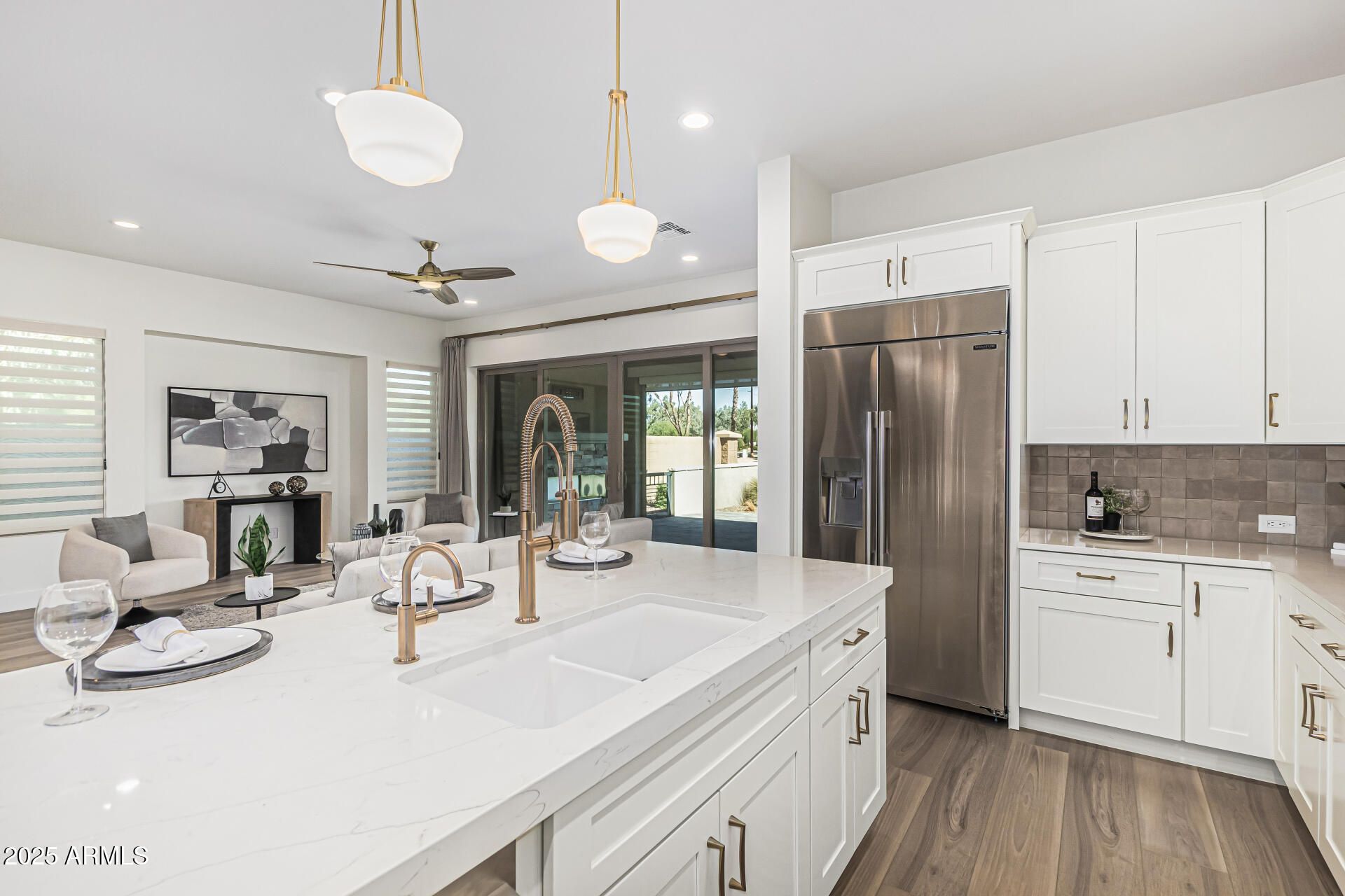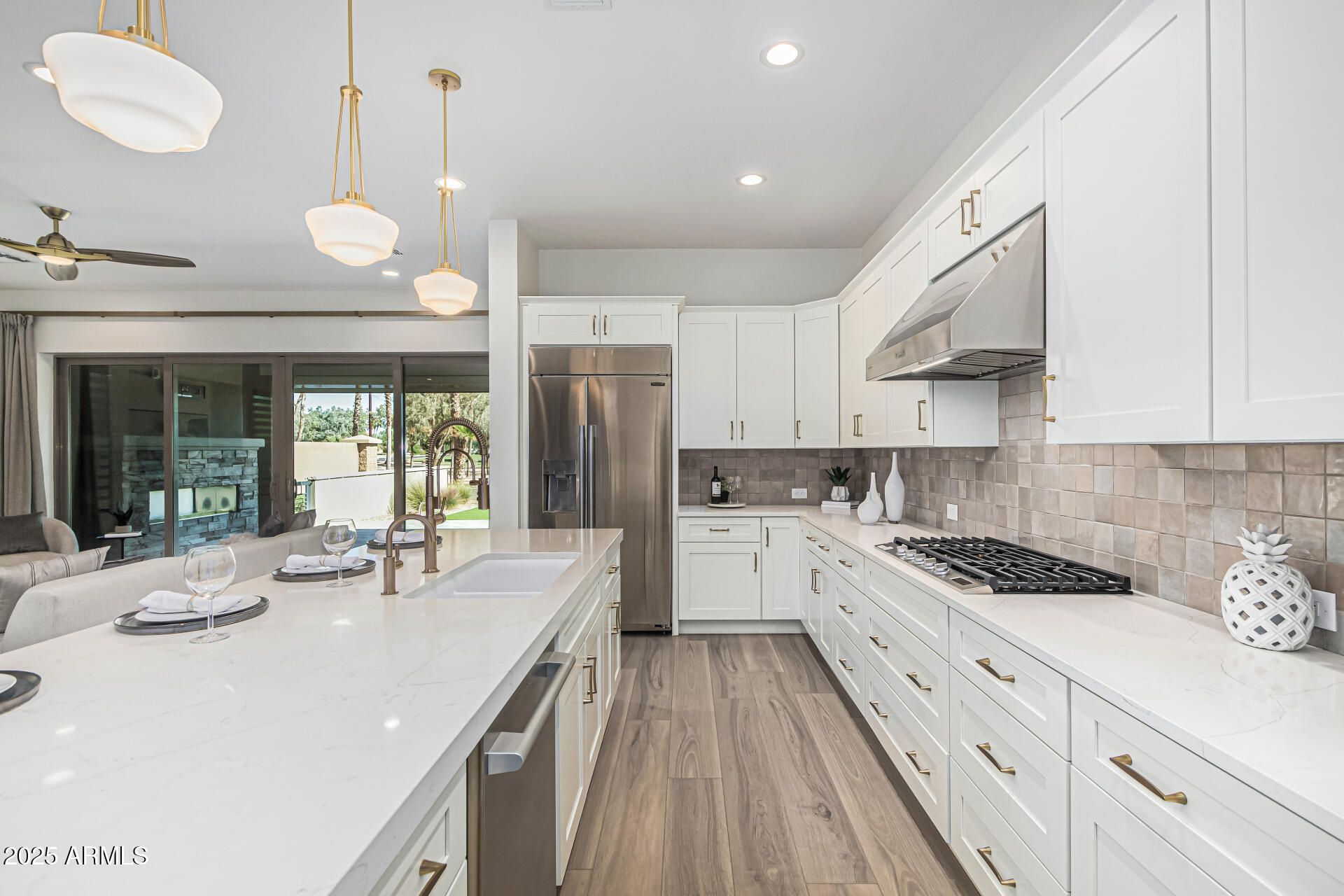 Location, location, location! This spectacular 2024 Golf Course Villa is in one of the most sought-after areas on the Tuscany Falls side of the award-winning Golf Resort Community of PebbleCreek AND it's practically brand new! This is a unique opportunity to own one of only 35 exclusive golf course villas in this amenity-rich, active adult community. Enjoy unparalleled convenience with a short walk to the Tuscany Falls Clubhouse, Westwind Restaurant, and three sparkling Pools. You'll also appreciate close proximity to the Creative Arts Center, Pickleball Courts, and the Dog Park, making this the perfect home for those who value luxury, comfort, and an active lifestyle. Bright open concept living is yours with 10-foot ceilings and full-length sliding glass doors that create a beautiful indoor/outdoor living space. The home centers around a beautiful chef's kitchen with 42" upper cabinets with large crown molding, dovetail drawers, soft close hinges, roll-out shelves, and upgraded hardware. Beautiful premium quartz countertops with full height backsplash, a large island, and designer pendant lighting are also featured. LG Signature Kitchen Suite SS appliances, including a 36" gas cooktop with designer hood and walk in LUXURY pantry with CUSTOM shelving and drawers complete the well- appointed kitchen. This highly desirable split floorplan offers 2 full En Suites plus a Den with double doors for privacy & an additional Powder Room. You'll appreciate the upscale lighting & ceiling fans, window treatments and upgraded flooring, including luxury plank in the living spaces and plush carpet & pad in the bedrooms. The great room is spacious and offers an abundance of natural light and plenty of extra cabinets along with a bar center and wine fridge. The luxurious primary suite provides a true spa-like retreat, featuring an expansive semi-frameless, curbless walk-in shower with a built-in seat and designer tile finishes. Dual vanities, a dedicated make-up area, and three framed mirrors add both functionality and elegance. The large walk-in closet is equipped with custom built-in organization and offers convenient direct access to the laundry room. The private guest suite, located on the opposite side of the home for optimal privacy, includes a spacious double-door closet and an en-suite bath with a tub and designer-tiled shower, perfect for overnight guests. The well-appointed laundry room features additional cabinetry, quartz countertops, an undermount sink, and a handy garment bar. Abundant cabinetry and a quartz-topped counter in the hallway leading to the garage provide even more storage and workspace. The extended two-car garage offers epoxy flooring, built-in storage racks, a tankless water heater, and a full water filtration system with reverse osmosis in the kitchen, delivering both comfort and convenience throughout the home. Perfectly positioned to capture unobstructed mountain views and breathtaking sunrises, this villa overlooks the lush green fairways of the 18th hole on the West Course without the worry of stray golf balls! The STUNNING SETTING provides an ideal blend of beauty, privacy, and tranquility. This picturesque backyard also features and an extended brick-paved patio, an entertainer's dream. Enjoy evenings gathered around the beautiful stacked-stone electric fireplace, complete with a TV mount and a motorized remote-controlled sunshade for year-round comfort and privacy. This SPECTACLUAR property truly has it all! Smart design, high end finishes and endless entertainment opportunities. Don't wait to start living the resort lifestyle, take advantage of the opportunity to see this one-of-a-kind, true PebbleCreek Dream Golf Course Villa today!