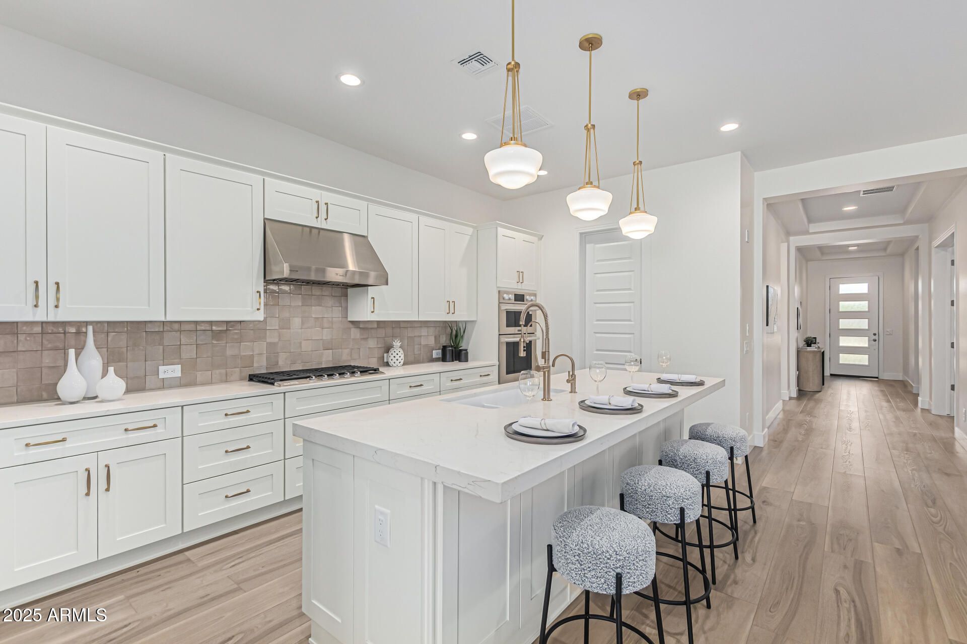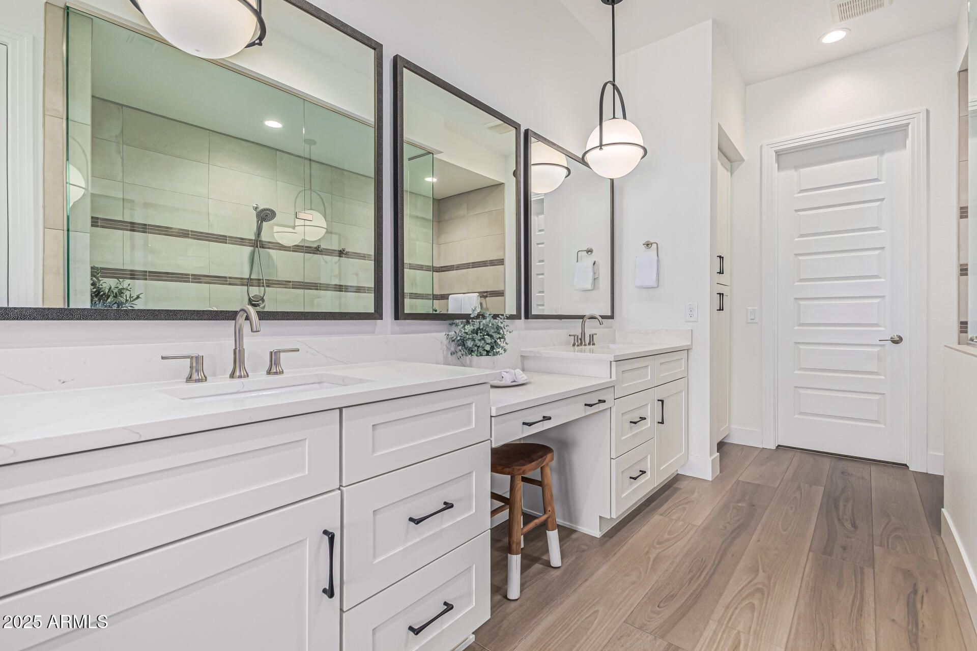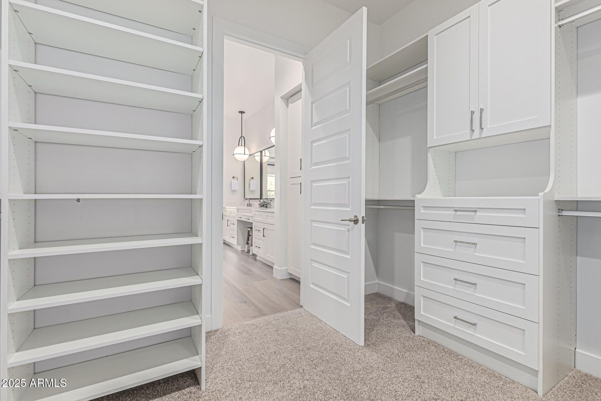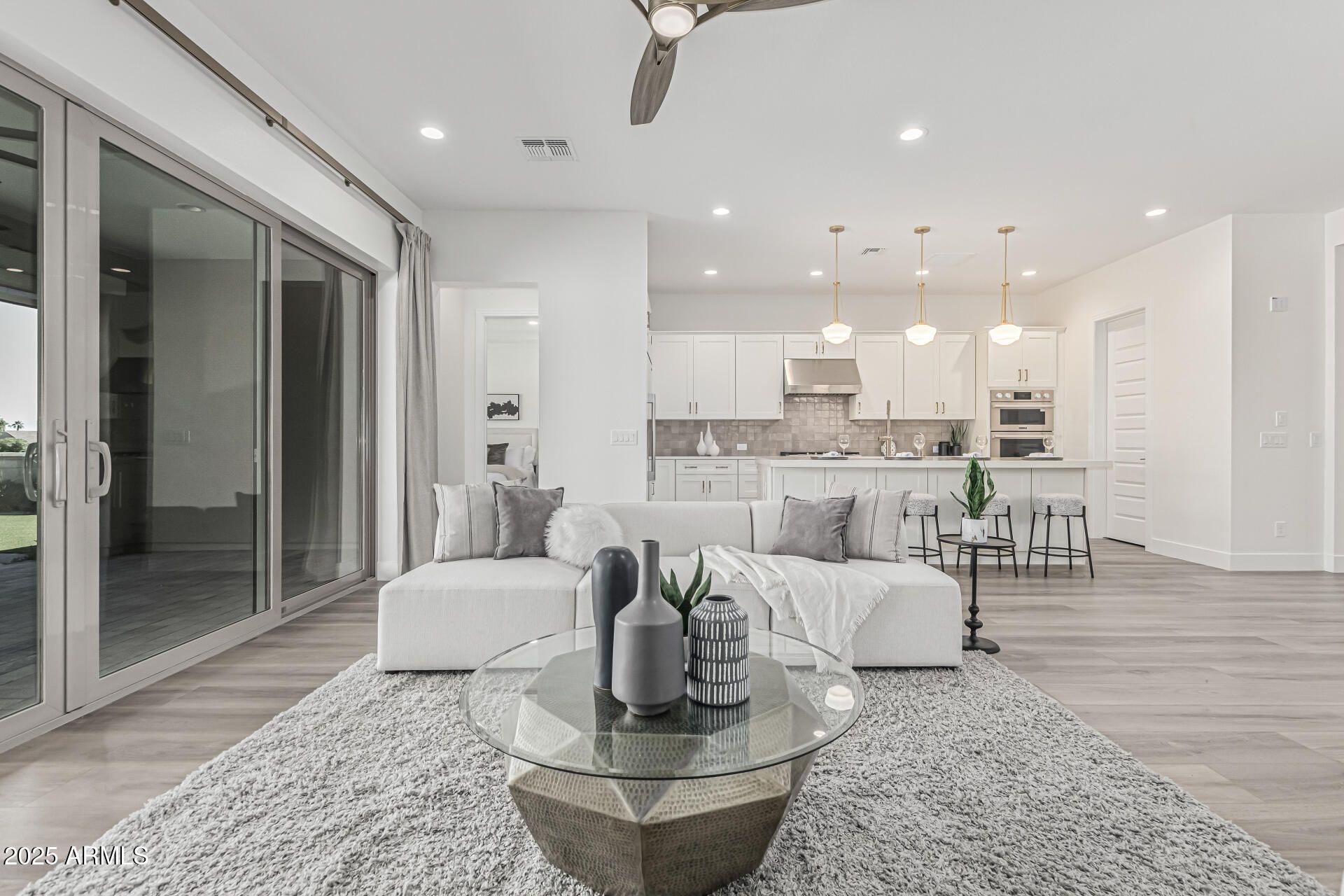 Location, location, location! This spectacular 2024 Golf Course Villa is in one of the most sought-after areas on the Tuscany Falls side of the award-winning Golf Resort Community of PebbleCreek AND it's practically brand new! This is a unique opportunity to own one of only 35 exclusive golf course villas in this amenity-rich, active adult community. Enjoy unparalleled convenience with a short walk to the Tuscany Falls Clubhouse, Westwind Restaurant, and three sparkling Pools. You'll also appreciate close proximity to the Creative Arts Center, Pickleball Courts, and the Dog Park, making this the perfect home for those who value luxury, comfort, and an active lifestyle. Bright open concept living is yours with 10-foot ceilings and full-length sliding glass doors that create a beautiful indoor/outdoor living space. The home centers around a beautiful chef's kitchen with 42" upper cabinets with large crown molding, dovetail drawers, soft close hinges, roll-out shelves, and upgraded hardware. Beautiful premium quartz countertops with full height backsplash, a large island, and designer pendant lighting are also featured. LG Signature Kitchen Suite SS appliances, including a 36" gas cooktop with designer hood and walk in LUXURY pantry with CUSTOM shelving and drawers complete the well- appointed kitchen. This highly desirable split floorplan offers 2 full En Suites plus a Den with double doors for privacy & an additional Powder Room. You'll appreciate the upscale lighting & ceiling fans, window treatments and upgraded flooring, including luxury plank in the living spaces and plush carpet & pad in the bedrooms. The great room is spacious and offers an abundance of natural light and plenty of extra cabinets along with a bar center and wine fridge. The luxurious primary suite provides a true spa-like retreat, featuring an expansive semi-frameless, curbless walk-in shower with a built-in seat and designer tile finishes. Dual vanities, a dedicated make-up area, and three framed mirrors add both functionality and elegance. The large walk-in closet is equipped with custom built-in organization and offers convenient direct access to the laundry room. The private guest suite, located on the opposite side of the home for optimal privacy, includes a spacious double-door closet and an en-suite bath with a tub and designer-tiled shower, perfect for overnight guests. The well-appointed laundry room features additional cabinetry, quartz countertops, an undermount sink, and a handy garment bar. Abundant cabinetry and a quartz-topped counter in the hallway leading to the garage provide even more storage and workspace. The extended two-car garage offers epoxy flooring, built-in storage racks, a tankless water heater, and a full water filtration system with reverse osmosis in the kitchen, delivering both comfort and convenience throughout the home. Perfectly positioned to capture unobstructed mountain views and breathtaking sunrises, this villa overlooks the lush green fairways of the 18th hole on the West Course without the worry of stray golf balls! The STUNNING SETTING provides an ideal blend of beauty, privacy, and tranquility. This picturesque backyard also features and an extended brick-paved patio, an entertainer's dream. Enjoy evenings gathered around the beautiful stacked-stone electric fireplace, complete with a TV mount and a motorized remote-controlled sunshade for year-round comfort and privacy. This SPECTACLUAR property truly has it all! Smart design, high end finishes and endless entertainment opportunities. Don't wait to start living the resort lifestyle, take advantage of the opportunity to see this one-of-a-kind, true PebbleCreek Dream Golf Course Villa today!