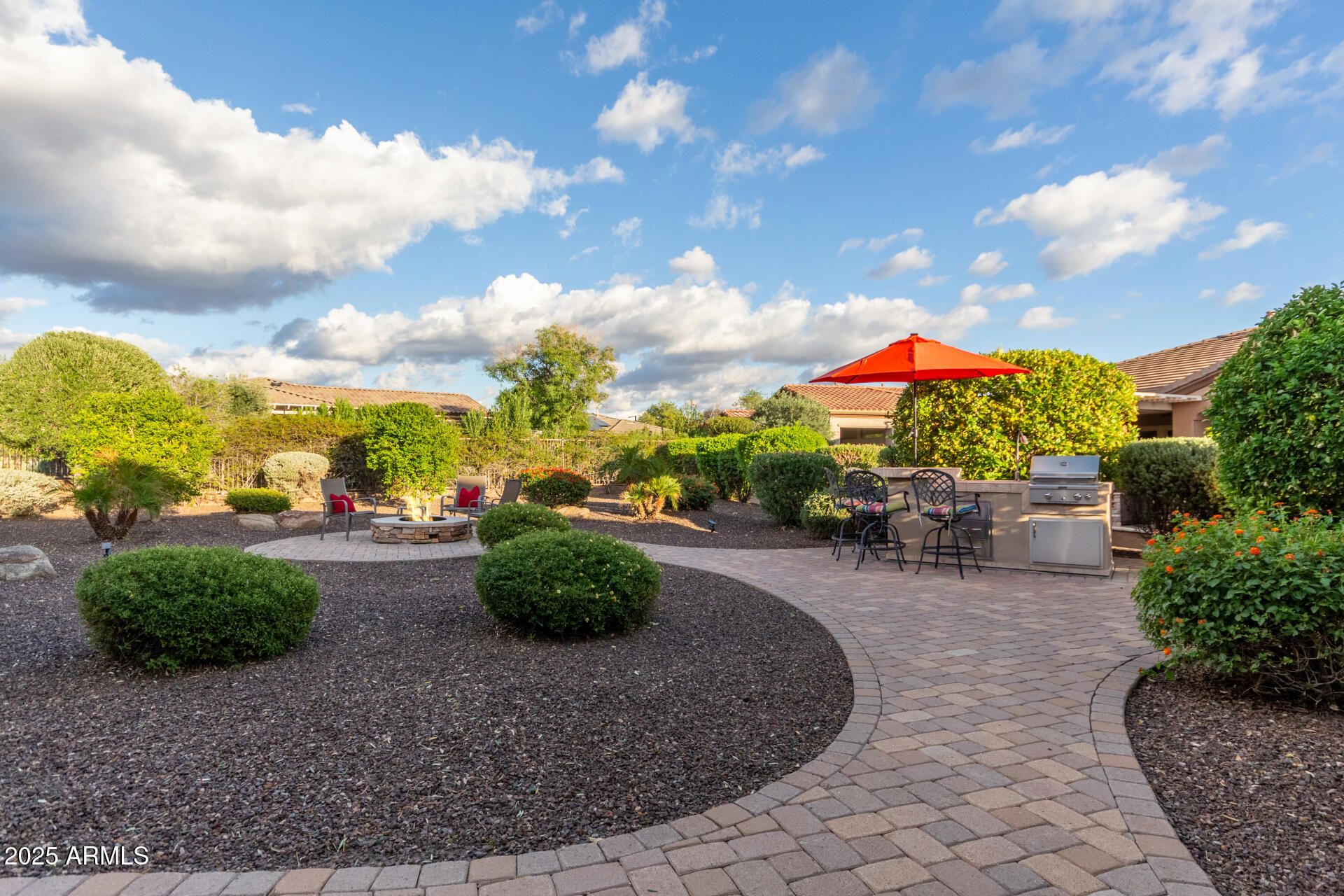 RESORT-STYLE LIVING ON ONE OF THE LARGER LOTS IN THE COMMUNITY This beautifully upgraded Flora model with 2BR + DEN offers refined living on one of the community's more spacious and private lots. A charming enclosed paver courtyard greets you on arrival, while elegant interior touches include plantation shutters, 18'' tile flooring, upgraded bedroom carpeting, custom lighting, ceiling fans, and tastefully enhanced kitchen and baths. The kitchen features stainless steel appliances, a tiled backsplash, granite counters, and a warm, inviting layout that flows effortlessly into the main living areas. The resort-style backyard is a true highlight with lush landscaping, extended paver patios, a BUILT-IN NATURAL GAS BBQ, and a cozy FIREPIT, creating the perfect setting for elevated outdoor living and year-round entertaining. The covered patio offers exceptional privacy and a tranquil place to unwind. Recent high-value improvements include a NEWER A/C, refrigerator, water softener, and hot water tank (2023), along with a new washer and dryer (2022). The EXTENDED GARAGE features epoxy-coated flooring, extensive garage cabinetry, and a central vacuum system, while the built-in surround sound system enhances everyday comfort and convenience. Impeccably maintained and designed for effortless indoor-outdoor living, this exceptional home blends space, style, and sophistication. Welcome to the active adult community of Trilogy at Vistancia where you will find outstanding amenities, including 2 clubhouses, pickleball, tennis, bocce ball, fitness centers, swimming & golf, just to name a few! Trilogy is part of the community of Vistancia, a master-planned development that includes beautiful homes, parks & hiking trails, award-winning community centers & golf courses, commercial & retail shops, along with incredible rolling hills & desert landscape all around! The future 320-acre 5 North at Vistancia commercial core is coming soon, home to the new ALA K-12 charter school. Vistancia has ranked as the #1 Master Planned Community in AZ for 12 years in a row (2013-2024)! Resort-style living at its best. Come & see why!