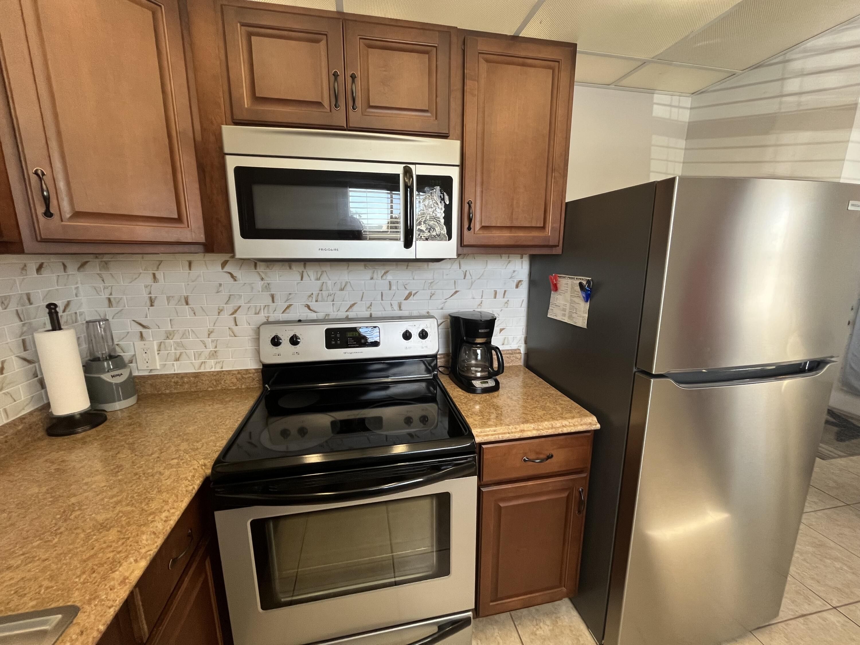 Gorgeous ground floor 2/2 true corner unit in the Brittany section of Kings Point. This lovely condo is available fully furnished with wonderful accoutrements. Beautiful large neutral colored tiling throughout the condo. Kitchen boasts of updated wood cabinetry, stainless steel appliances, formica countertops that look like granite, a stainless sink and a multi colored backsplash which enhances the nice design. Both bathrooms have been updated with tasteful wall tilings in the tub shower and the stall shower of the primary bathroom. Updated vanities/lighting and commodes as well. Full walk-in closet in the primary bedroom. Updated electrical panel too. Additional broom closet for storage. Outside screen patio has utility closet with full side by side washer/dryer. A must see for all!