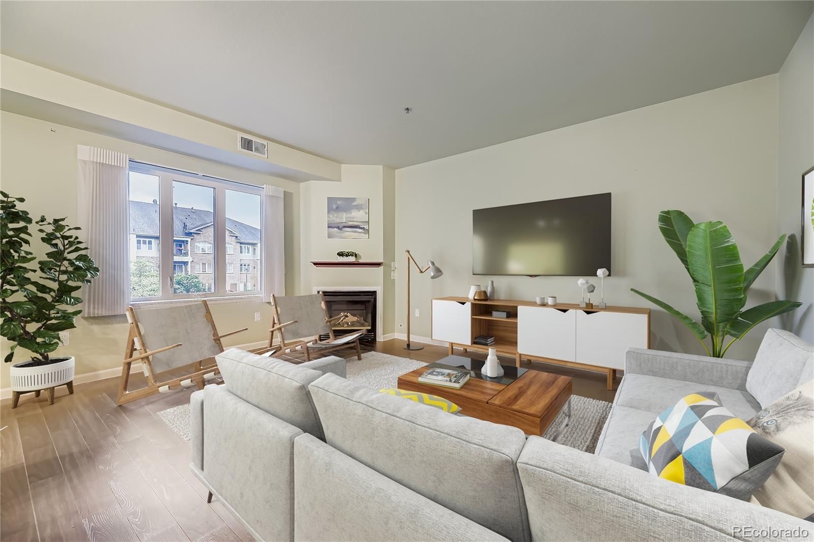 This 55+ condo is located in a prime area of Riverwalk. This is the finest one-bedroom condo in Riverwalk, with high-end upgrades and an open floor plan. The HOA dues include cable TV and heat. Featuring a secure building with underground parking and two parking spaces with one storage unit. The unit is a few steps away from the elevator. This beauty has been upgraded with custom cherrywood kitchen cabinets, an onyx sink, a backsplash, and a large peninsula. The living room features a gas fireplace and is open to the dining room, accessible via sliding doors that lead to the private patio. The primary bedroom features a walk-in closet, an en-suite bathroom with a walk-in shower, and an onyx sink and countertop. The bedroom has sliding doors that open to the balcony. A guest bathroom has a large custom closet for storage. The laundry room features a newer washer and dryer, along with shelves for storage. The dining room has custom-built-in cabinets. A turnkey property. This community offers a 12,000 sq. ft. clubhouse, a community facility featuring a spa, billiards room, outdoor pool, sauna, and hot tub, as well as banquet rooms, a fully equipped fitness center, a charming lounge, and a variety of monthly activities. A distinctive lifestyle community that's maintenance-free. Walking distance to restaurants, the Platte River, stores, old town Littleton, light rail, and centrally located to other areas.