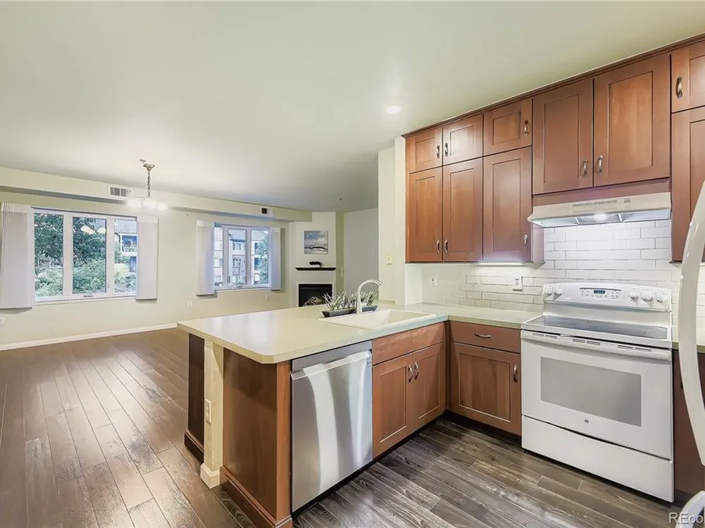 This 55+ condo is located in a prime area of Riverwalk. Featuring a secure building with underground parking and two parking spaces with one storage unit. The unit is a few steps away from the elevator. This beauty has been upgraded with custom cherrywood cabinets in the kitchen, an onyx sink, backsplash, and a large peninsula. The living room features a gas fireplace and is open to the dining room, accessible via sliding doors that lead to the private patio. The primary bedroom features a walk-in closet, an en-suite bathroom with a walk-in shower, and an onyx sink and countertop. The bedroom has sliding doors that open to the balcony. A guest bathroom has a large custom closet for storage. The laundry room features a newer washer and dryer, along with shelves for storage. The dining room has custom-built-in cabinets. A turnkey property. This community offers a 12,000 sq. ft. clubhouse, a community facility featuring a spa, billiards room, outdoor pool, sauna, and hot tub, as well as banquet rooms, a fully equipped fitness center, a charming lounge, and a variety of monthly activities. A distinctive lifestyle community that's maintenance-free. Walking distance to restaurants, the Platte River, stores, old town Littleton, light rail, and centrally located to other areas.