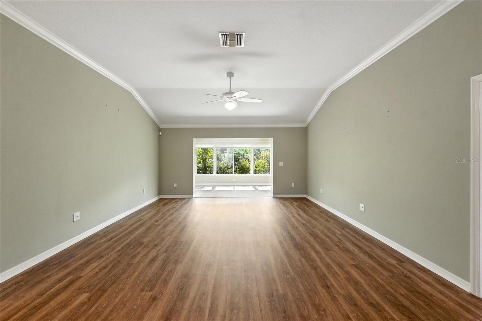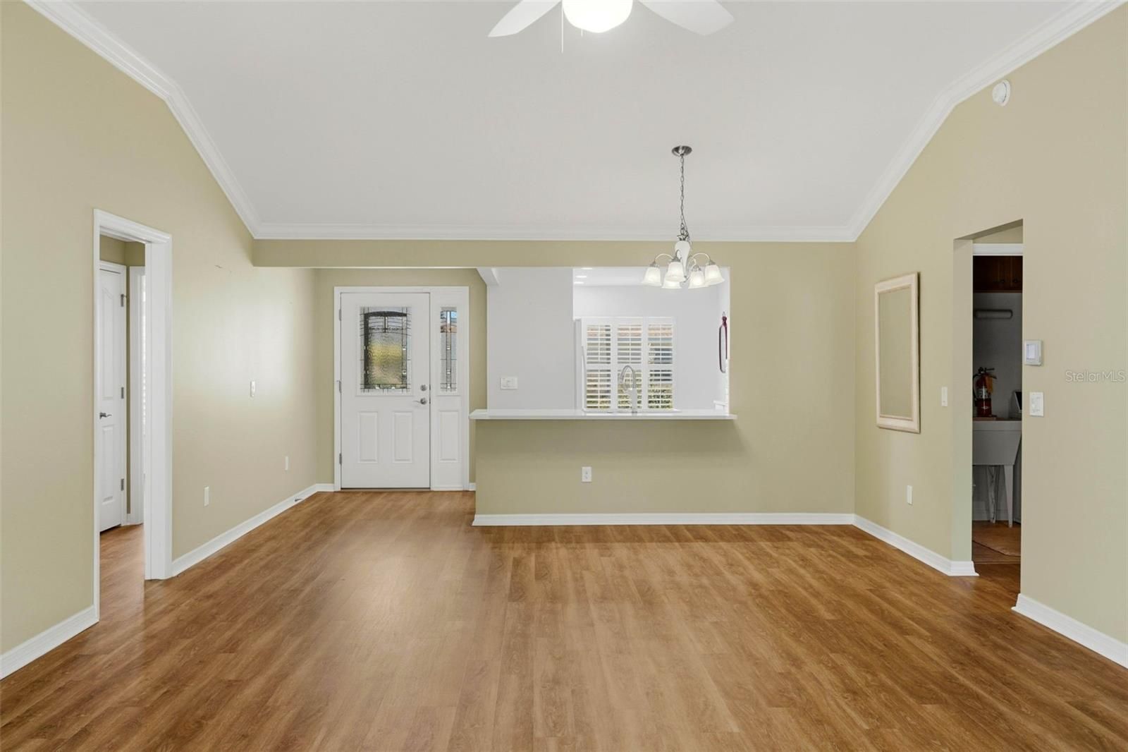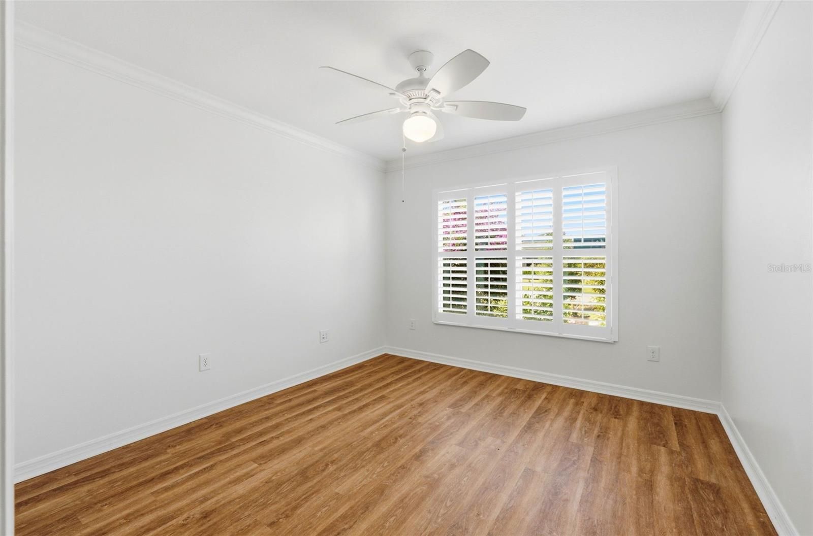 - Ceiling Fan(s), Crown Molding, Eat-in Kitchen, High Ceilings, Living/Dining Room, Open Floorplan, Main Level Primary, Solid Surface Counters, Split Bedrooms, Walk-In Closet(s), Window Treatments