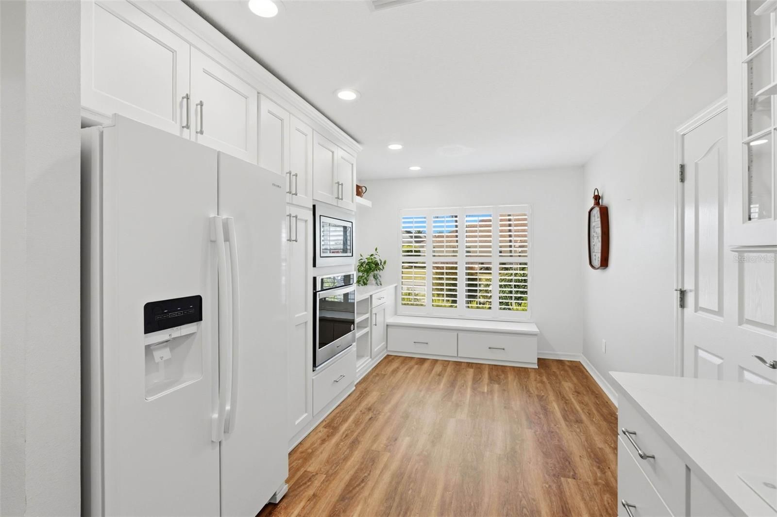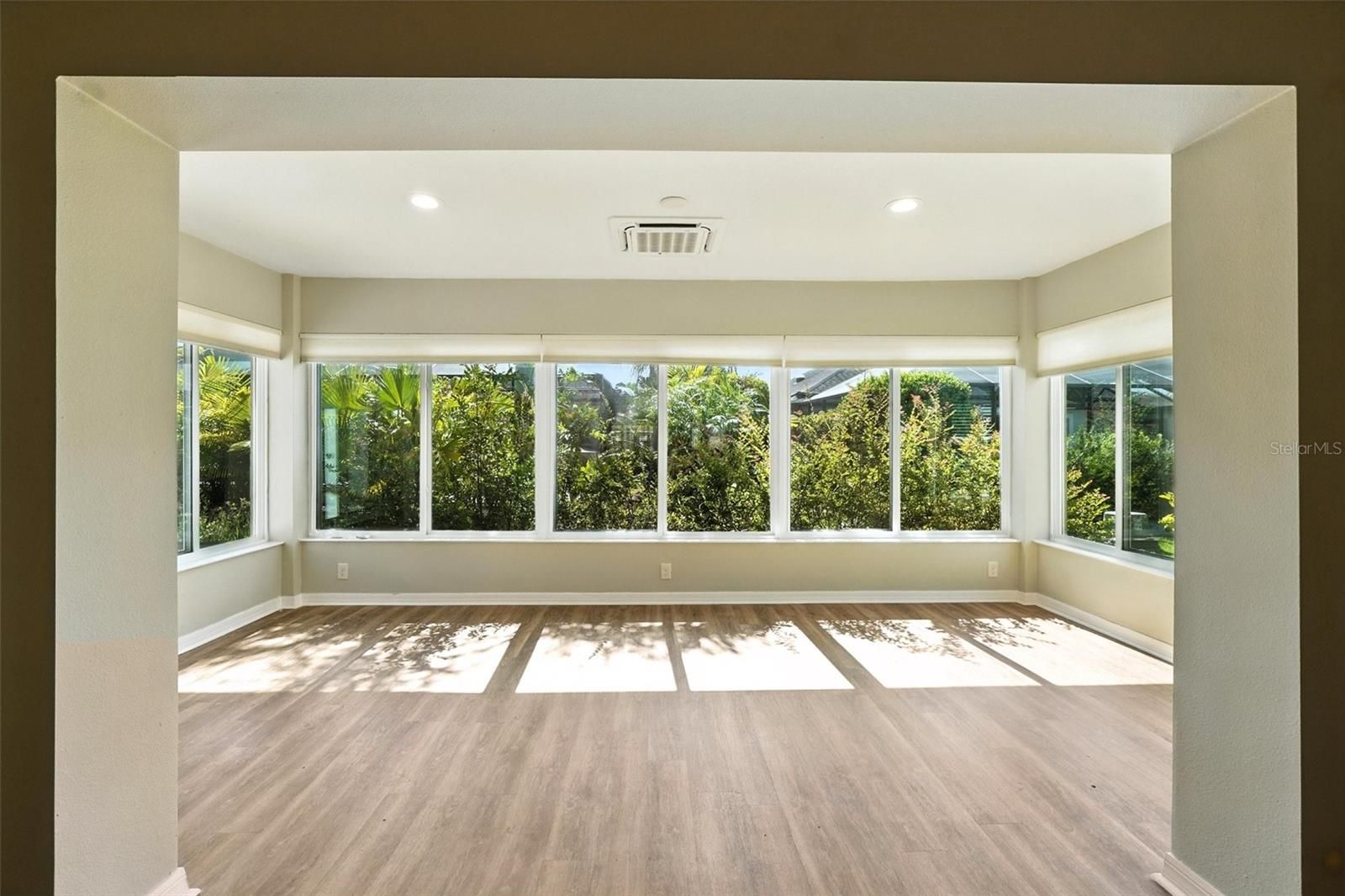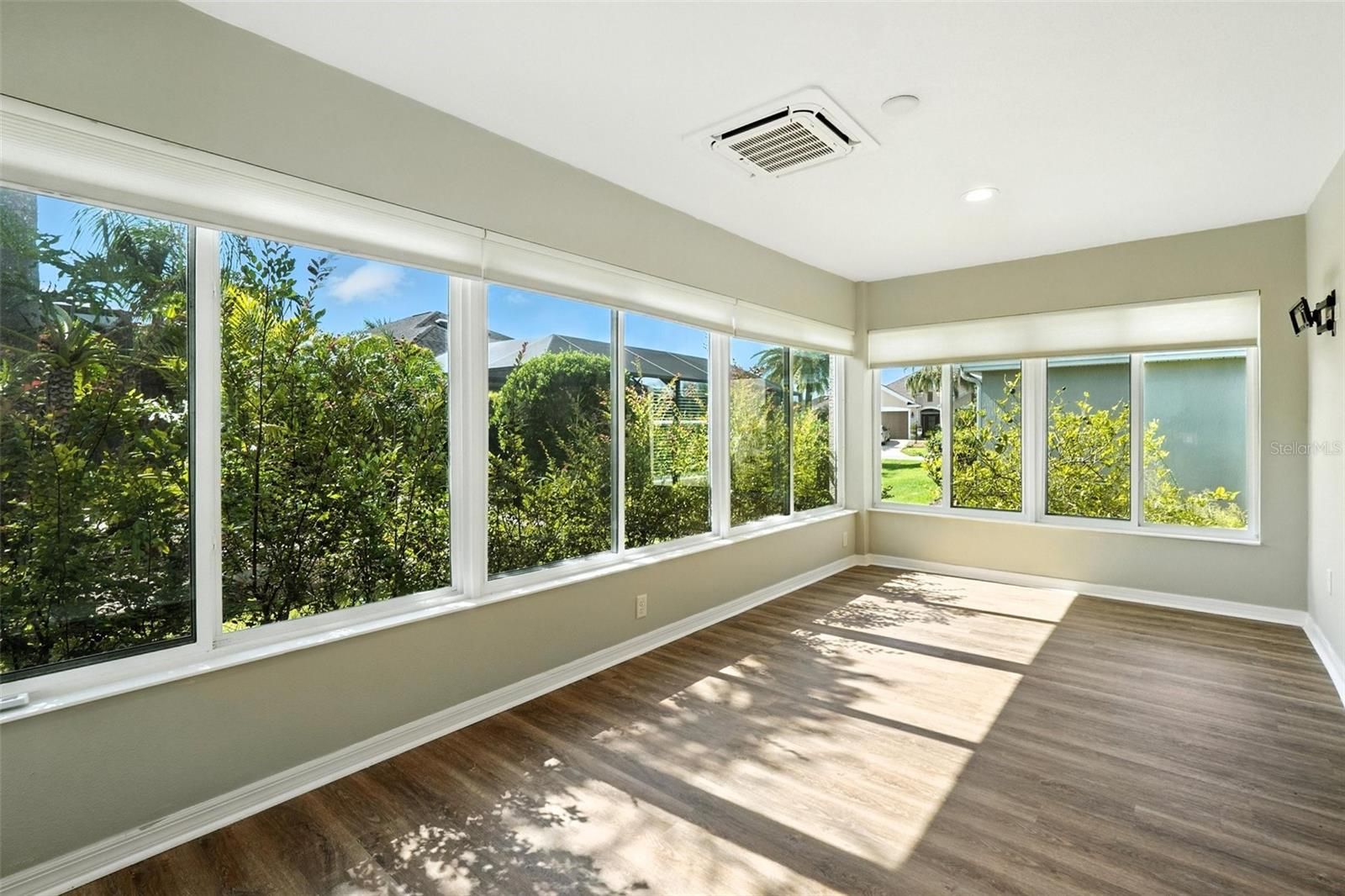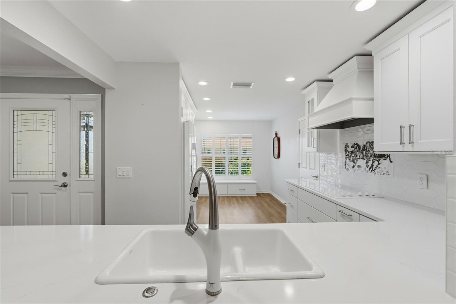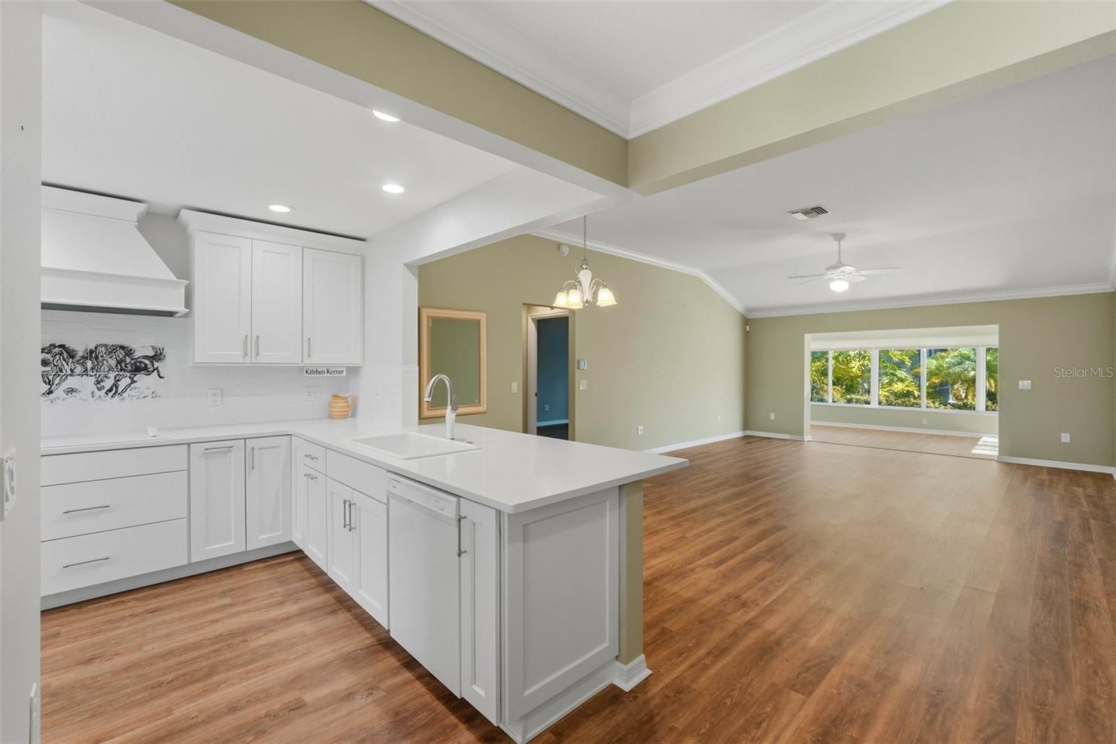Beautiful 3 bedroom 2 bath home with enclosed sunroom. This Jasmine model has beautiful upgrades. The kitchen was remodeled with light cabinetry installed to the ceiling and accented with crown molding, custom designed hood, pull out shelving and tile backsplash. Additional kitchen features include a built in oven, cooktop, solid surface countertops, eat in space and a custom coffee bar area. The glass enclosed sunroom features heat/air to enjoy year-round. The primary suite features a large custom walk in closet with built in features that include cabinet doors for that enhanced look. Primary also has French doors leading to a private outdoor patio. The En-suite bath features double sinks & a large walk in shower! The split floorplan gives guests privacy with two bedrooms and a secondary bathroom. This home features an outdoor 10' x 16' screened lanai to enjoy year-round Florida weather. Additional features ncludie luxury vinyl plank flooring, water filtration system, built in cabinets and sink in the laundry room. The Garage boasts built in cabinetry and work bench.. This home is a must see!