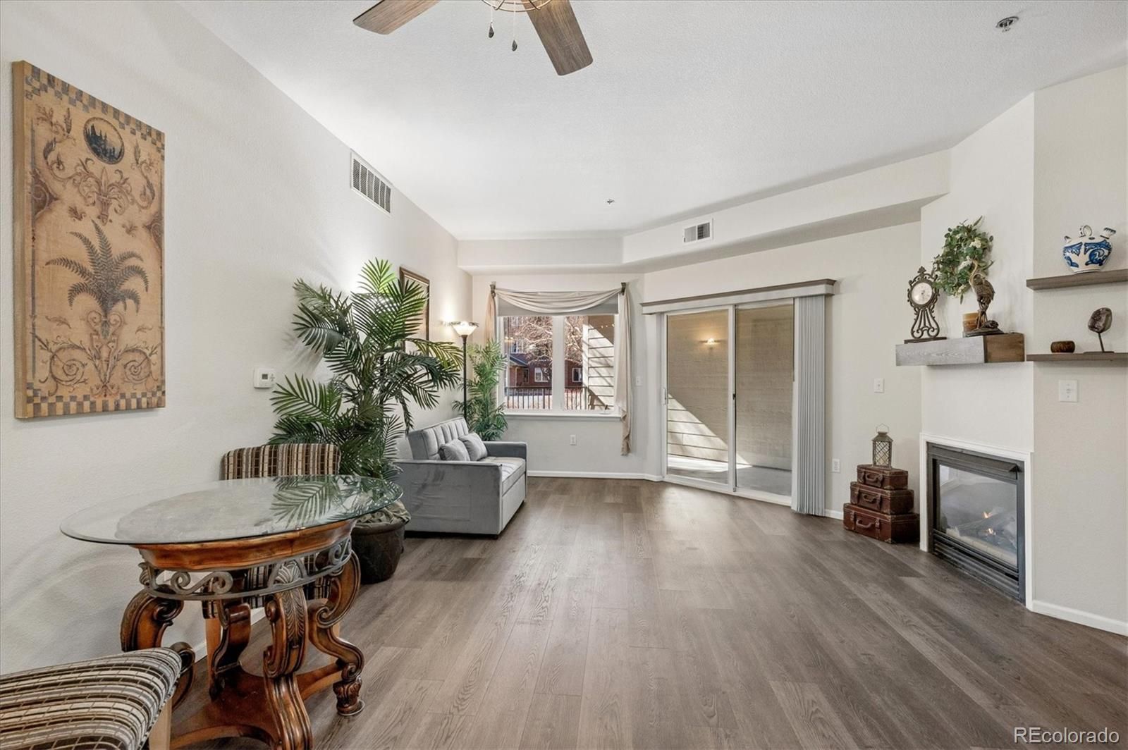 Presenting a move-in ready ground floor condominium in Centennial at Riverwalk, located within a secure 55+ community offering underground parking and storage. This two-bedroom, two-bath residence has undergone comprehensive updates over the past three years, featuring new LVP flooring, fresh carpeting in both bedrooms, upgraded lighting throughout, painted kitchen cabinets, quartz countertops, modern stainless steel appliances, and a stainless steel undermount sink with a contemporary faucet. The primary bathroom is equipped with a new walk-in shower and quartz countertops, while the spacious primary bedroom includes a walk-in closet. The second bedroom offers versatility as either a guest suite or office space. The living room is enhanced by a cozy gas fireplace and a new mantle; ceiling fans are installed in both the living area and primary bedroom. Additional amenities include a laundry area with newer stackable washer and dryer plus a newly built pantry/storage cabinet. The oversized patio provides ample space for outdoor furnishings. HOA fee includes heat and basic cable in this building. Residents benefit from elevator access in the underground parking garage; parking space number 53 is assigned and features an adjacent storage cage. Experience convenient "lock and leave" living at Centennial at Riverwalk. Prospective owners are invited to visit the neighboring 12,000-square-foot clubhouse, which boasts a fitness center, library, billiards tables, outdoor pool, hot tub, and sauna.