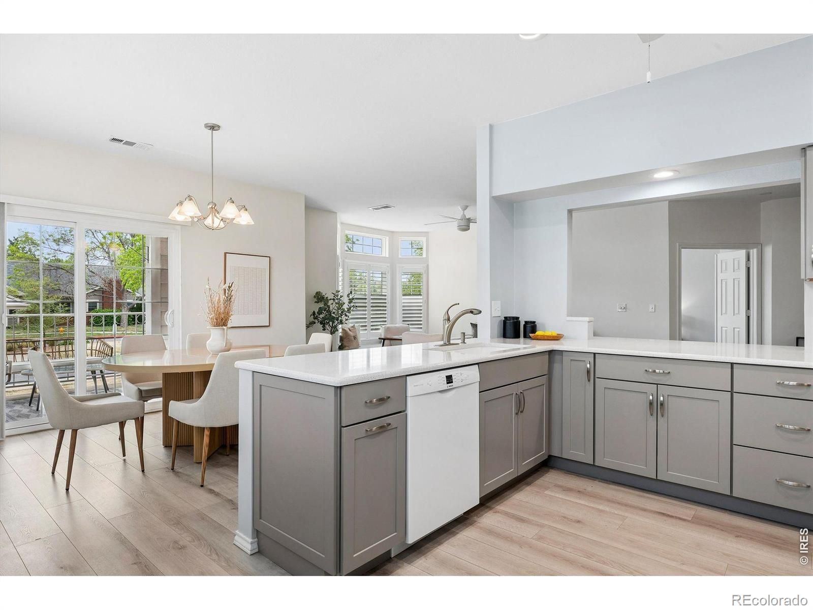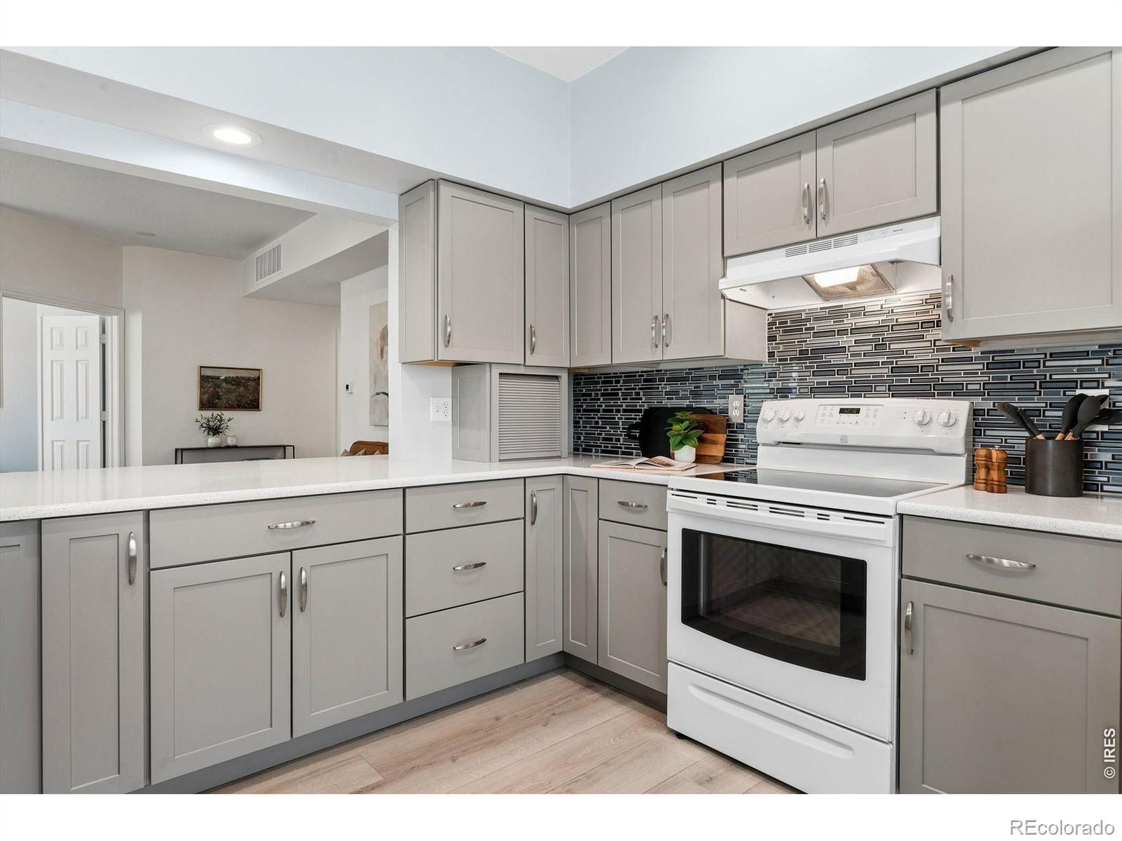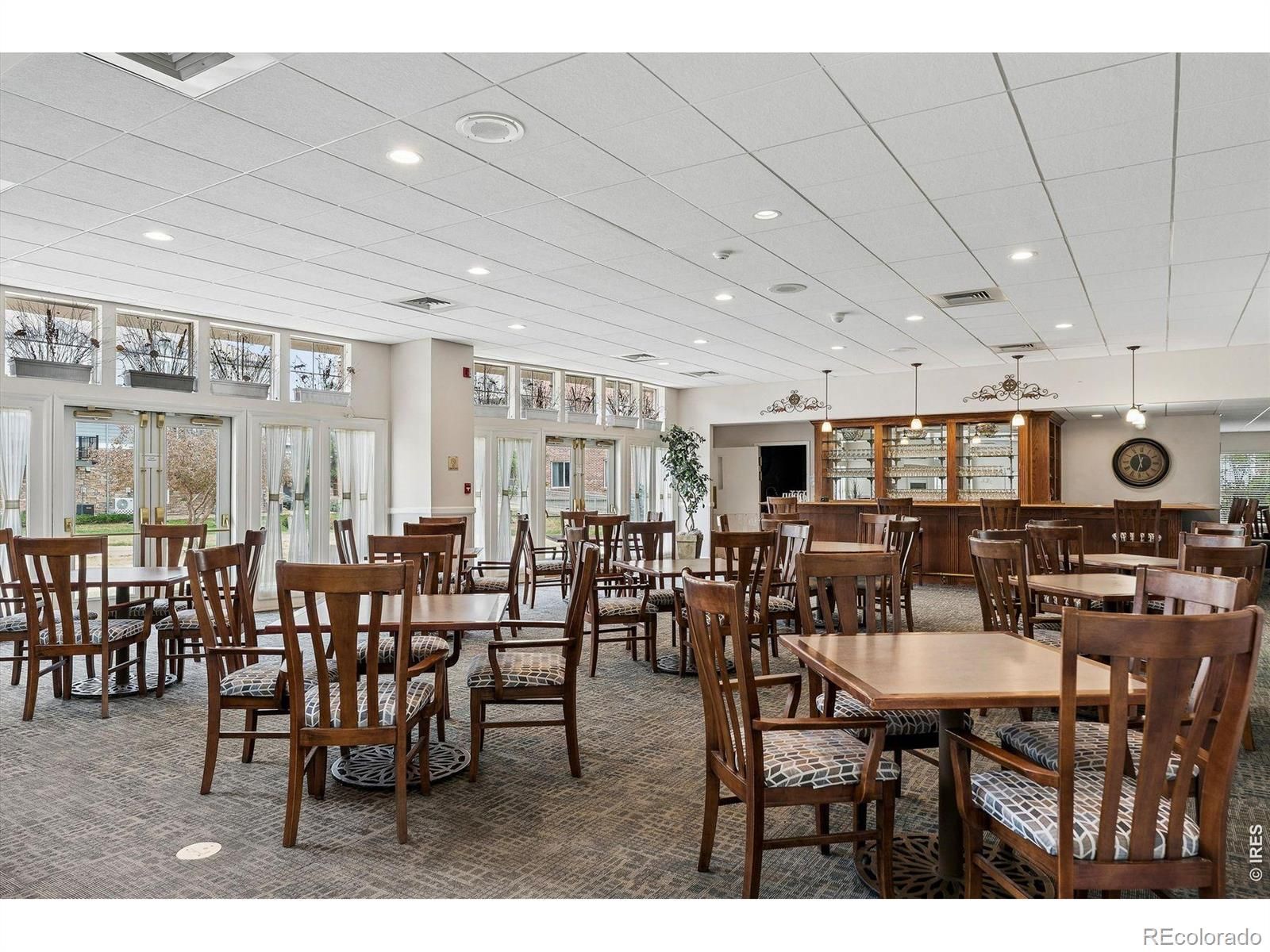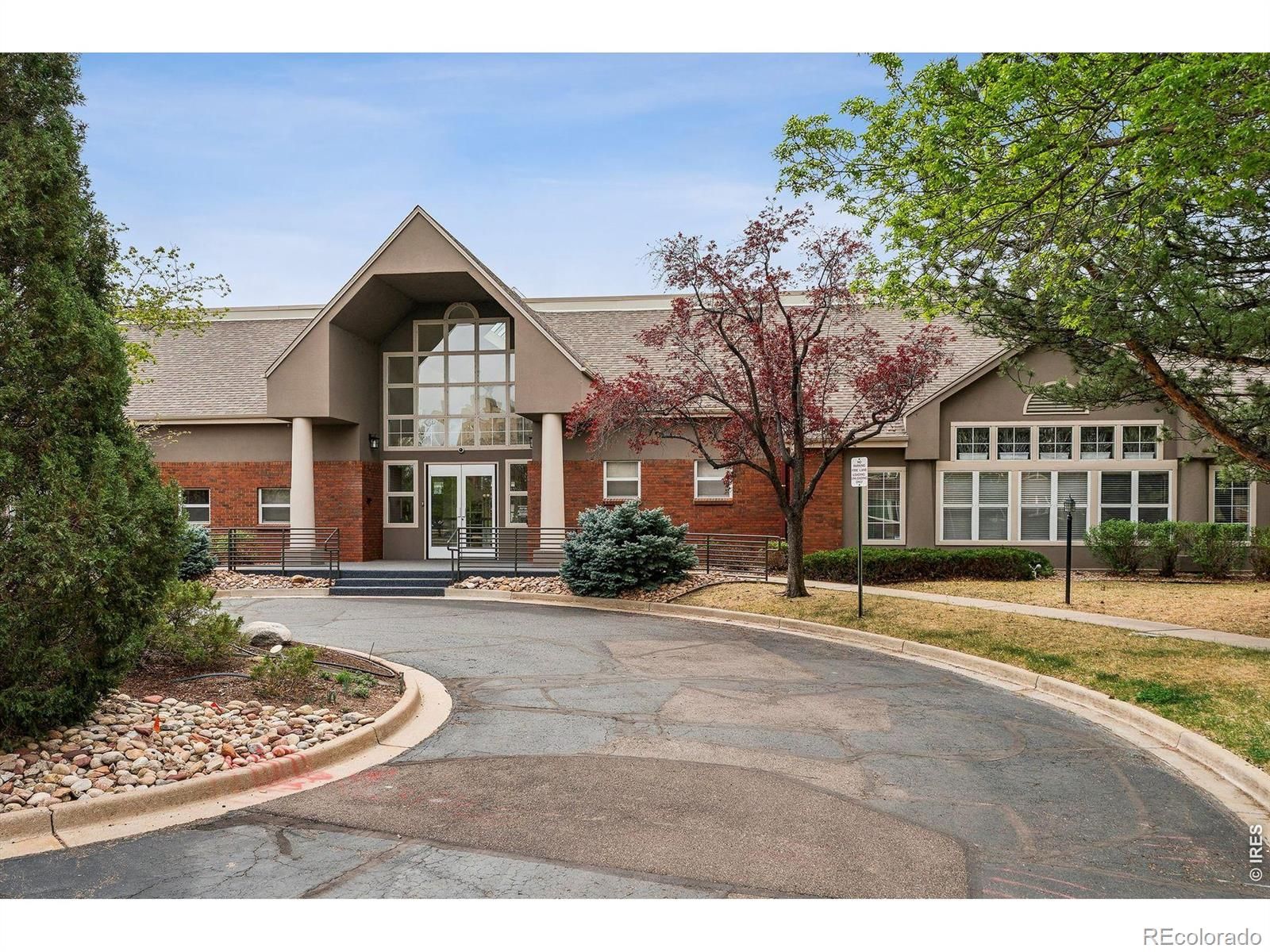First floor, corner unit condo in 55+ Centennial at Riverwalk in Littleton. Main level access and a functional, low-maintenance layout. Open living area with abundant natural light. Newer carpet and LVP flooring throughout. Kitchen features quartz countertops, soft close cabinets, and ample storage. Primary suite includes an updated bathroom with folding shower seat. Secondary bedroom suitable for office or flex use. Oversized northeast-facing patio provides additional outdoor space with tree coverage. Includes private underground parking near building entry with storage. Community amenities include clubhouse, fitness center, outdoor pool, hot tub, library, billiards, social spaces, and walking trails. Convenient access to downtown Littleton, light rail, shopping, and golf. Secured building with HOA covering maintenance for true lock-and-leave living.