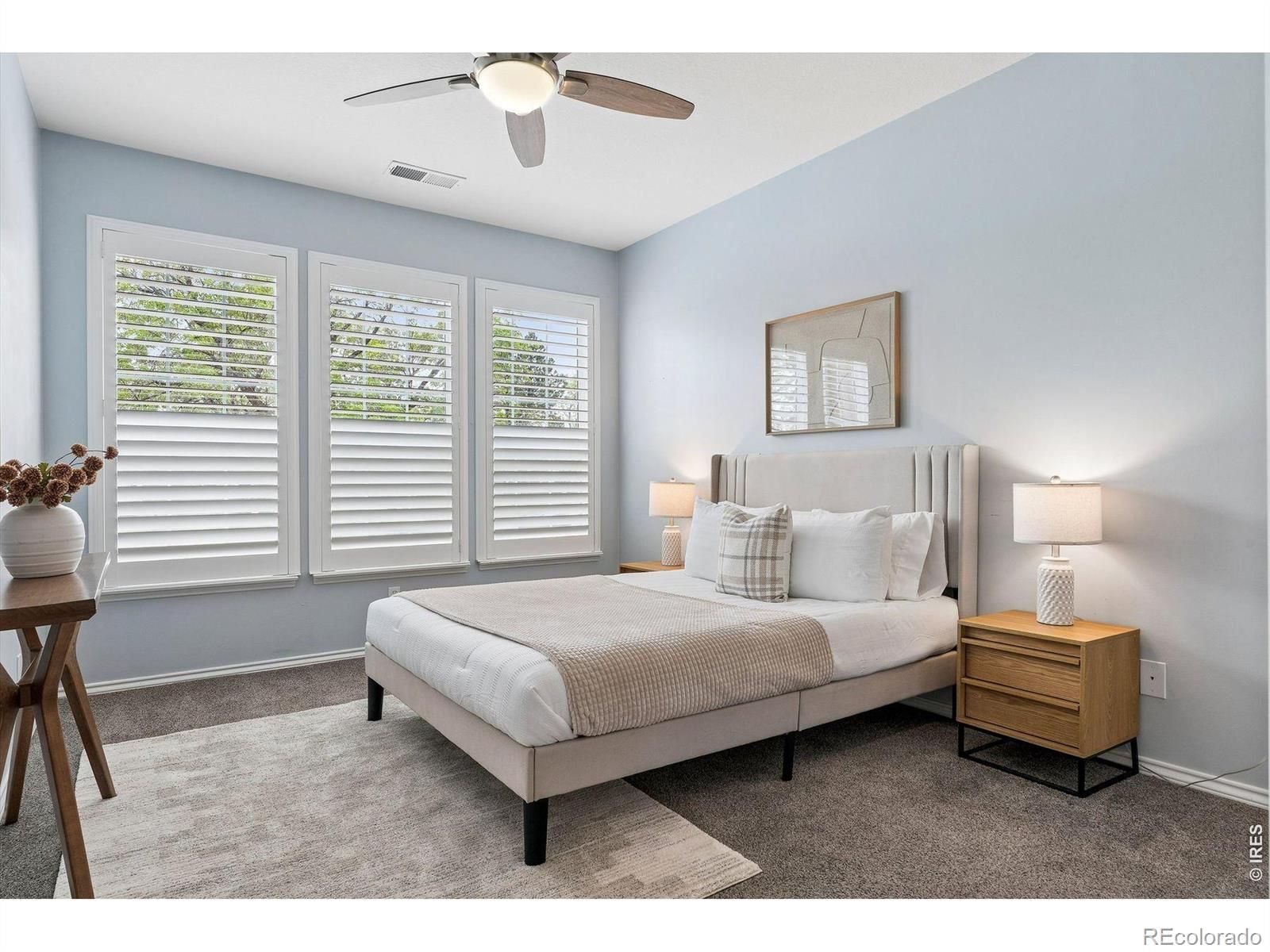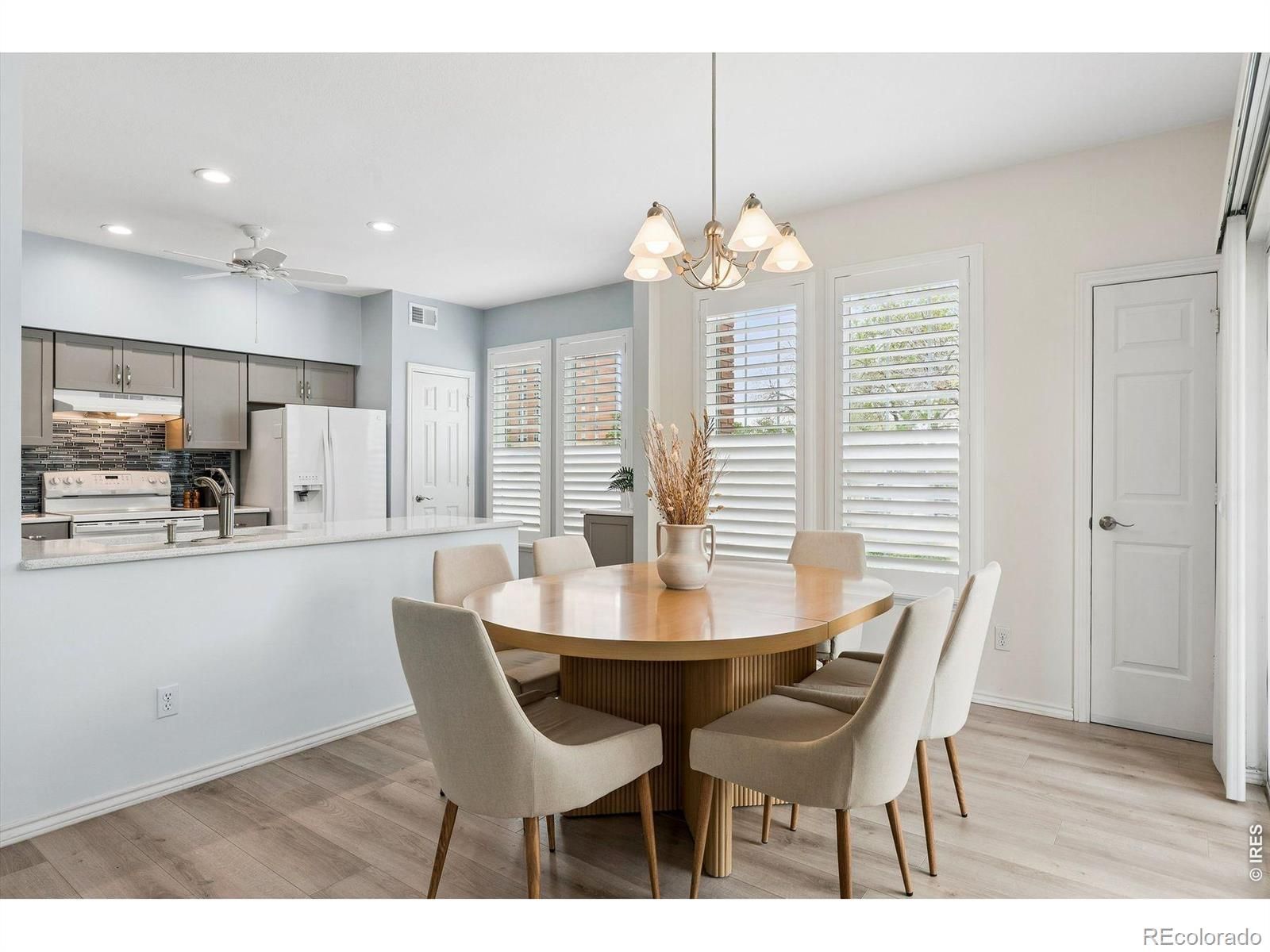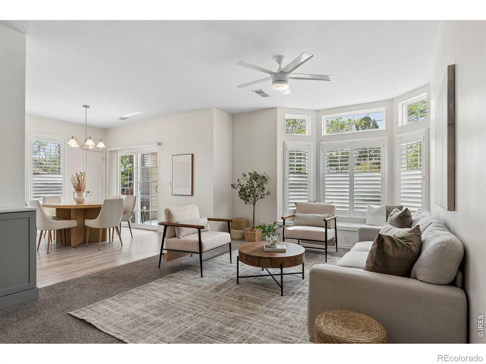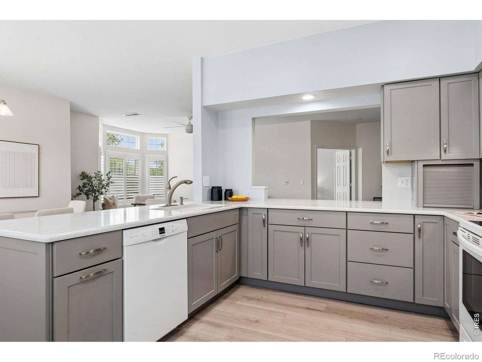 First floor, corner unit condo in 55+ Centennial at Riverwalk in Littleton. Main level access and a functional, low-maintenance layout. Open living area with abundant natural light. Newer carpet and LVP flooring throughout. Kitchen features quartz countertops, soft close cabinets, and ample storage. Primary suite includes an updated bathroom with folding shower seat. Secondary bedroom suitable for office or flex use. Oversized northeast-facing patio provides additional outdoor space with tree coverage. Includes private underground parking near building entry with storage. Community amenities include clubhouse, fitness center, outdoor pool, hot tub, library, billiards, social spaces, and walking trails. Convenient access to downtown Littleton, light rail, shopping, and golf. Secured building with HOA covering maintenance for true lock-and-leave living.