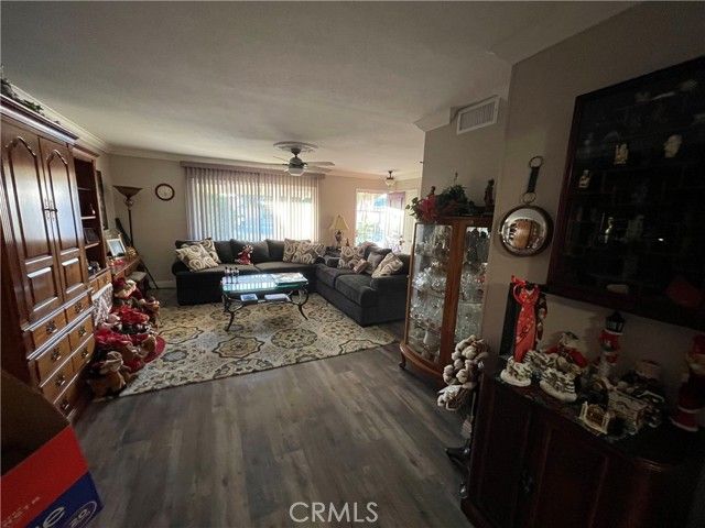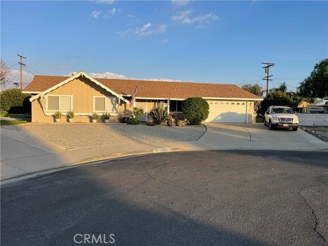 Fabulous and Spacious 4 bedroom, 2 bath home in the 55+ Sun City Civic Association neighborhood. This sprawling 1,985 Sq Ft single story home sits on an expansive 15,682 sq ft lot with an attached 2 car garage and plenty of parking on the driveway. There is also space on the side yard for possible RV parking. Covered backyard patio, storage shed and fruit trees adorn this large pie shaped backyard on a small and quaint cul-de-sac. The interior is open and spacious with 3 bedrooms and 2 bathrooms on one end of the house and a fourth bedroom at the other end of the house. New window coverings throughout, double pane windows, laminate flooring. The kitchen offers a pantry, extra counter space and granite counter tops. There is an oversized living room, built in buffet in the dining room, formal living area, crown molding and upgraded baseboards throughout as well as ceiling fans and a skylight in the kitchen.