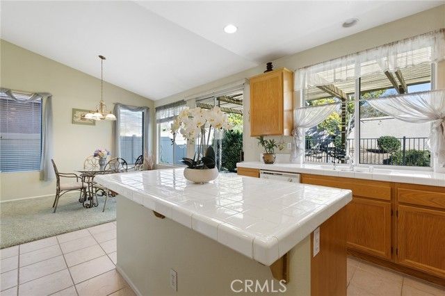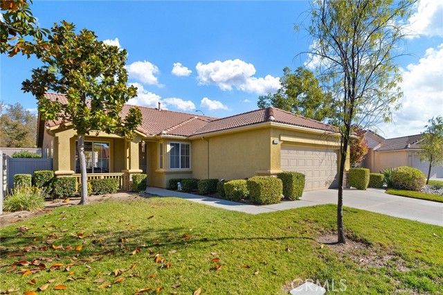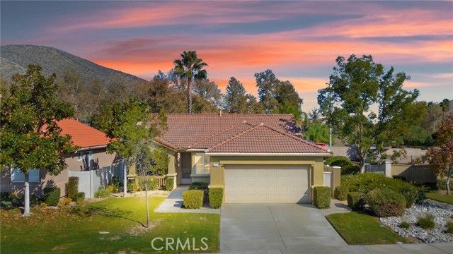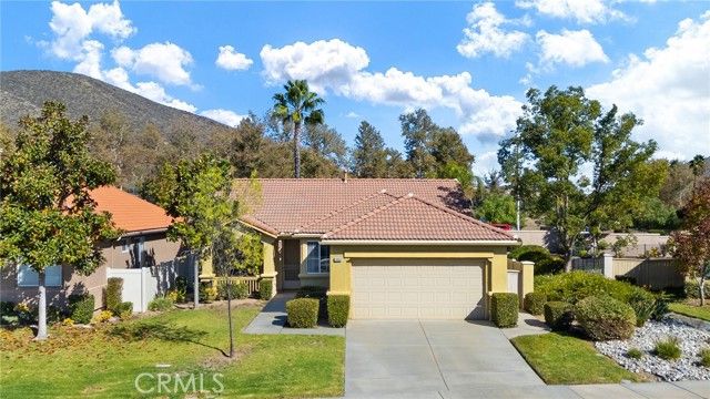 Peaceful evenings in the patio and all the amenities you could want! This charming single story home is located in The Oasis 55+ community featuring a clubhouse with more than 90 clubs and activities! The open concept home offers a spacious ensuite primary bedroom with a walk in closet and a guest bedroom and bathroom plus lots of storage space and tons of natural light. The large kitchen has a pantry and kitchen island plus a dining room area which opens to the spacious living room. The backyard is clean and perfect to enjoy your evenings looking at the hills. There are no neighbors behind and the block wall provides extra privacy will the iron fencing allows more space for your plants and greenery. There is a dog run or side patio with artificial turf and an oversized garage with built in cabinets and a water softener system. Your perfect forever home is here!