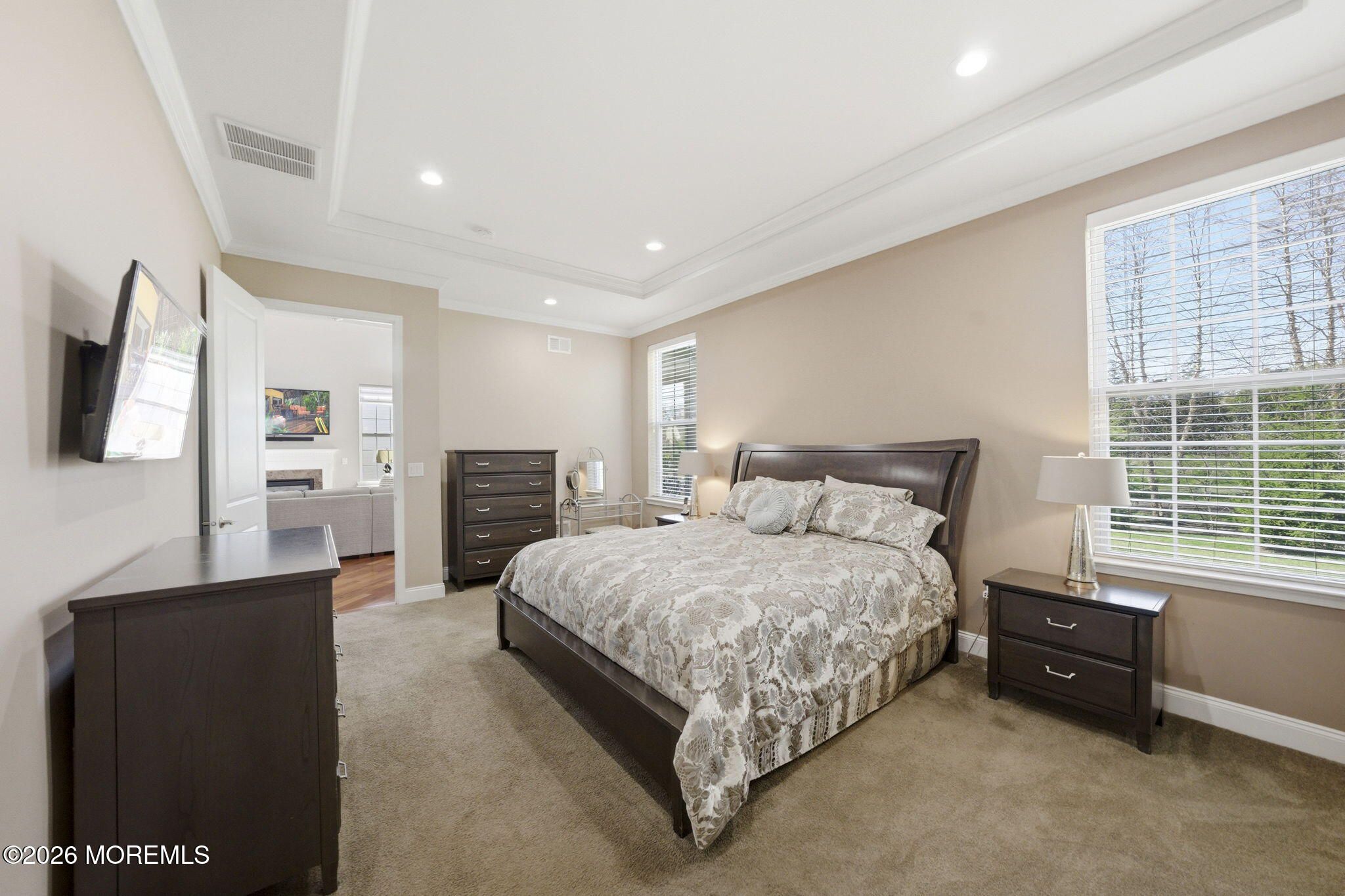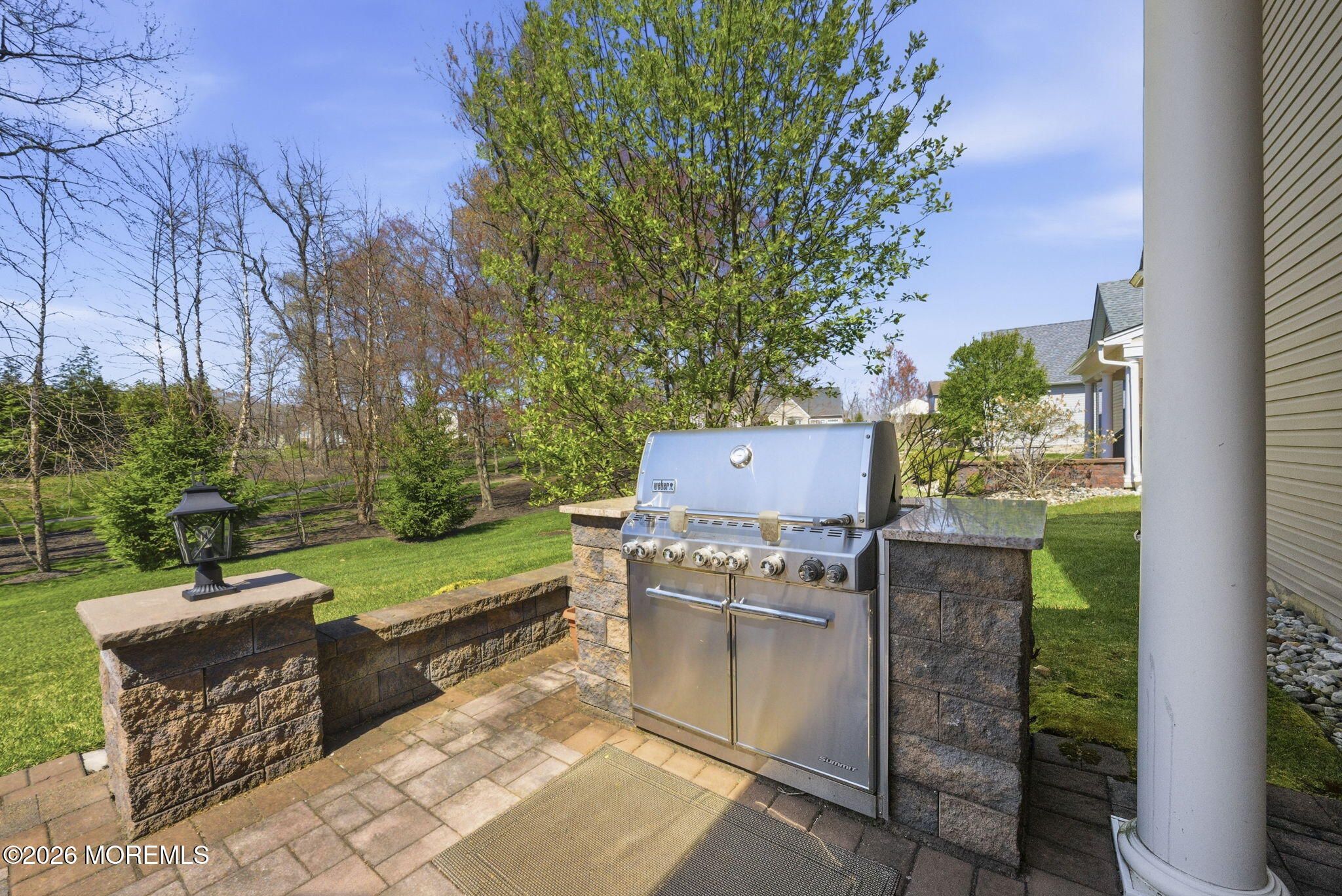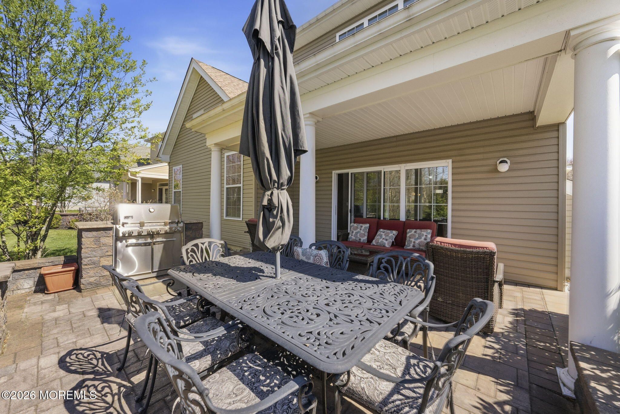 Welcome to this exceptional 55+ single-family home in the highly sought-after Enclave of Freehold, where style, comfort, and thoughtful design come together beautifully. From the moment you step into the inviting foyer, you'll notice the elegance of rich wood flooring that flows seamlessly throughout the home. To your left, a formal dining room impresses with a tray ceiling and decorative molding--perfect for hosting gatherings and special occasions. The heart of the home is the stunning kitchen, featuring solid wood cabinetry, a double oven, high-end stainless steel appliances, and a professional-grade 6-burner stove. An extra-large double sink and expansive stone countertops, complemented by stylish pendant lighting, create the perfect space for cooking and entertaining alike. The kitchen opens effortlessly into an exceptionally bright expanded family room, filled with natural light from numerous windows. Here, you'll find a cozy gas fireplace and a custom credenza complete with a wine and beverage cooler--ideal for relaxing or entertaining guests. Step outside to your private outdoor retreat: a beautifully designed custom paver patio surrounded by wooded privacy, featuring a built-in gas BBQ--perfect for summer evenings and outdoor dining. The first-floor primary suite is a true sanctuary, offering a massive walk-in closet and a luxurious en suite bath with porcelain flooring, double sinks, and an oversized walk-in shower. Also on the main level are a spacious additional bedroom and a versatile bonus room--ideal as a home office or additional sleeping space--both enhanced by soaring 10-foot ceilings. Upstairs, a thoughtfully designed loft provides additional living and entertainment space, along with another bedroom and a full bath--perfect for guests or extended living. This home also boasts two attics, including a convenient walk-in attic with abundant storage space. Located in a welcoming community, residents enjoy access to amenities such as a pool and tennis courts. With a prime location offering easy access to New York City, Pennsylvania, Atlantic City, and the beautiful Jersey Shore beaches, this home truly offers the best of luxury living and convenience. Don't miss the opportunity to make this remarkable property your own.