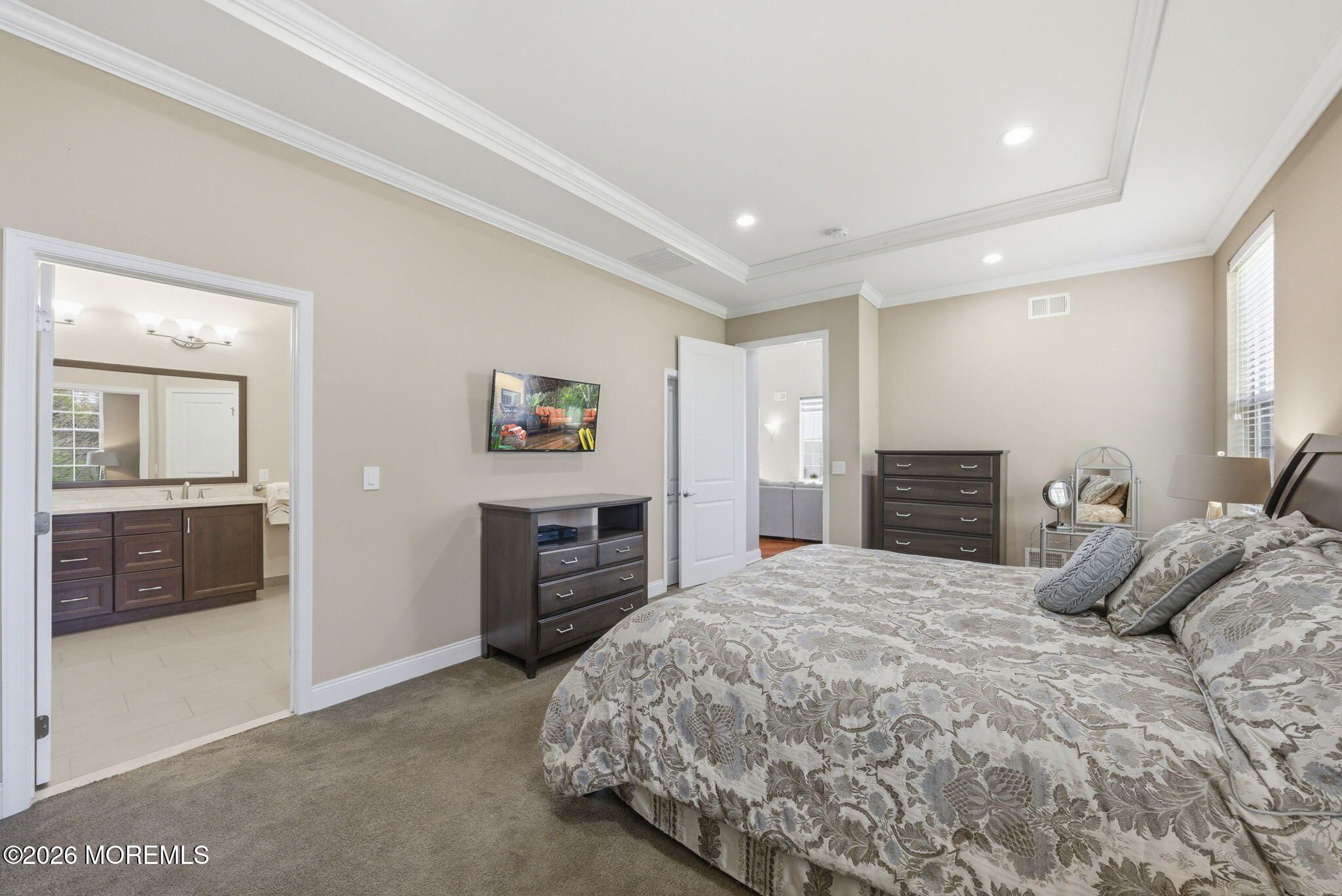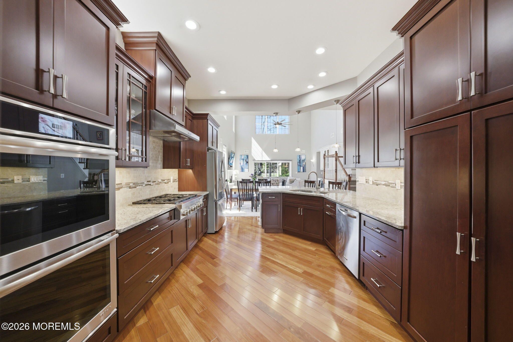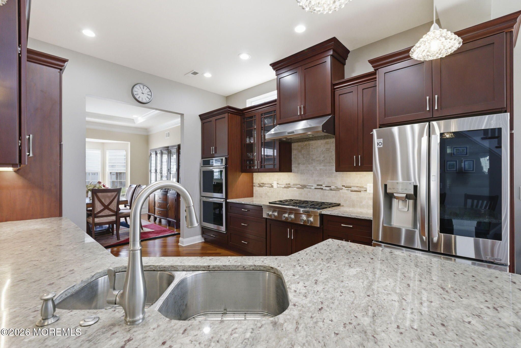 Welcome to this exceptional 55+ single-family home in the highly sought-after Enclave of Freehold, where style, comfort, and thoughtful design come together beautifully. From the moment you step into the inviting foyer, you'll notice the elegance of rich wood flooring that flows seamlessly throughout the home. To your left, a formal dining room impresses with a tray ceiling and decorative molding--perfect for hosting gatherings and special occasions. The heart of the home is the stunning kitchen, featuring solid wood cabinetry, a double oven, high-end stainless steel appliances, and a professional-grade 6-burner stove. An extra-large double sink and expansive stone countertops, complemented by stylish pendant lighting, create the perfect space for cooking and entertaining alike. The kitchen opens effortlessly into an exceptionally bright expanded family room, filled with natural light from numerous windows. Here, you'll find a cozy gas fireplace and a custom credenza complete with a wine and beverage cooler--ideal for relaxing or entertaining guests. Step outside to your private outdoor retreat: a beautifully designed custom paver patio surrounded by wooded privacy, featuring a built-in gas BBQ--perfect for summer evenings and outdoor dining. The first-floor primary suite is a true sanctuary, offering a massive walk-in closet and a luxurious en suite bath with porcelain flooring, double sinks, and an oversized walk-in shower. Also on the main level are a spacious additional bedroom and a versatile bonus room--ideal as a home office or additional sleeping space--both enhanced by soaring 10-foot ceilings. Upstairs, a thoughtfully designed loft provides additional living and entertainment space, along with another bedroom and a full bath--perfect for guests or extended living. This home also boasts two attics, including a convenient walk-in attic with abundant storage space. Located in a welcoming community, residents enjoy access to amenities such as a pool and tennis courts. With a prime location offering easy access to New York City, Pennsylvania, Atlantic City, and the beautiful Jersey Shore beaches, this home truly offers the best of luxury living and convenience. Don't miss the opportunity to make this remarkable property your own.