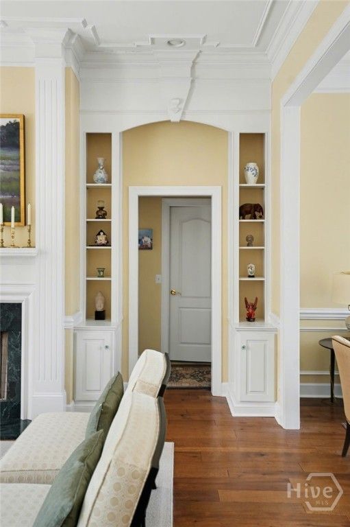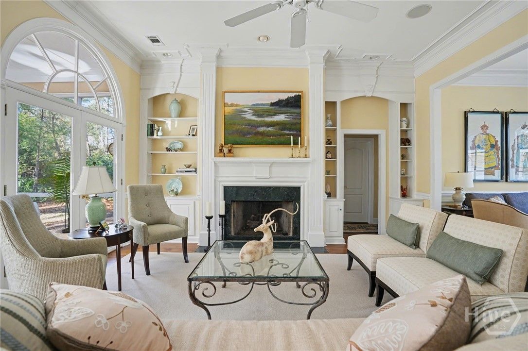 Move-in ready home in Oakridge offering a peaceful ambience and private backyard. Upon entry, a formal dining room sits to the left and a sitting room to the right, both featuring 11-foot ceilings, crown molding, chair rail, and box trim. The formal living area is ideal for entertaining or relaxing and features large windows, gas fireplace, wet bar, built-in cabinets with shelving, and 11-foot ceilings. A large, screened porch is located just off the living room for outdoor enjoyment. The spacious kitchen offers 11-foot ceilings, center island, and an eat-in kitchen area. The primary suite features tray ceilings and a fully updated en-suite bath with tile flooring, marble countertops, double vanity, soaking tub, spa-inspired shower, and walk-in closet. Two guest bedrooms on the opposite side of the home provide privacy. A bonus room with a full bath offers an ideal private suite or flex space. Additional features include hardwood floors throughout the main level, plantation shutters, recessed lighting, laundry room, sprinkler system, and ample storage. Two-car garage with separate golf cart garage located at the rear of the home. Transferable flood insurance and termite bond convey. Pristine condition with thoughtful updates throughout—truly move-in ready.