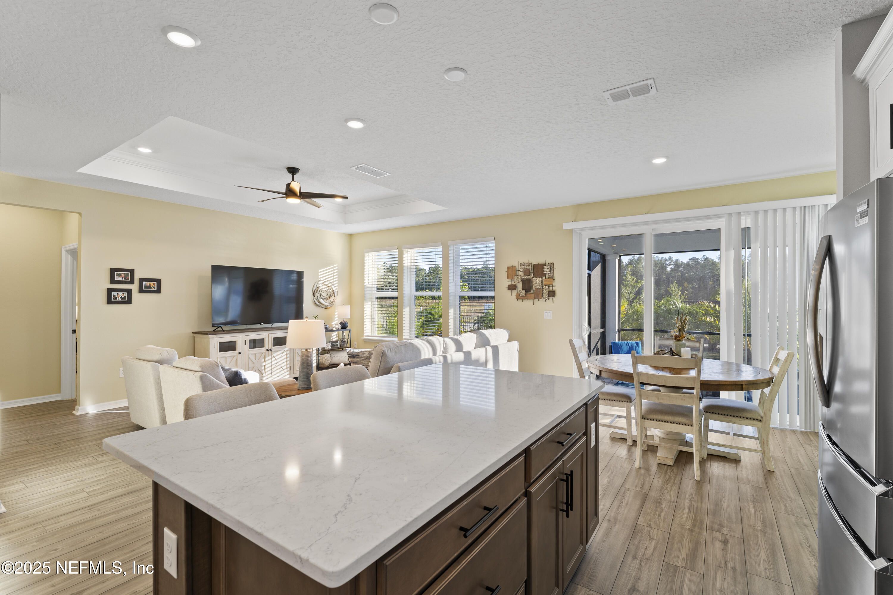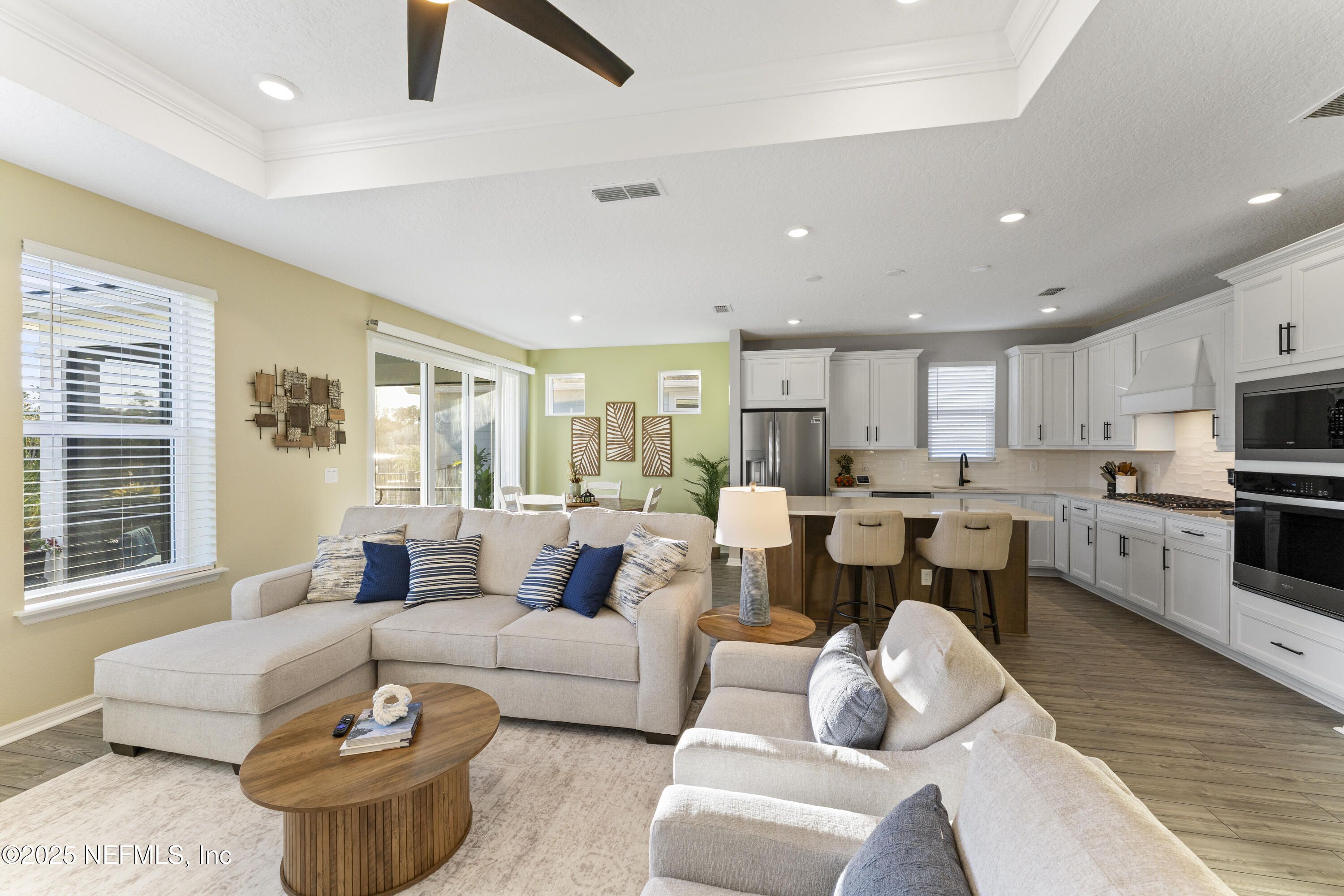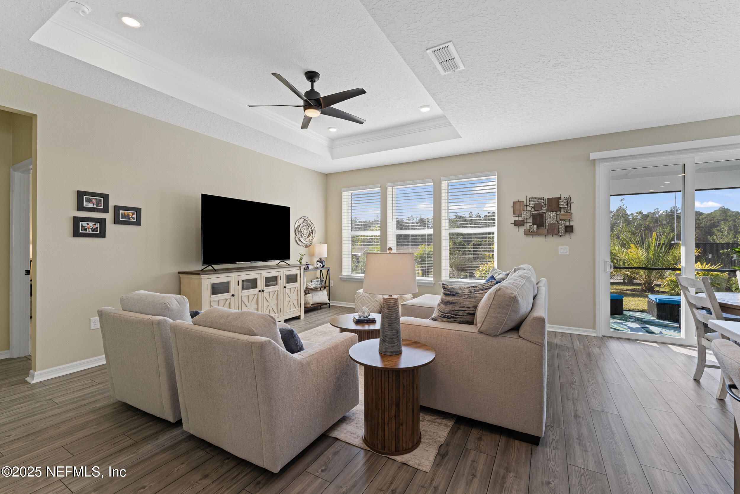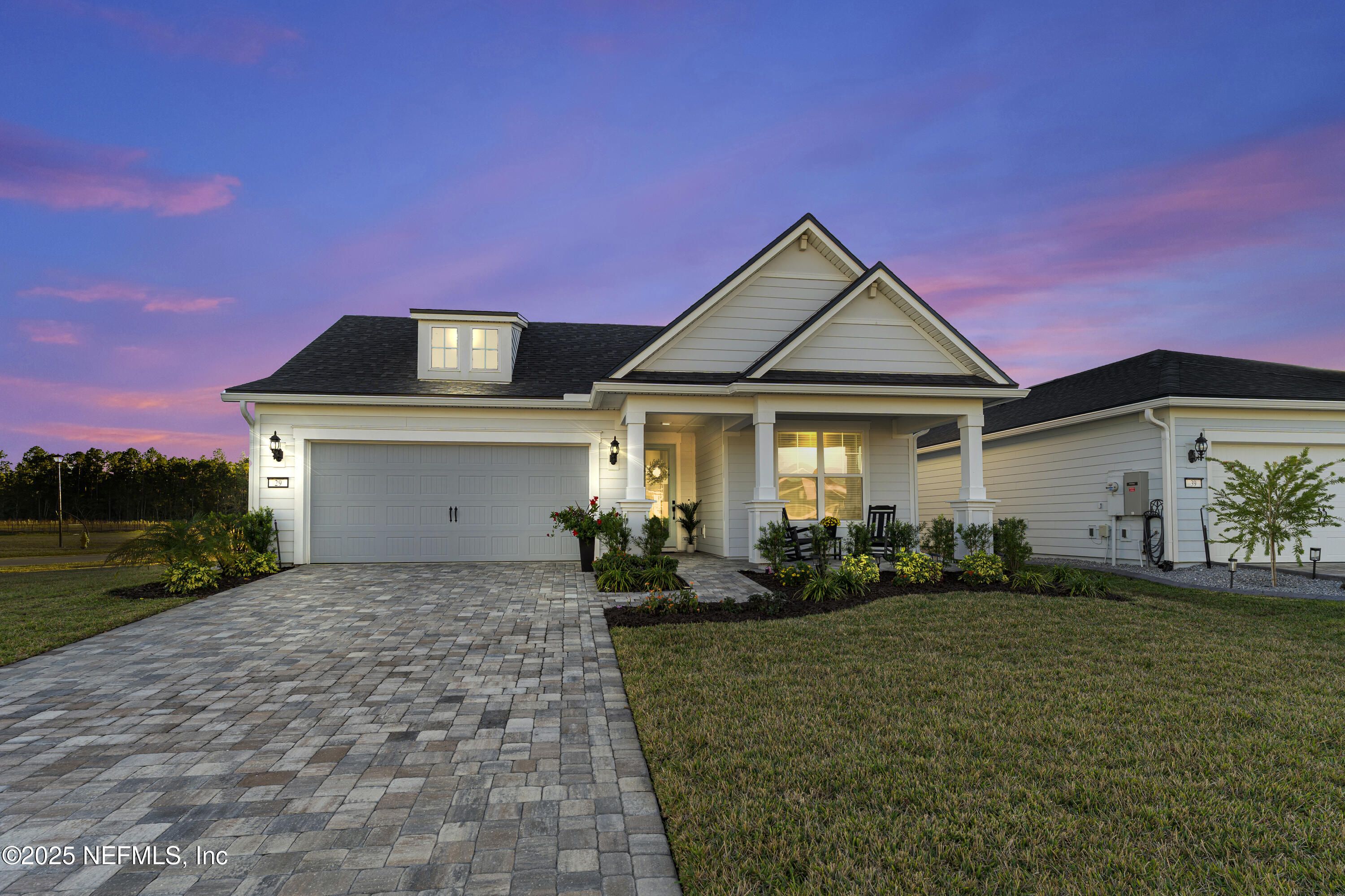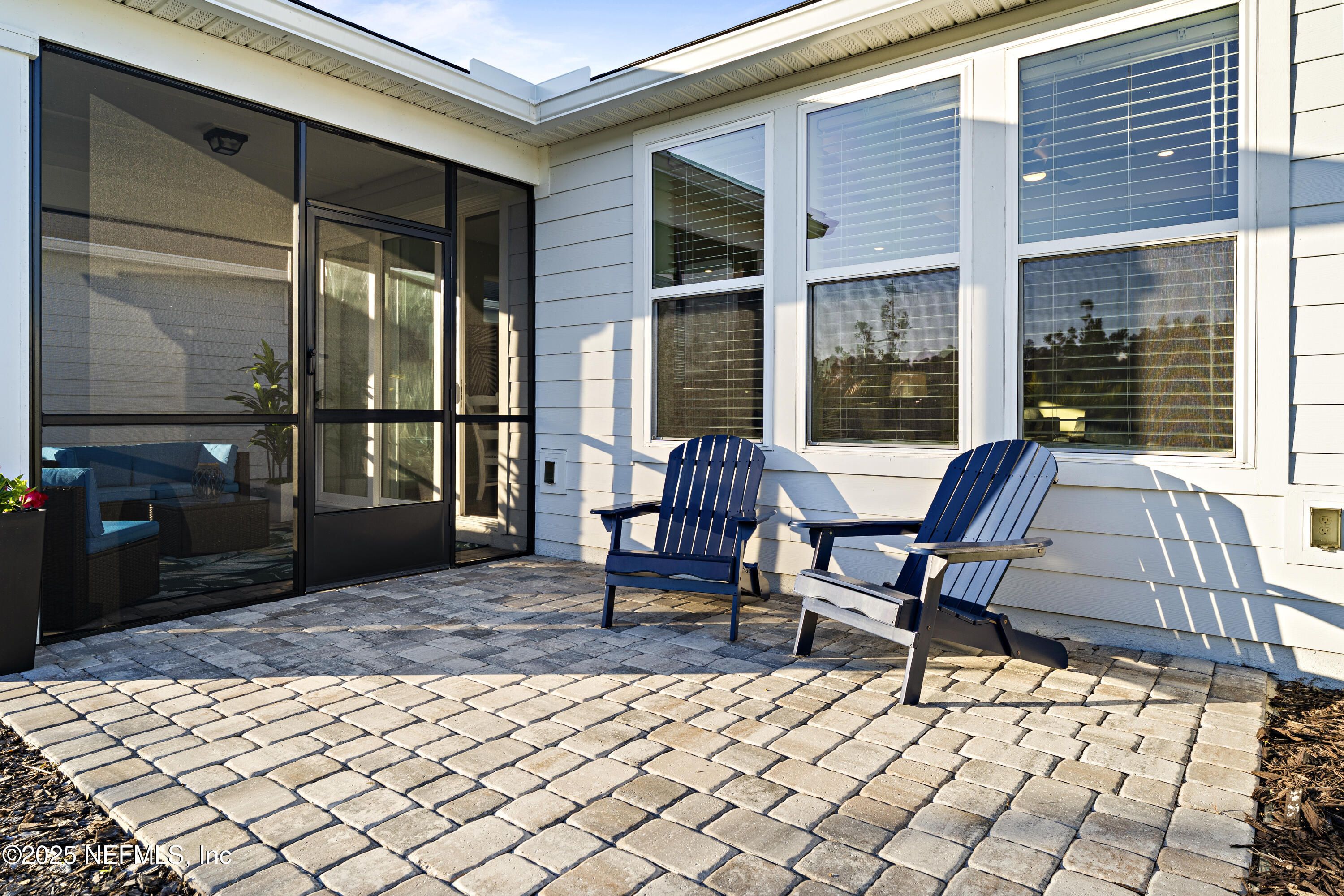 This beautifully designed Pulte Prosperity floor plan sits on a premium corner lot and offers 2 bedrooms, 2 baths, and a versatile flex room ideal for an office, gym, or potential 3rd bedroom. Surrounded by lush landscaping, the home provides excellent privacy while being steps from resort-style amenities including a pool, fitness center, pickleball courts, and a dog park. The gourmet kitchen features stainless appliances, 42'' soft-close cabinets, quartz countertops, and a sleek white backsplash, while luxury vinyl plank flooring flows through the main living areas. Pocket sliding doors open to a screened lanai with peaceful pond views, creating seamless indoor/outdoor living. The owner's suite offers a large walk-in shower, dual-sink vanity, and a spacious walk-in closet. Furniture is negotiable, making this a move-in-ready home where you can enjoy the exceptional Summer Bay lifestyle. Ideal location, close to the highway, major shopping, including the St. Augustine Outlets, Publix, Costco, and Home Depot.