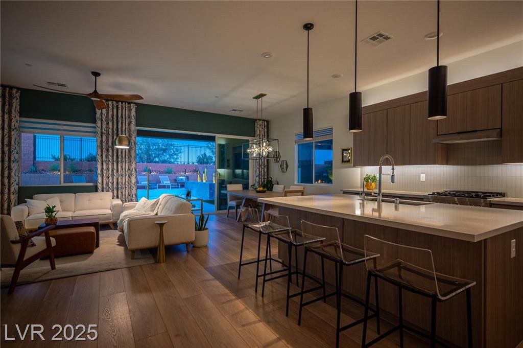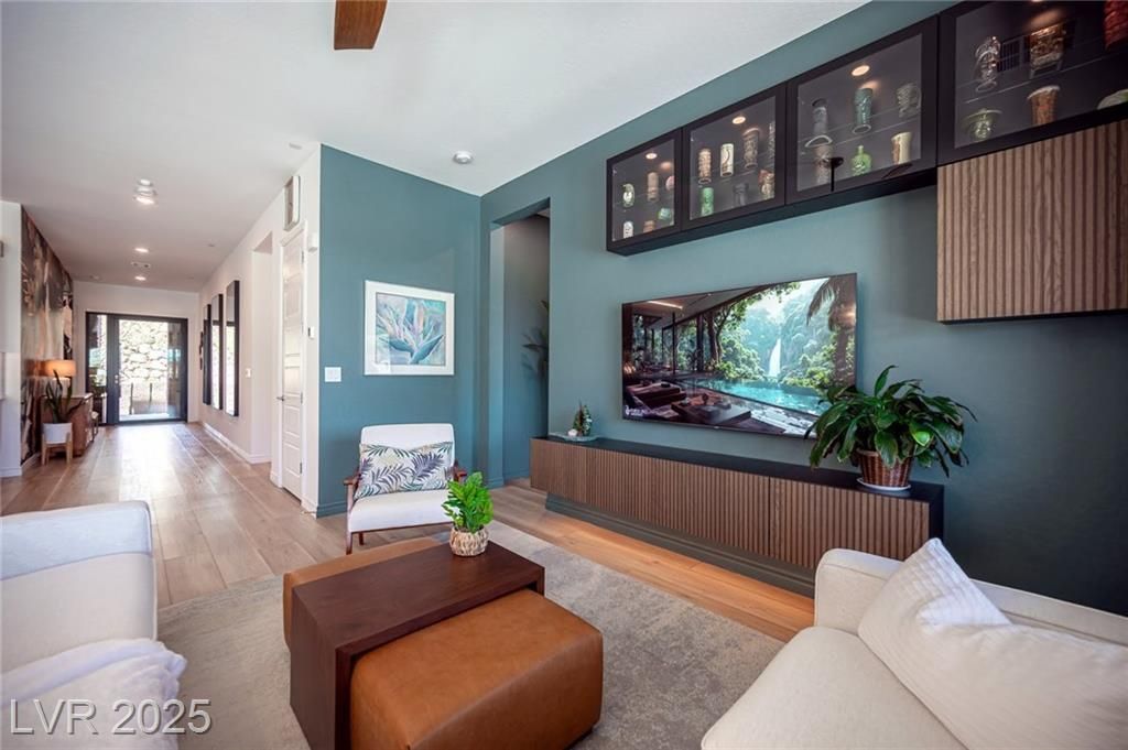 Highly Upgraded Move-In Ready Modern Single-Story Home! Contemporary 4-bed, 3-bath home in the gated Reverie at Lake Las Vegas. Features a private Next Gen suite and over $250K in upgrades, blending luxury and functionality. Enter through a 66-inch glass front door into a spacious open layout with 10-ft ceilings. Designer accent walls, premium flooring, and flat-panel kitchen cabinetry offer a model-home look. The chef’s kitchen includes high-end Z-Line appliances and a dual fuel 240V/gas range. Step outside to a custom front and backyard with a resort-style pool, 5-ft sheer descent waterfall, lounge areas, and panoramic lake views. Lake Las Vegas is a 320-acre, golf-cart-friendly master-planned community with water sports, dining, shopping, and entertainment. Recently voted Best Master Planned Community in Las Vegas. Don’t miss this opportunity—schedule your private tour today and discover the elevated lifestyle that Lake Las Vegas has to offer.