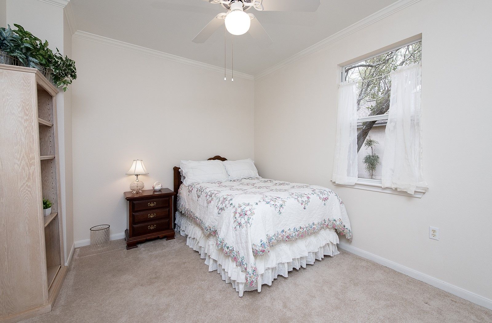 Great outdoor living awaits at 290 Whispering Wind in Sun City Georgetown home featuring 1,593 sq ft, 2 bedrooms plus an office, and a backyard designed for relaxing and entertaining with a covered patio and extended flagstone patio. Home includes 2 bay windows, glazed kitchen cabinets, and crown molding throughout home. Enjoy relaxing on the welcoming front porch shaded by mature trees. The backyard is thoughtfully designed for outdoor enjoyment and entertaining, featuring a covered patio that extends to a beautiful flagstone patio, creating a spacious area ideal for gatherings with family and friends. The yard is landscaped with walkways and flower beds and minimal grass, offering an attractive and low-maintenance outdoor setting. Located in the highly desirable Sun City community, residents enjoy resort-style amenities including golf courses, fitness centers, swimming pools, walking trails, clubs, and a wide variety of social activities.