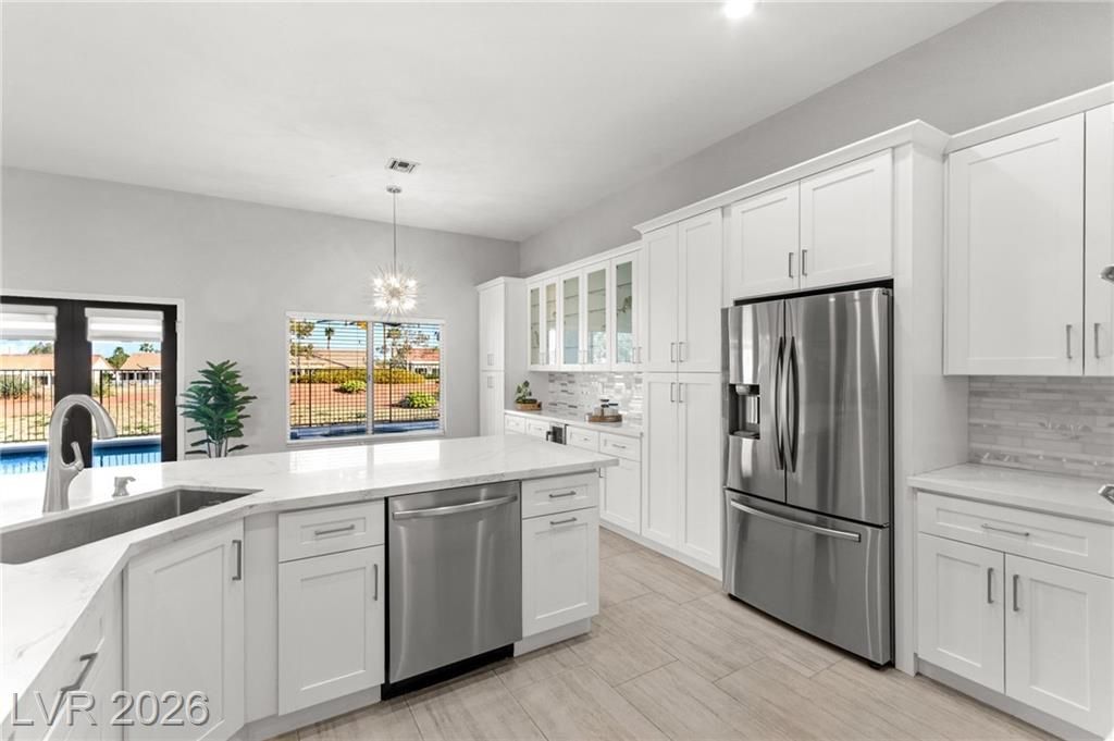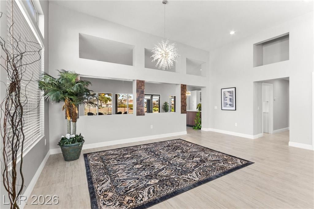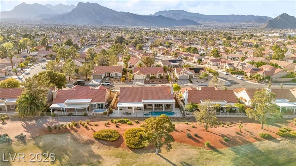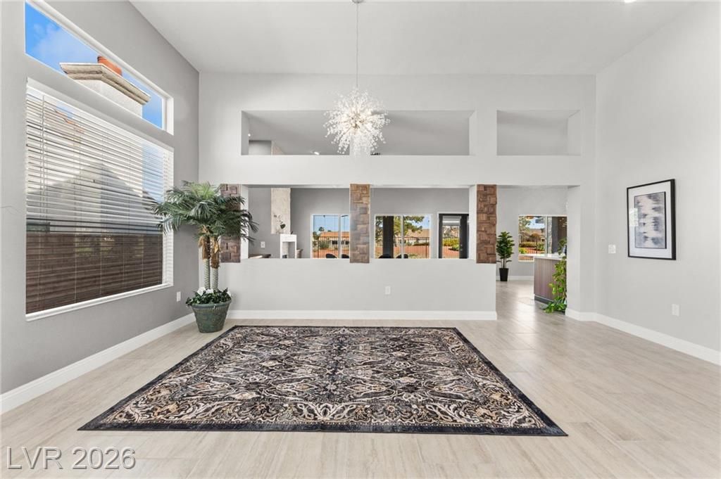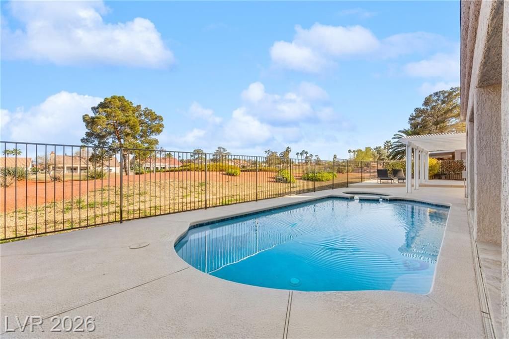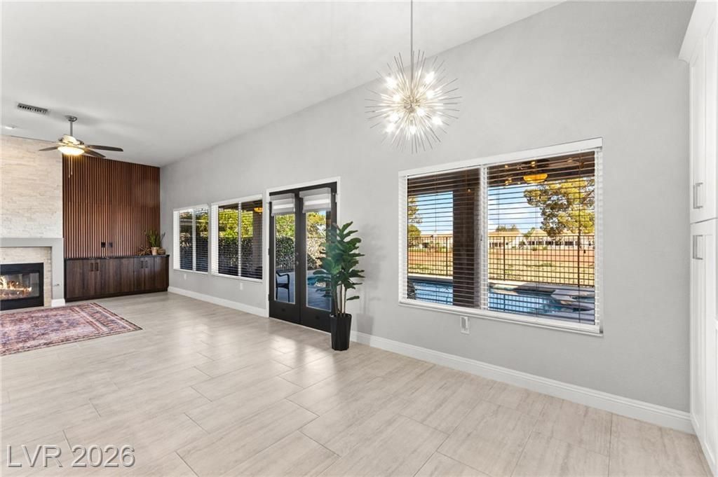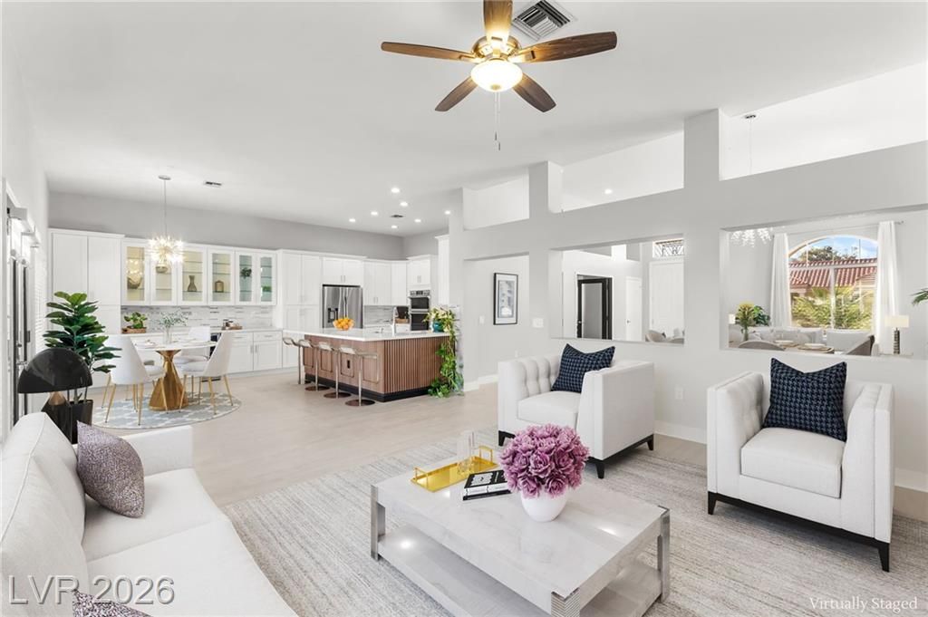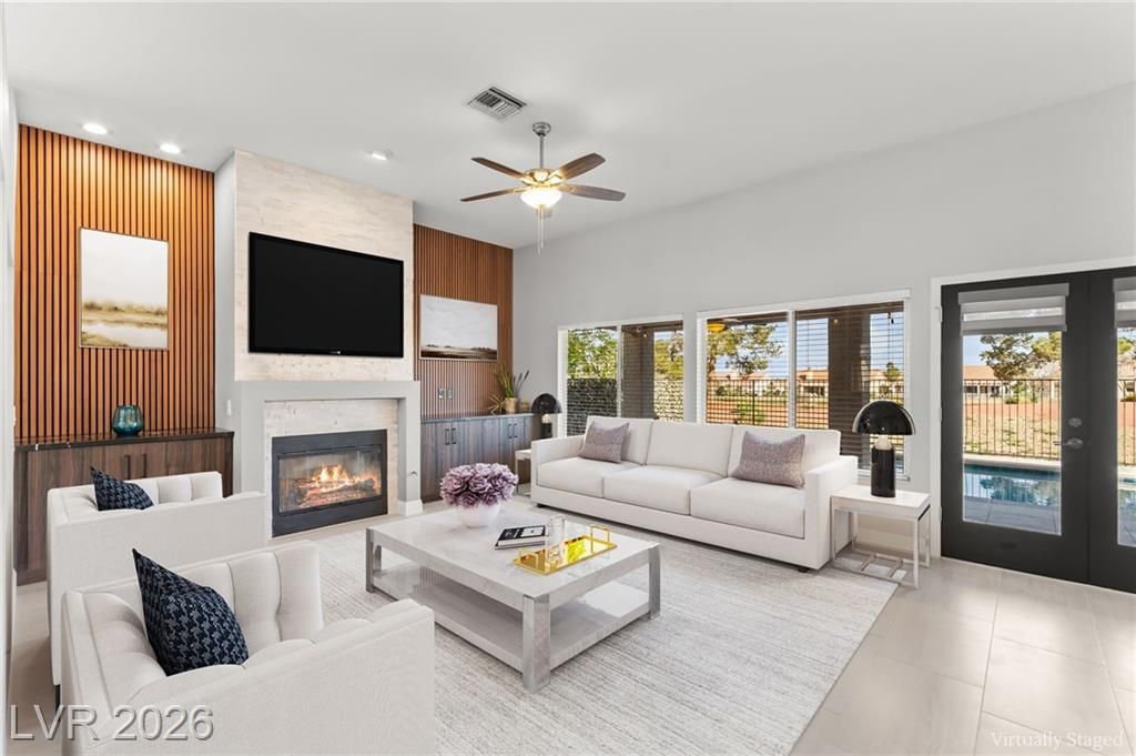 Beautifully renovated 3 bedroom home with stunning golf views offering modern luxury throughout. The chef’s kitchen features 42” shaker cabinets with glass accents, Calcutta quartz countertops, , and top of the line stainless steel appliances including double ovens and a gas cooktop. Living and family rooms feature marble fireplaces, custom walnut built ins, and designer lighting. The spacious primary suite offers backyard access and a spa inspired bath with jetted tub, frameless shower, dual sinks, and custom walk in closet. Enjoy a private backyard oasis with a saltwater pool, spa, and covered patio. Additional upgrades include 32” tile flooring, 5” baseboards, LED lighting, epoxy garage floor, storage cabinets, new water heater, water softener, and tile roof with new underlayment in the last two years. Sun City Summerlin offers 3 golf courses, 5 indoor and outdoor pools, 4 fitness centers, 3 restaurants, and tennis and pickleball courts. This is not just a home, it’s a lifestyle!