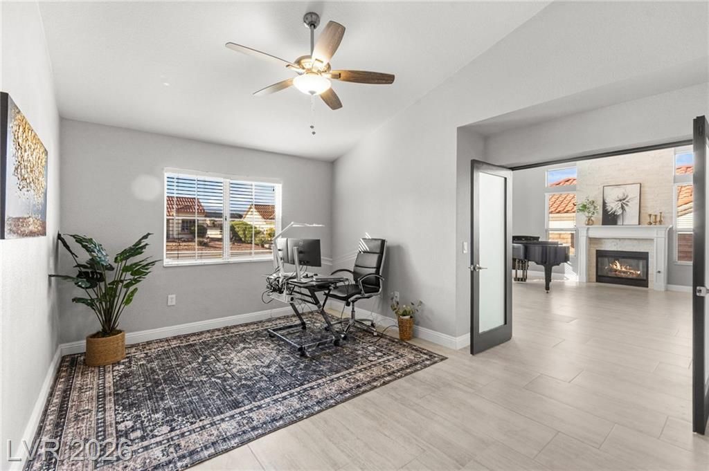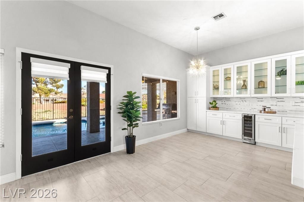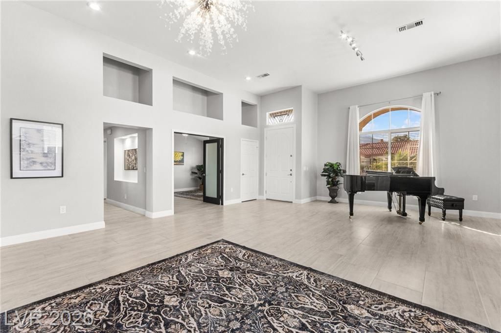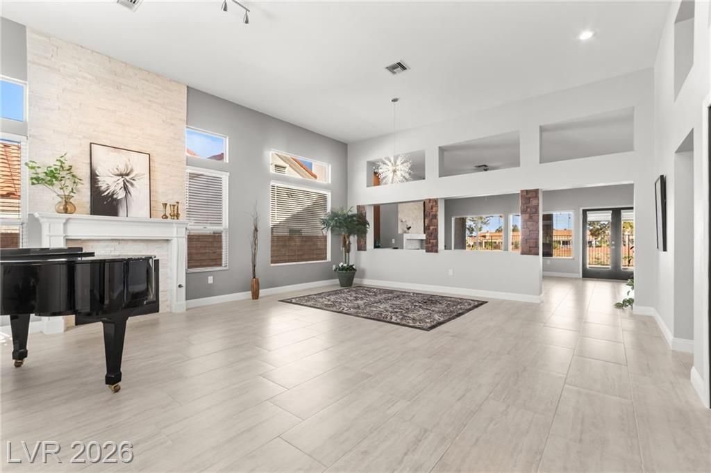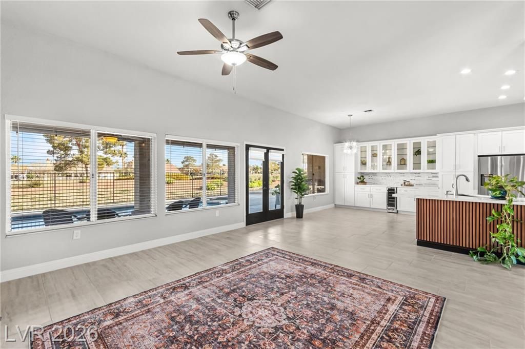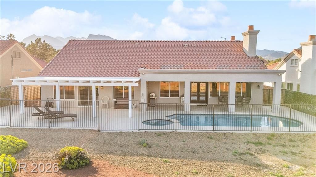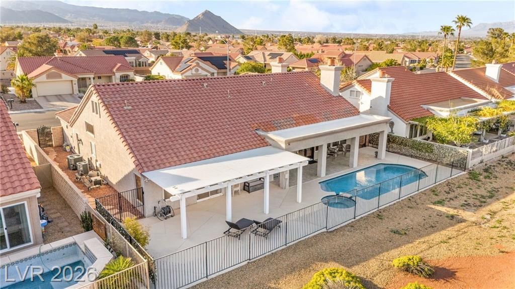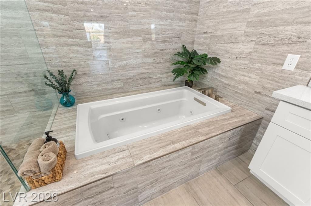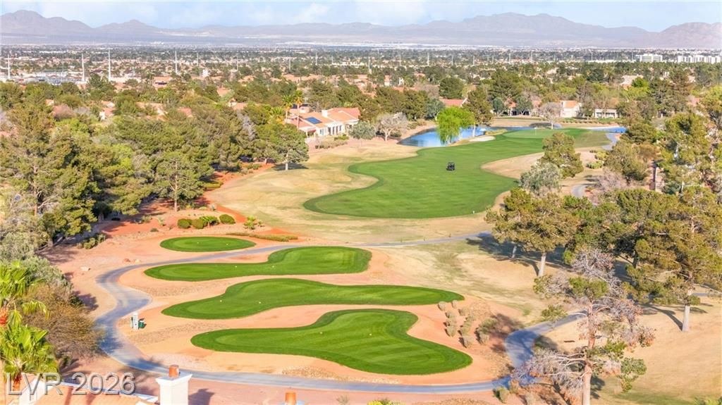 Beautifully renovated 3 bedroom home with stunning golf views offering modern luxury throughout. The chef’s kitchen features 42” shaker cabinets with glass accents, Calcutta quartz countertops, , and top of the line stainless steel appliances including double ovens and a gas cooktop. Living and family rooms feature marble fireplaces, custom walnut built ins, and designer lighting. The spacious primary suite offers backyard access and a spa inspired bath with jetted tub, frameless shower, dual sinks, and custom walk in closet. Enjoy a private backyard oasis with a saltwater pool, spa, and covered patio. Additional upgrades include 32” tile flooring, 5” baseboards, LED lighting, epoxy garage floor, storage cabinets, new water heater, water softener, and tile roof with new underlayment in the last two years. Sun City Summerlin offers 3 golf courses, 5 indoor and outdoor pools, 4 fitness centers, 3 restaurants, and tennis and pickleball courts. This is not just a home, it’s a lifestyle!