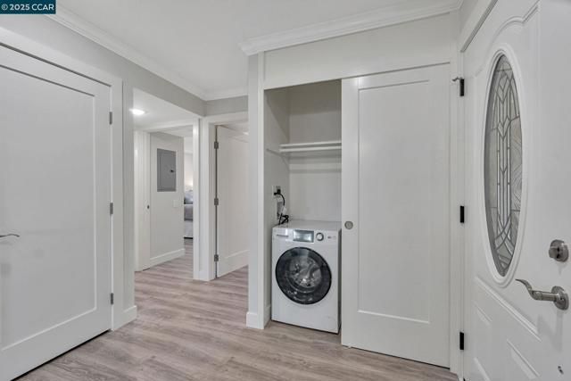 OVER $50K in PRICE IMPROVEMENT!! Totally TURN-KEY! Furniture included, if desired. Corner end-unit, Sonoma Wrap model offers quiet, privacy & ample space, inside & out. Fall in love with this stunning One-of-a-Kind, custom-designed remodel with a modern flair! 2 BD/2 BA, plus large-enclosed den, +/- 1,150sq ft. Come by to view this open, spacious & bright home! New doors, new windows, new hardware & decorative lighting, recessed lighting & crown molding everywhere, new paint, Nest thermostat & much more...Huge window added in dining area & another in kitchen, opening up to nature. Kitchen features new SS appliances plus wine refrigerator for easy entertaining. Gorgeous lunar quartz countertops & peninsula, with shaker cabinets that surround the kitchen to dining areas for lots of space/storage. Living room has sleek built-in electric fireplace to relax. Need more cabinets for your books? You got it! Custom den expansion created to use as your office or hobby room. Primary bath is beautifully designed with large, tiled walk-in shower & wide dual-sink vanity. Inside W/D combo gives you more time to go have fun at Rossmoor's 55+ active senior adult community. Enjoy golf courses, tennis & pickleball courts, 3 swimming pools & fitness center, restaurant, clubhouse, event hall...