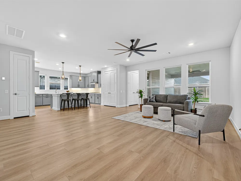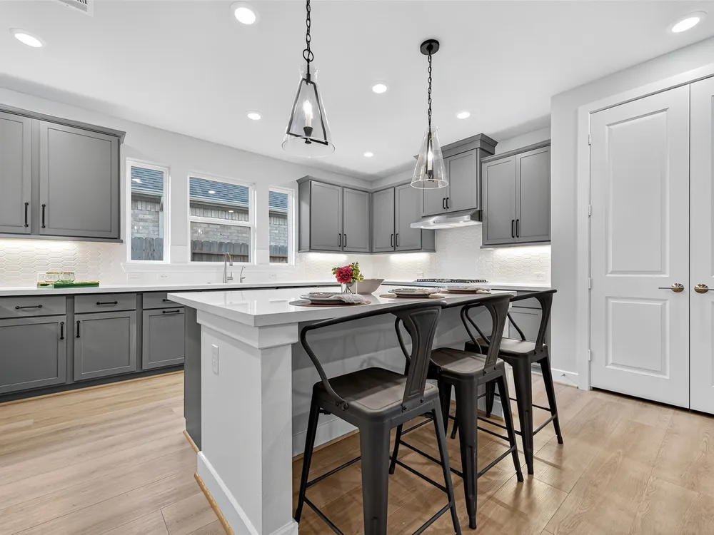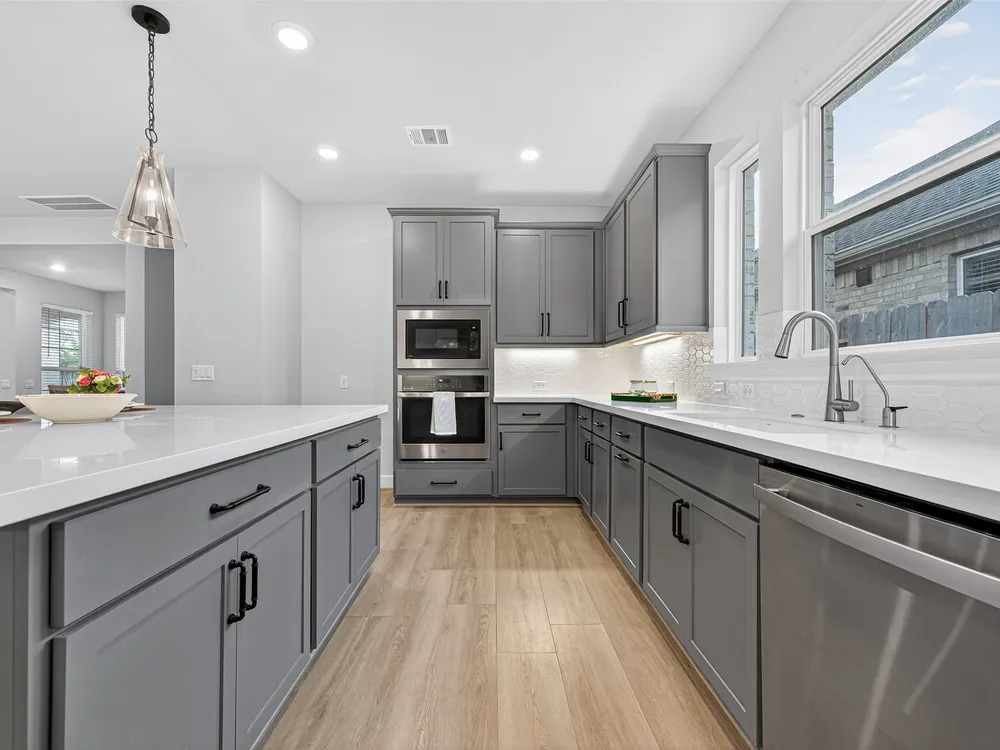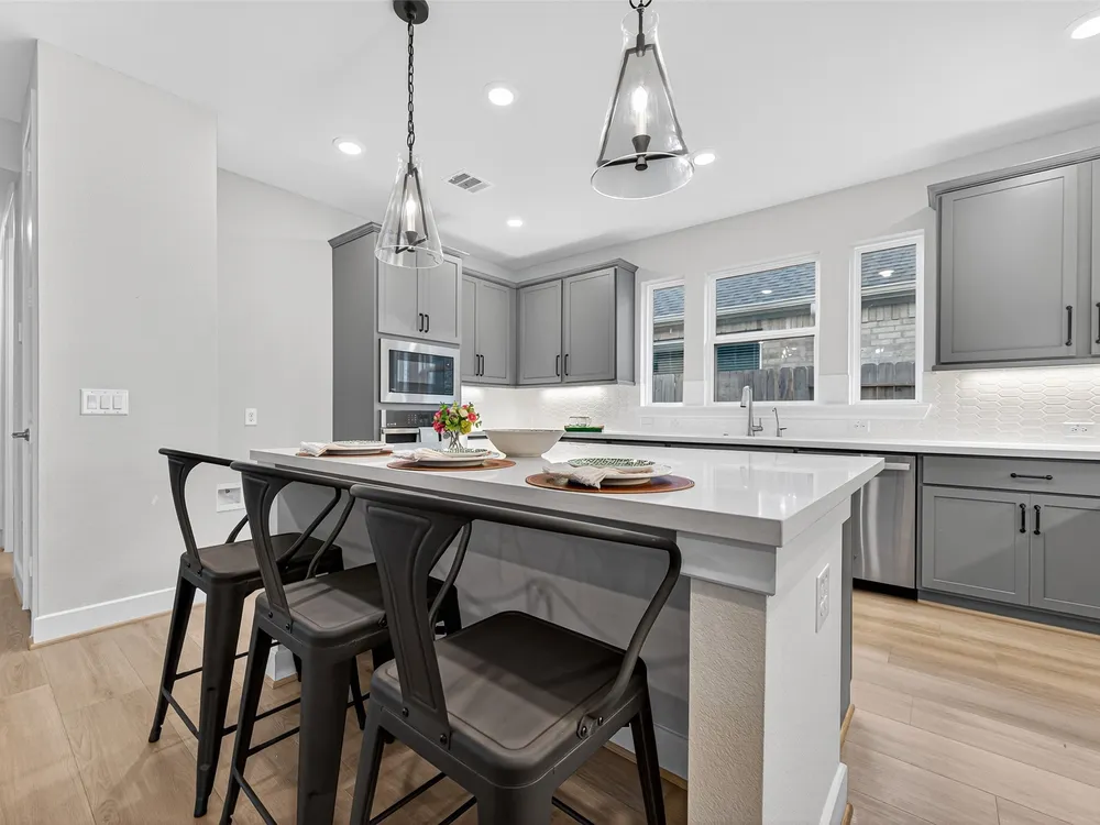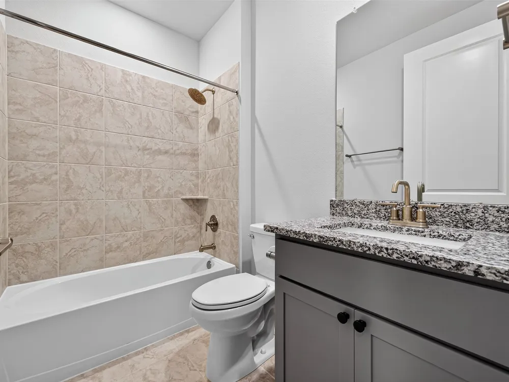 - Breakfast Bar, Double Vanity, High Ceilings, Kitchen Island, Kitchen/Family Room Combo, Pantry, Quartz Countertops, Tub Shower, Window Treatments, Ceiling Fan(s)