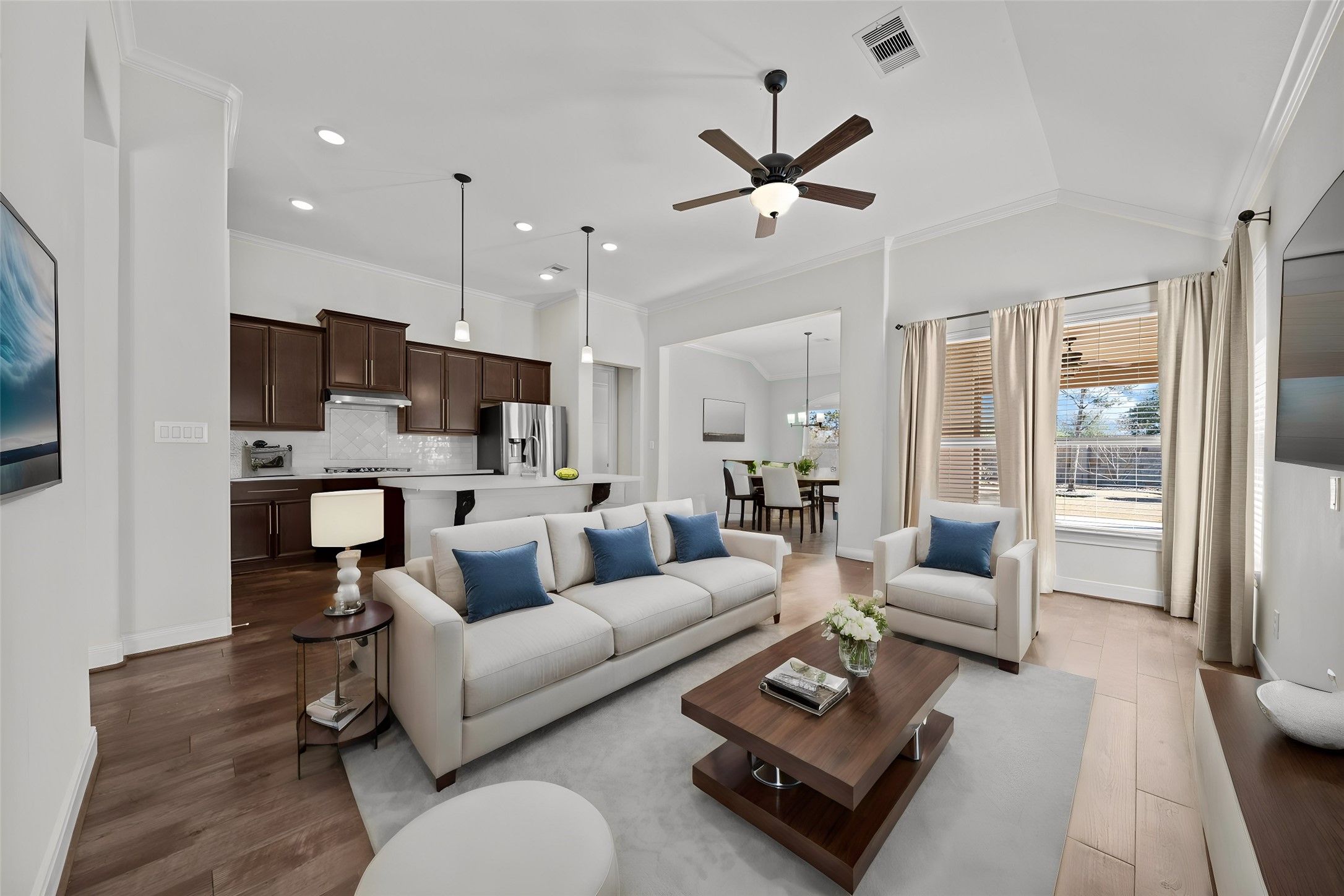 - Breakfast Bar, Crown Molding, Double Vanity, Granite Counters, High Ceilings, Kitchen Island, Kitchen/Family Room Combo, Pantry, Makeup/Vanity Space, Ceiling Fan(s)