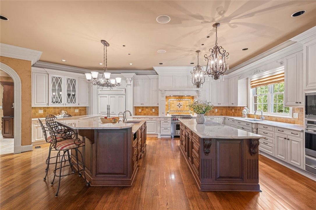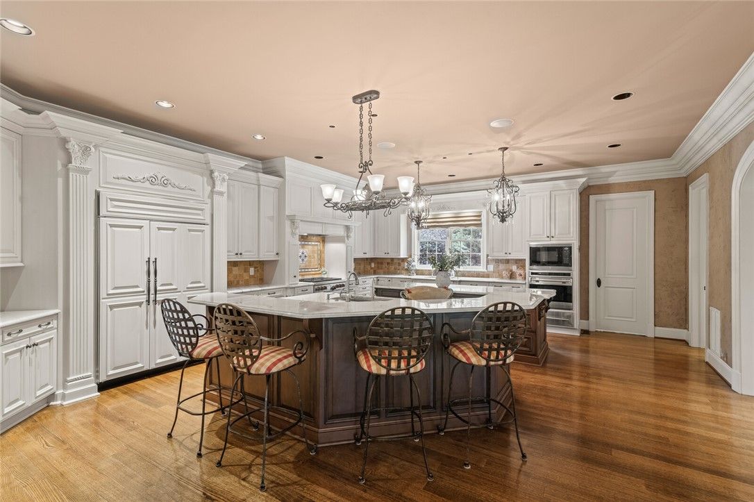 Where architectural artistry meets serene waterfront living, this custom estate on Kitchum’s Pond is a triumph of design and detail. A dramatic enfilade layout, sculptural helix staircase, and soaring ceilings create striking sightlines and timeless elegance. Luxurious finishes — porcelain, travertine, quartzite, and limestone — elevate every space, from the bespoke kitchen to the spa-like primary suite. French doors throughout open to an expansive terrace featuring an outdoor kitchen and offering views of the manicured grounds, which slope gently to the water’s edge. Upstairs, three ensuite bedrooms and a media/pub room offer comfort and style, while an elevator connects all levels, including a finished attic. Two private offices, sunroom, and a 3-car garage complete this one-of-a-kind retreat designed for everyday luxury and exceptional living.