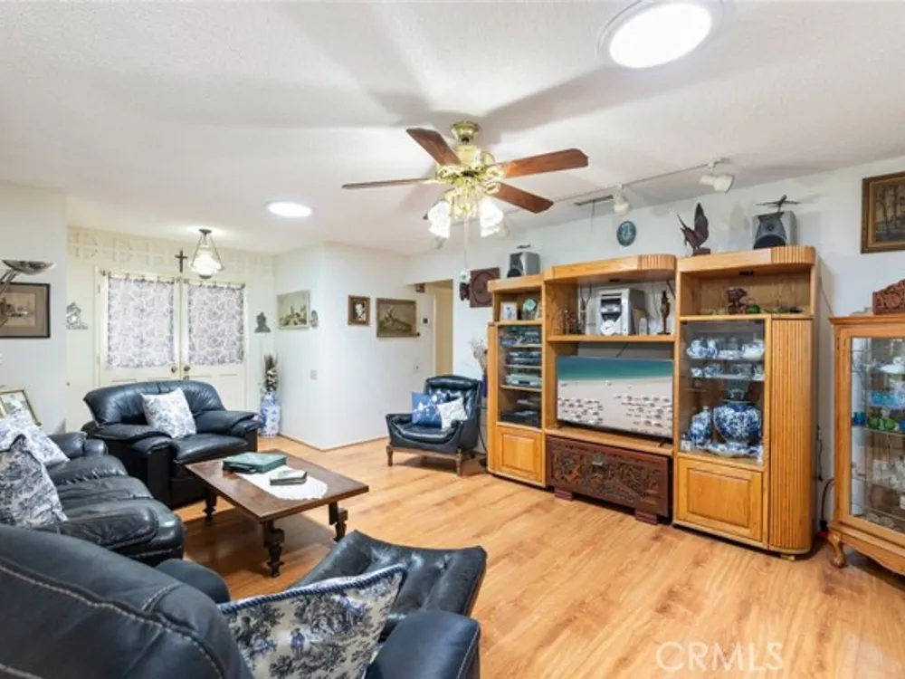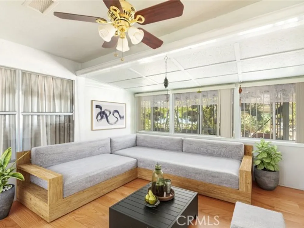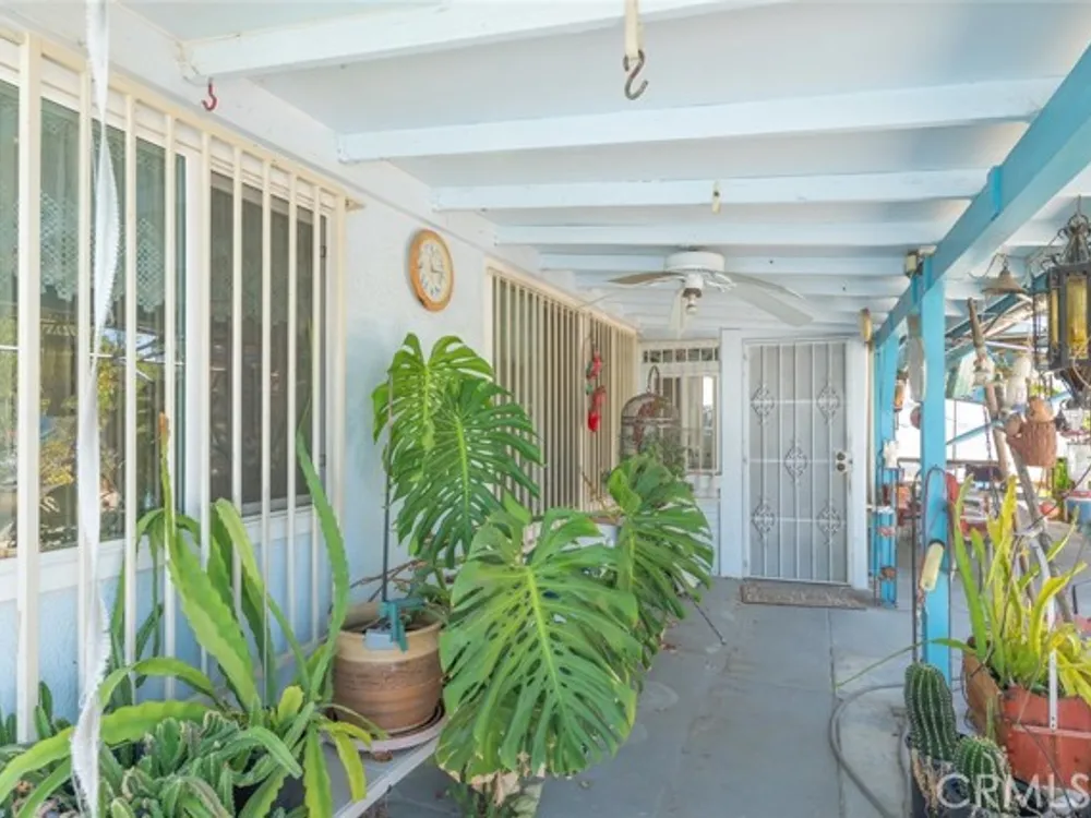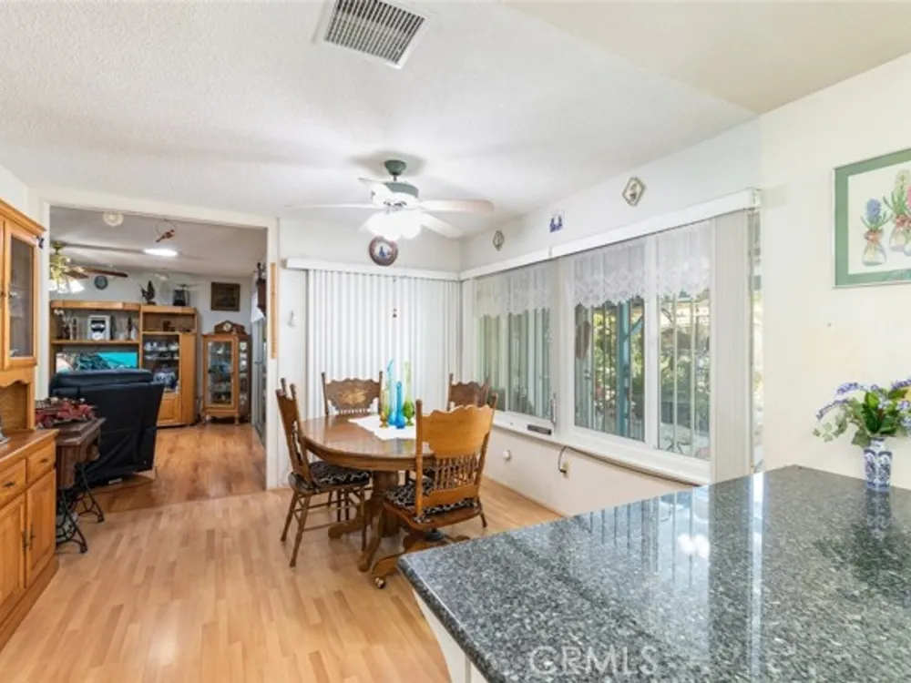 Welcome to this charming 2-bedroom, 2-bath home located in the highly desirable 55+ community of Sun City Civic Association in Menifee featuring gated RV parking, LOW taxes, and LOW HOA. From the moment you arrive, the inviting double-door entry sets the tone for the warm and welcoming atmosphere inside. Step into a thoughtfully designed layout featuring good-sized bedrooms, ample storage throughout, and a light-filled sunroom that extends the living space and creates the perfect spot to relax with a morning cup of coffee or enjoy an afternoon with friends. Beyond the sunroom, a covered patio runs the entire length of the home, offering a seamless transition to the backyard and plenty of space for outdoor dining, entertaining, or simply taking in the fresh air. The kitchen stands out with its striking dark granite countertops, unique tile backsplash, and generous cabinetry, combining both function and style. Vinyl flooring flows throughout the home—meaning no carpet to worry about—while ceiling fans in nearly every room keep the interiors comfortable year-round. The spacious primary suite offers the convenience of an ensuite bathroom, and a private vanity station. Sitting on a large lot, this property also features gated RV parking, a chain-link fence with privacy slats for a