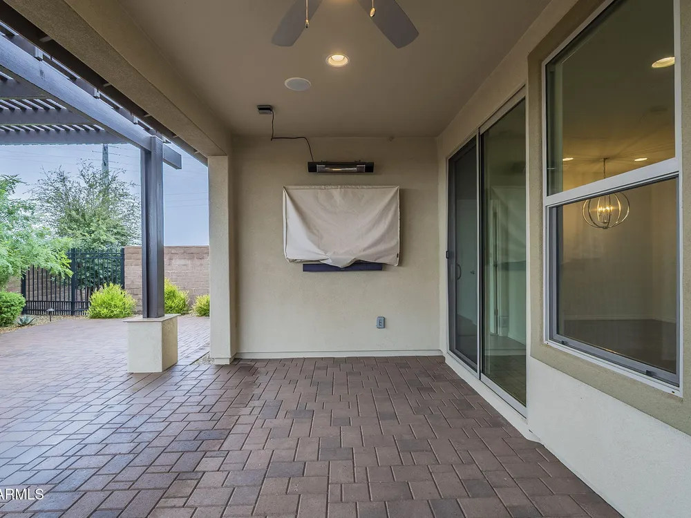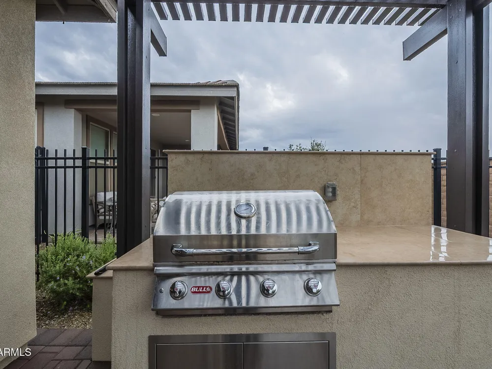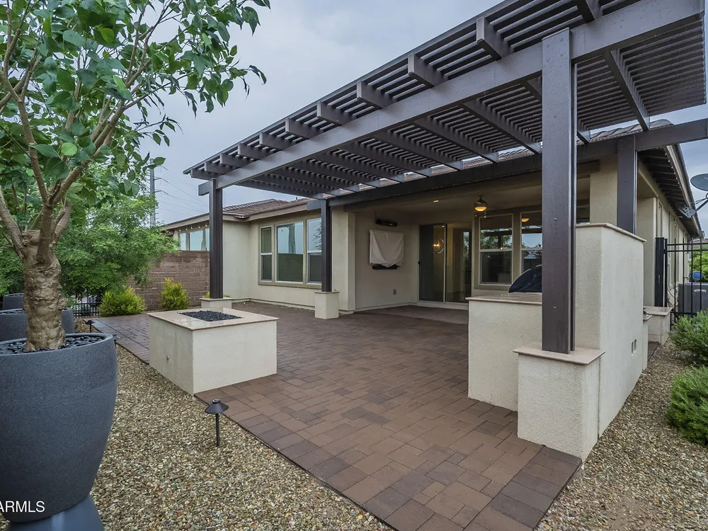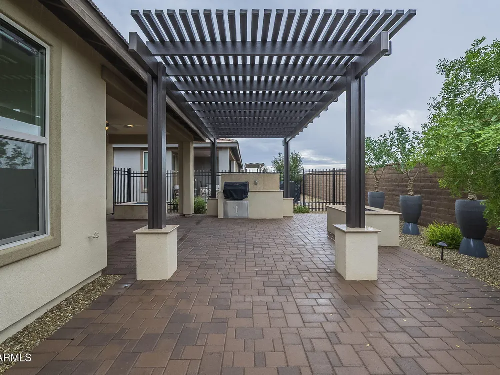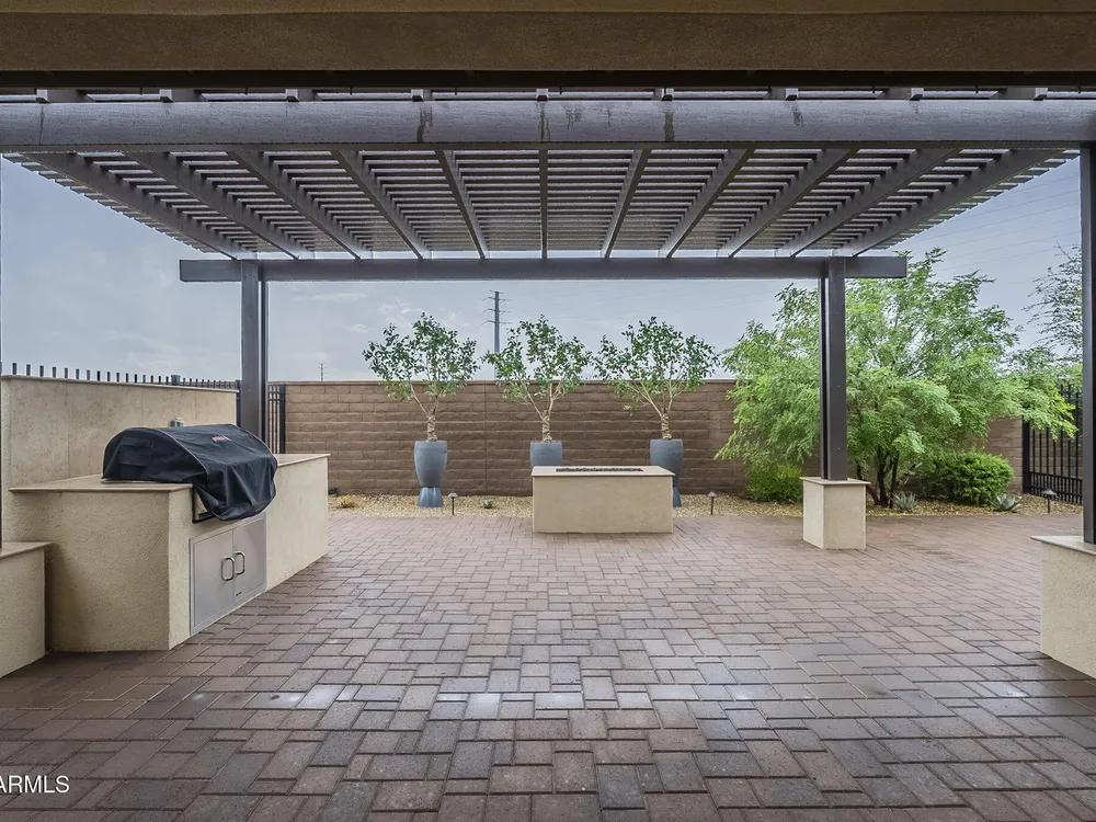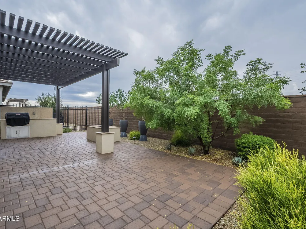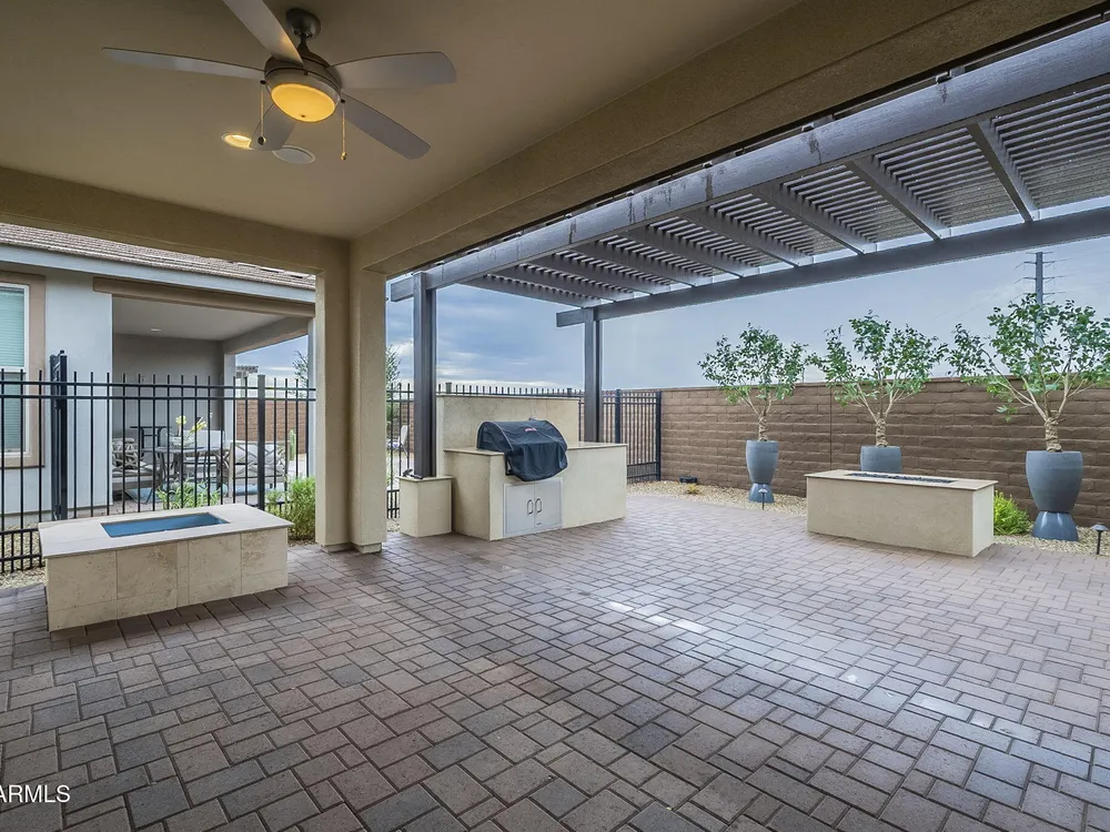 Step Into Your Encanterra Backyard Paradise! Move-in ready 2BR/2BA home with a den featuring a stylish barn door and gourmet kitchen with top-of-the-line appliances. Open, light filled layout flows to the backyard. Feel the misters from the pergola on warm afternoons, fire up the BBQ, watch the water feature sparkle, and enjoy outdoor TV evenings. Golf cart is included for community adventures. Freshly painted home, fully fenced, & low-maintenance yard, makes this the ultimate value. Play pickleball or tennis, unwind by one of the 4 pools or spa, and savor dining at onsite restaurants—resort-style living you can feel every day! Start living The Good Life Today!
