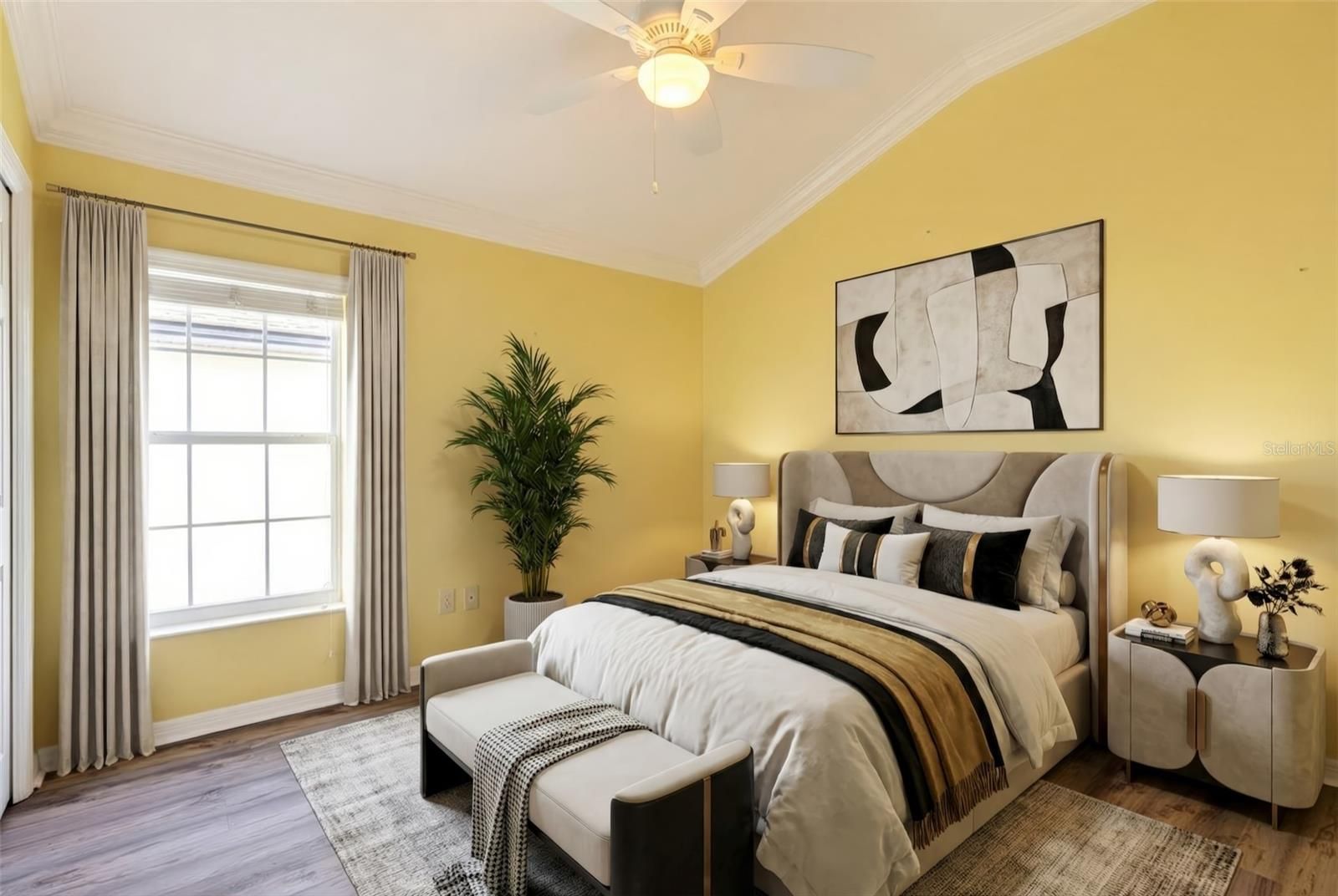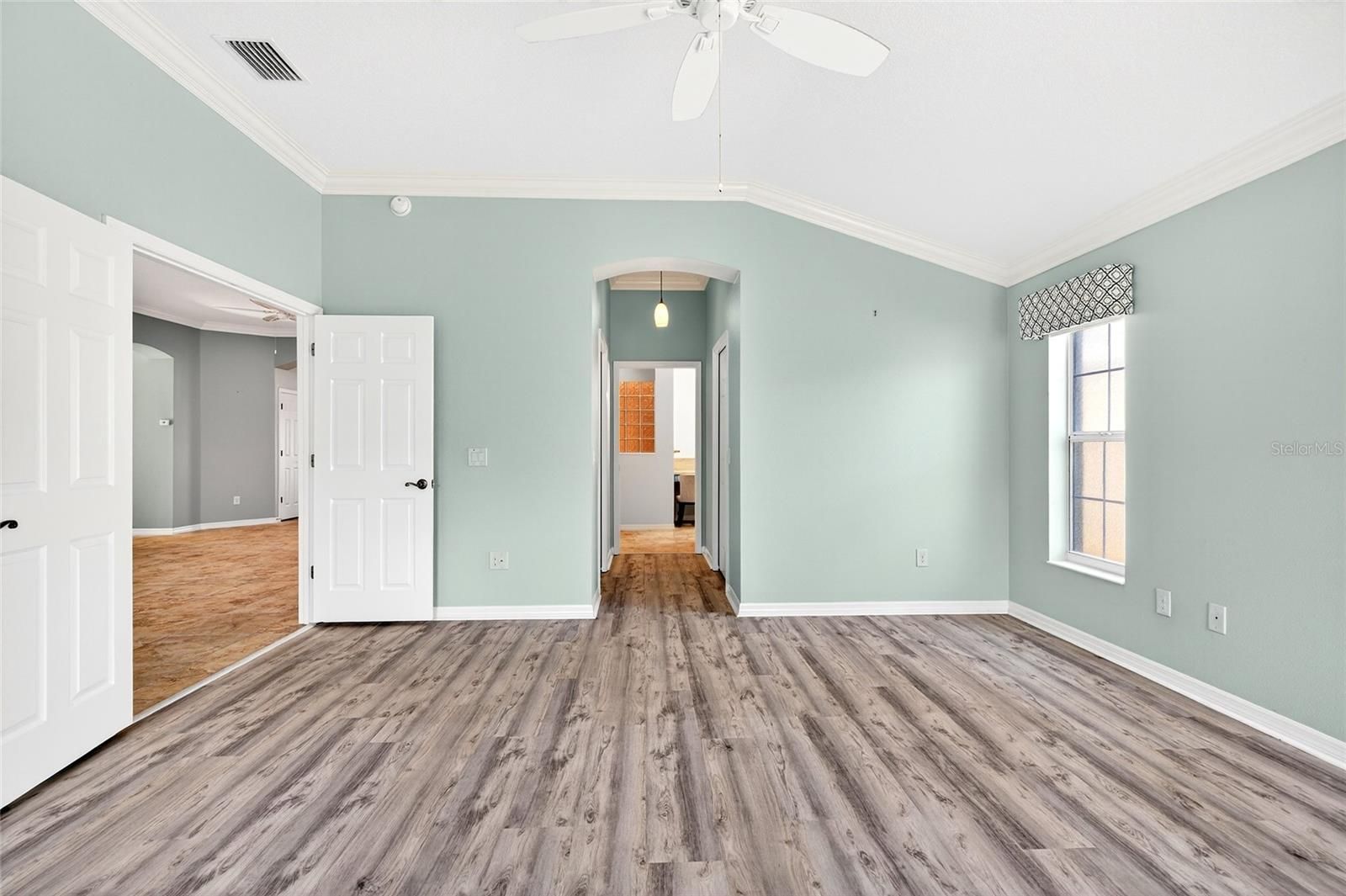 - Ceiling Fan(s), Crown Molding, Eat-in Kitchen, High Ceilings, Living/Dining Room, Open Floorplan, Split Bedrooms, Stone Counters, Thermostat, Tray Ceiling(s), Vaulted Ceiling(s), Walk-In Closet(s), Window Treatments