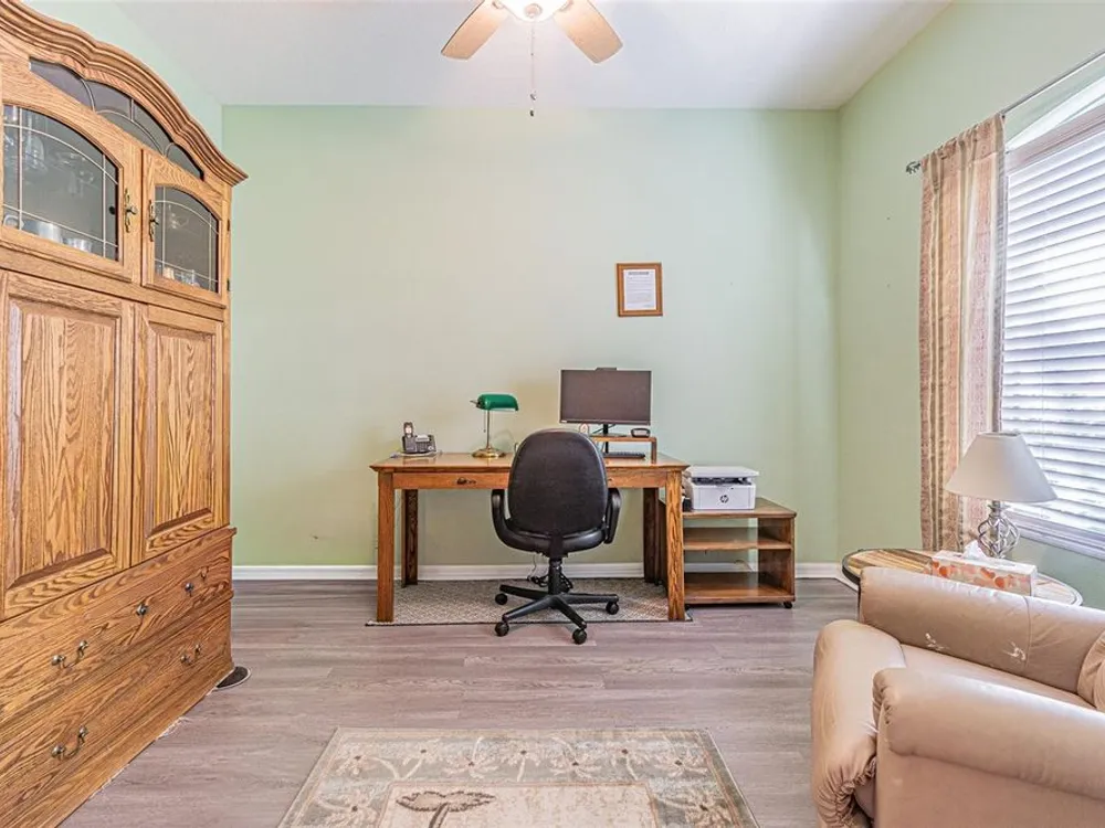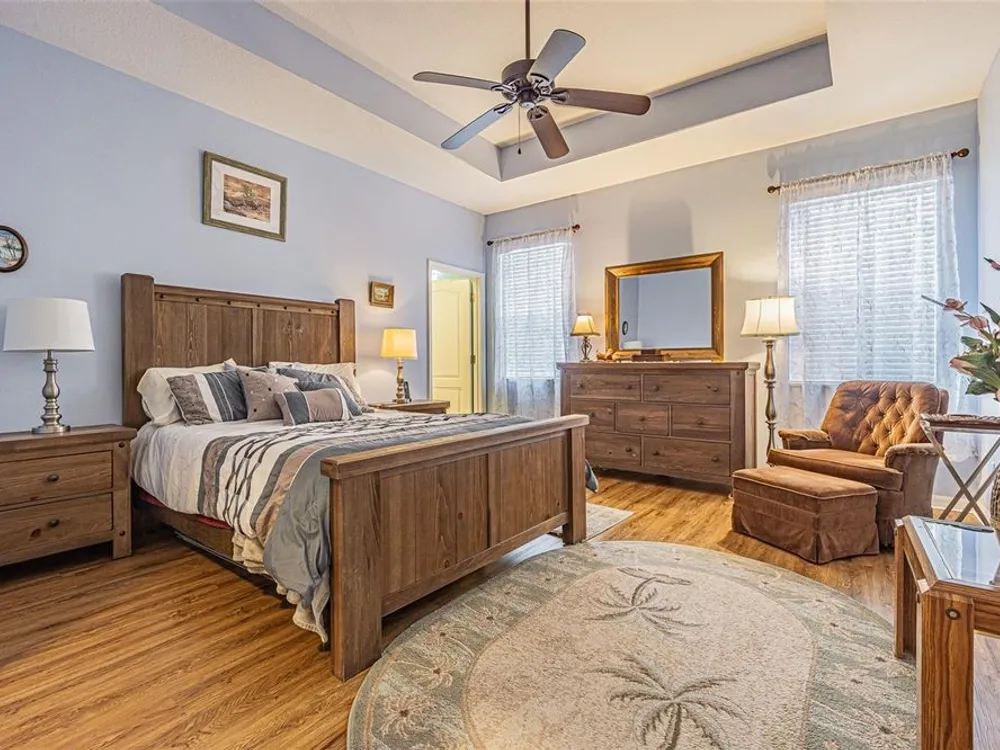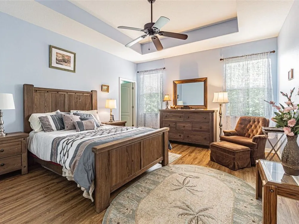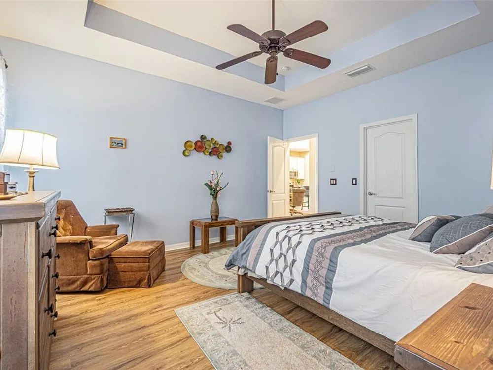 - Ceiling Fan(s), High Ceilings, Kitchen/Family Room Combo, Main Level Primary, Solid-Wood Cabinets, Stone Counters, Thermostat, Tray Ceiling(s), Walk-In Closet(s), Window Treatments